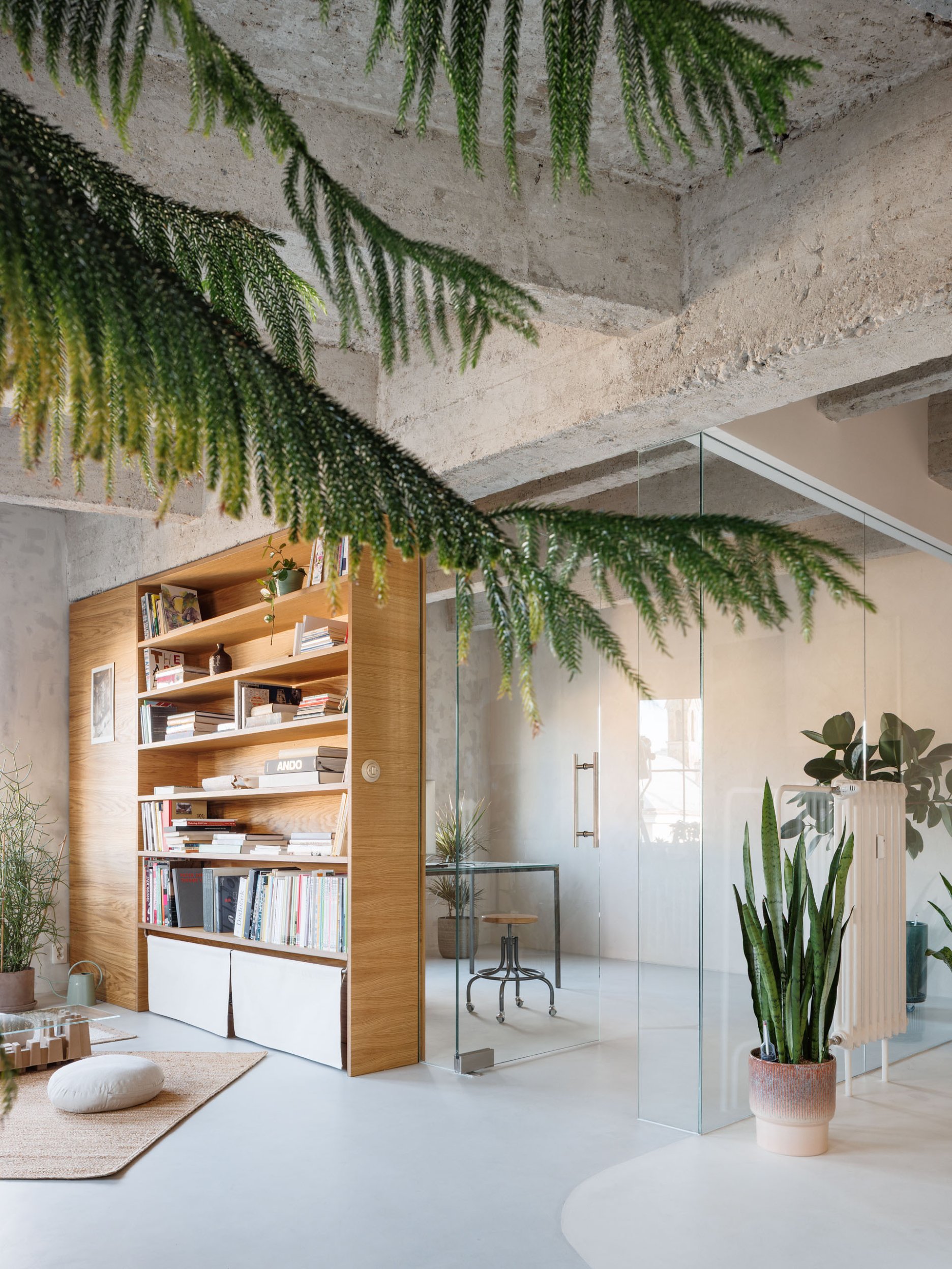 Niektoré z interiérových rastlín (umiestnené na kolieskach) sú tiež použité ako pohyblivé screeny medzi časťami otvoreného priestoru.