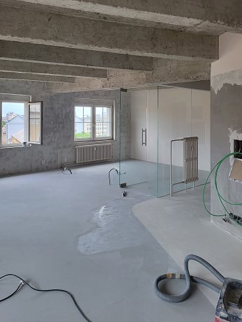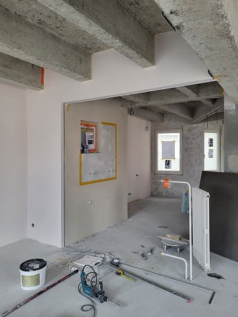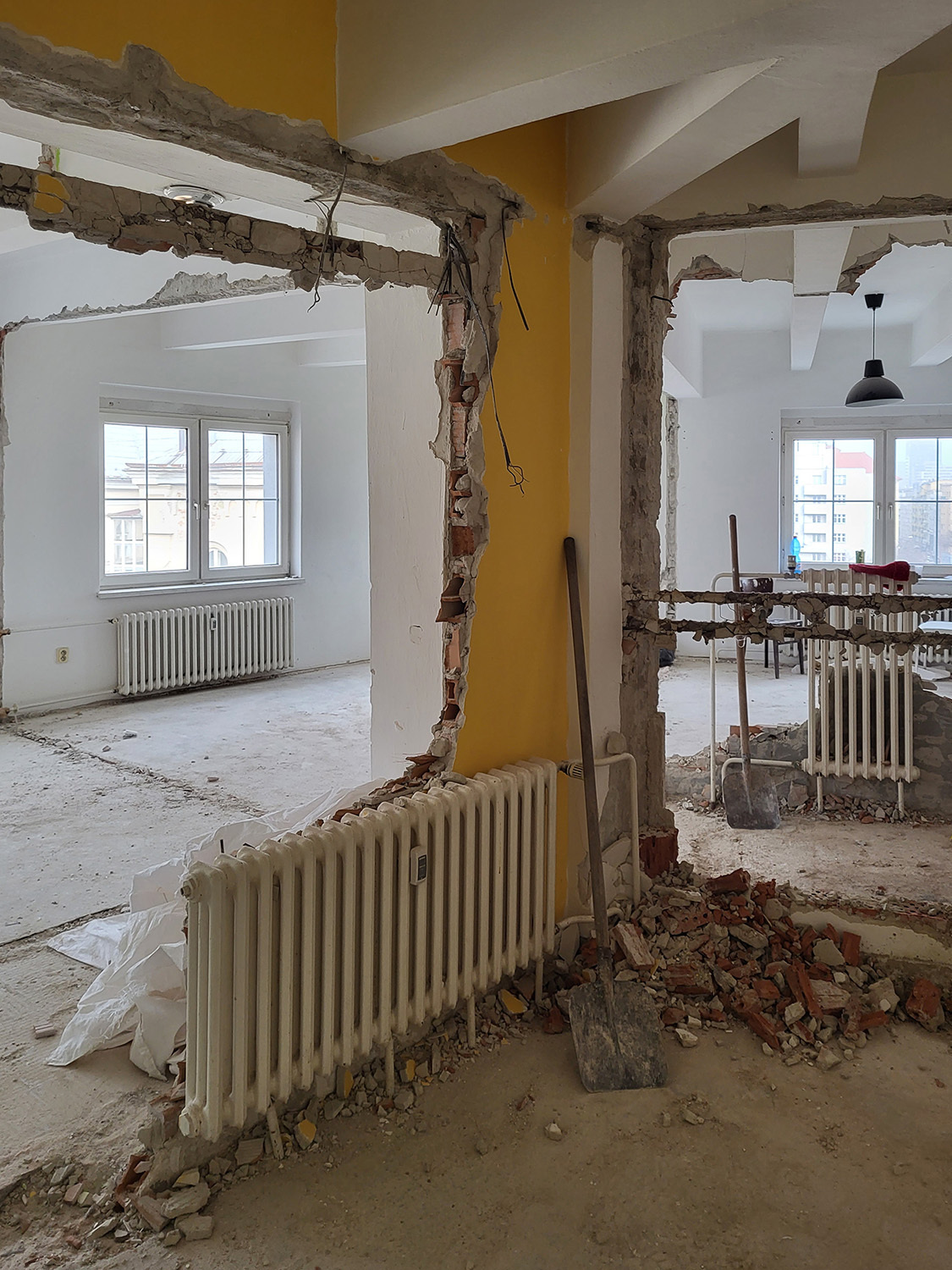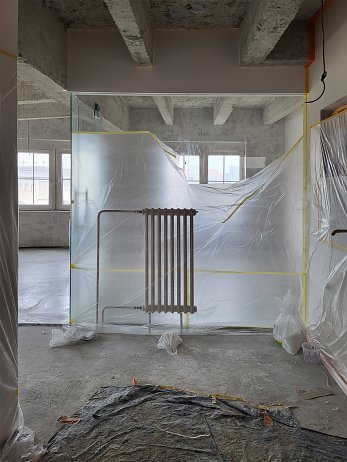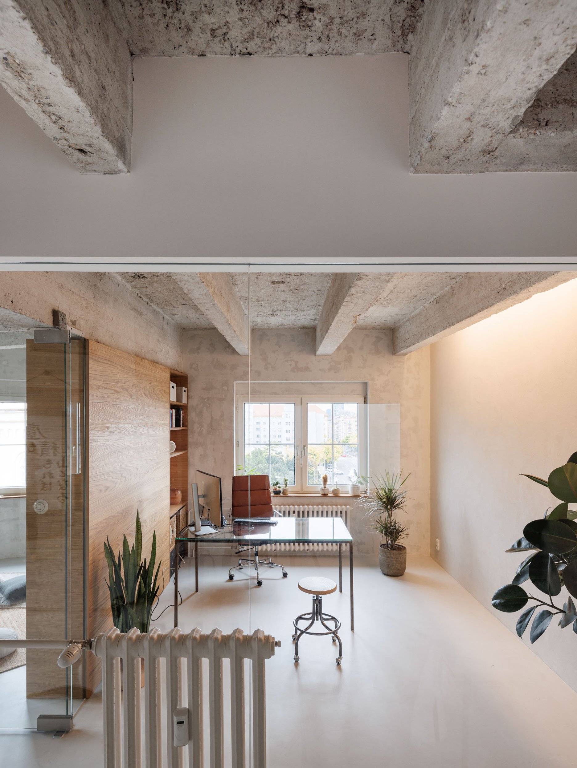 Sklenená priečka oddeľuje (a prepája) kanceláriu a zbytok priestoru. Kontinuita prievlakov zostáva vďaka nej čitateľná. Obojstranná drevená priečka slúži z jednej strany ako úložný priestor pre pracovňu, z druhej ako knižnica.