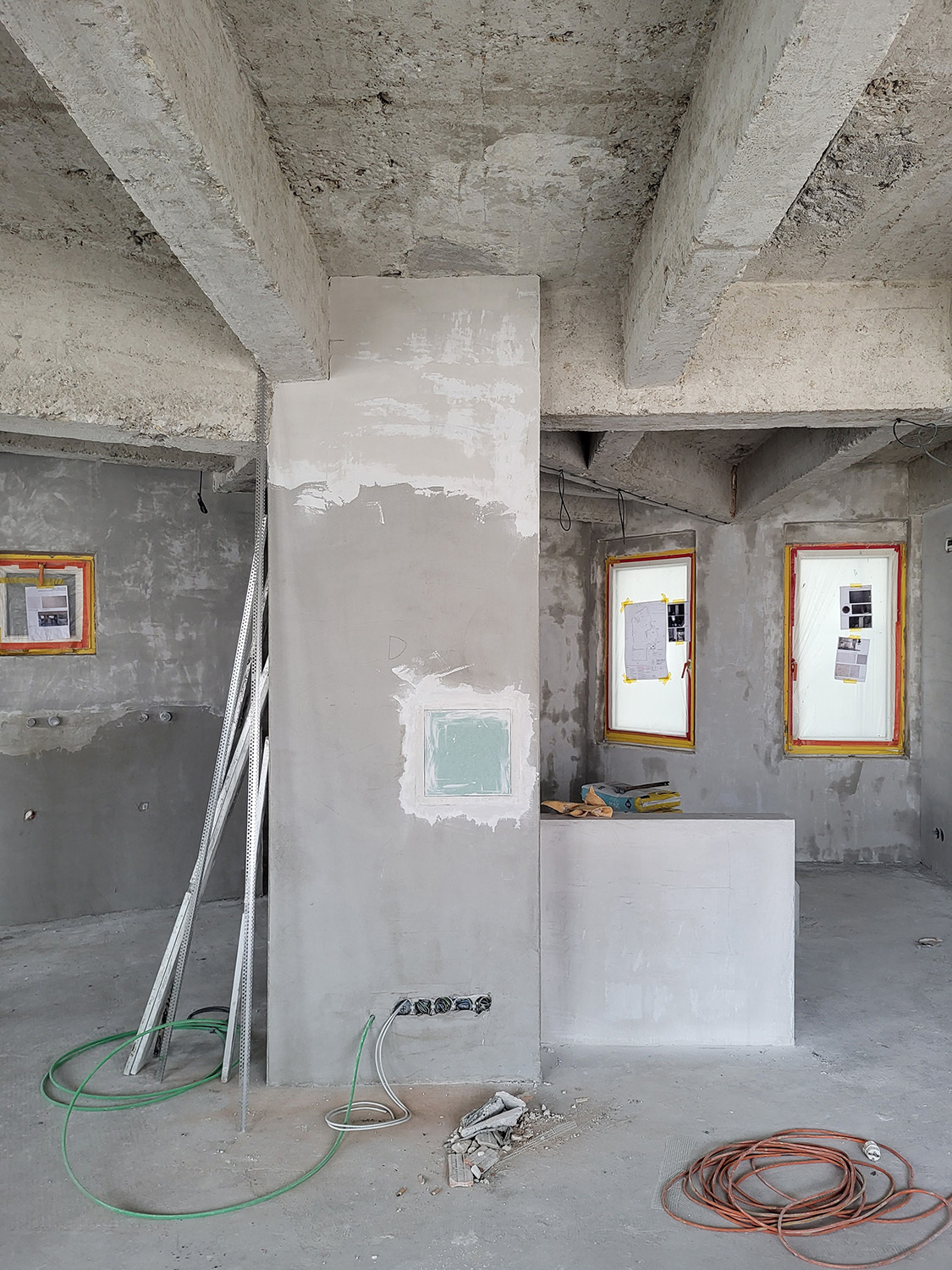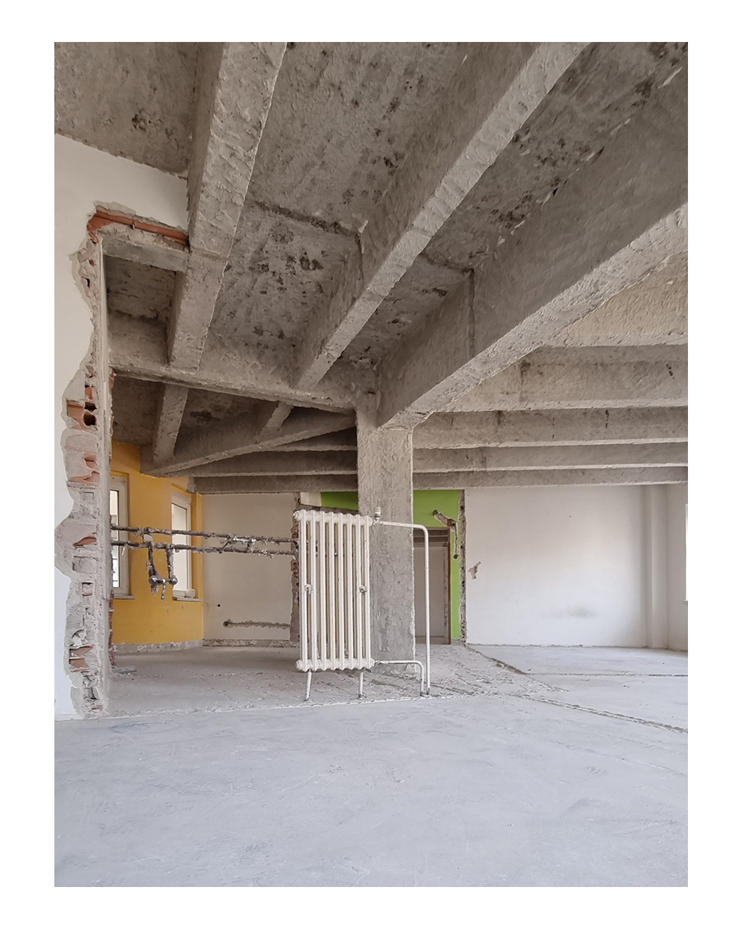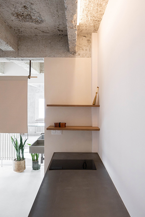 Základný rámec nového ateliérového priestoru z dielne Andrey Lizákovej charakterizujú výrazné železobetónové prievlaky. Určujú východiská pre členenie priestoru aj logiku usporiadania novej vrstvy vstavaného nábytku.