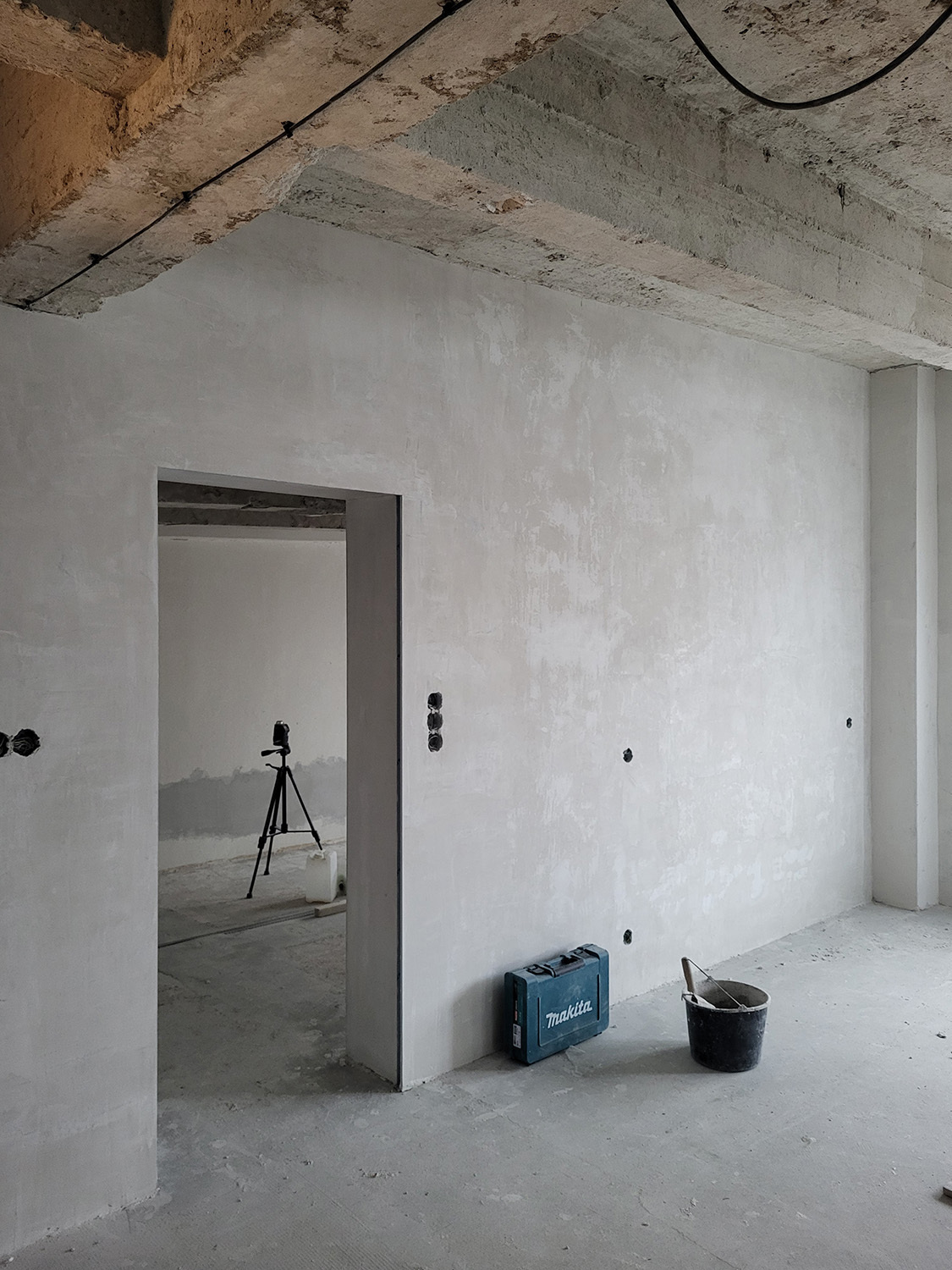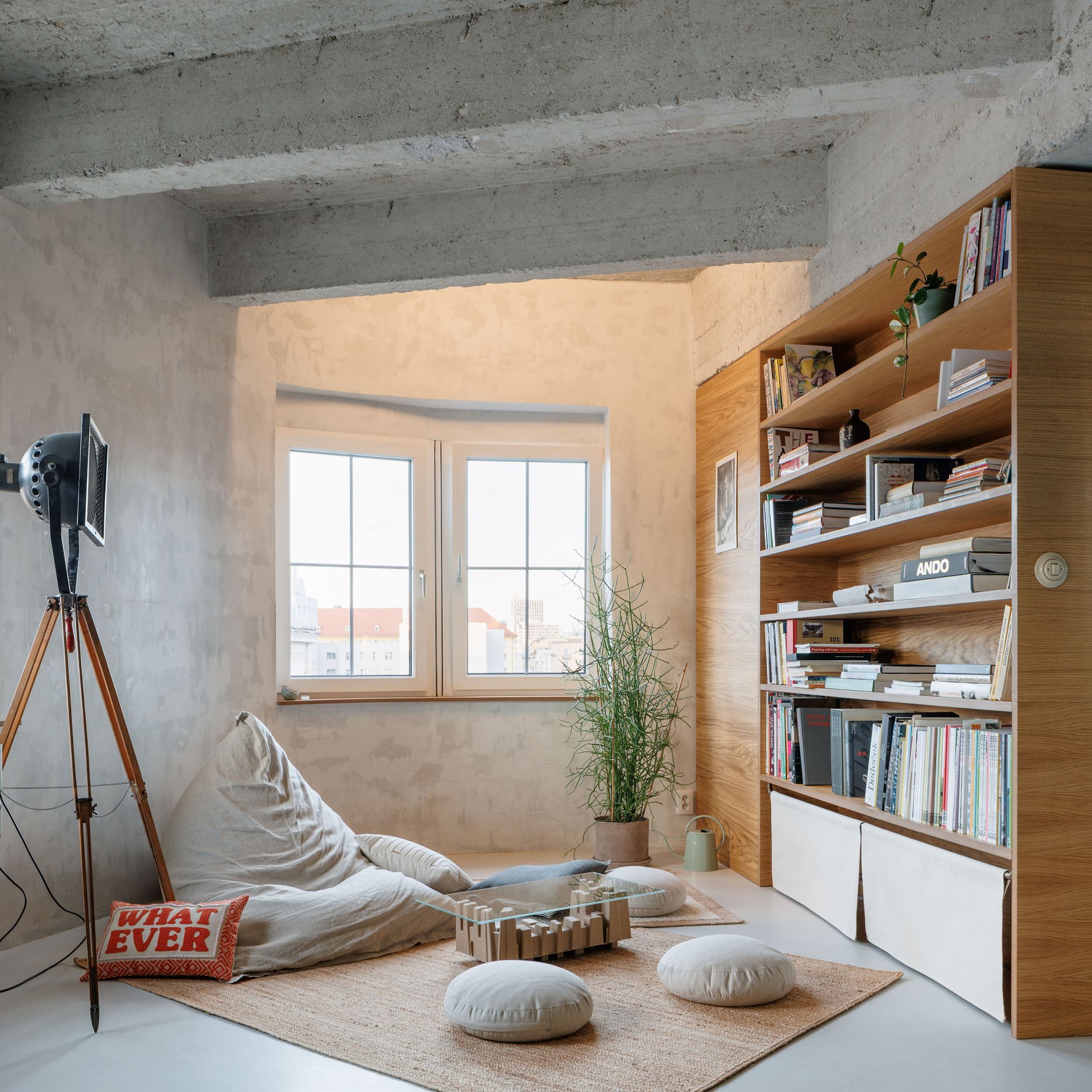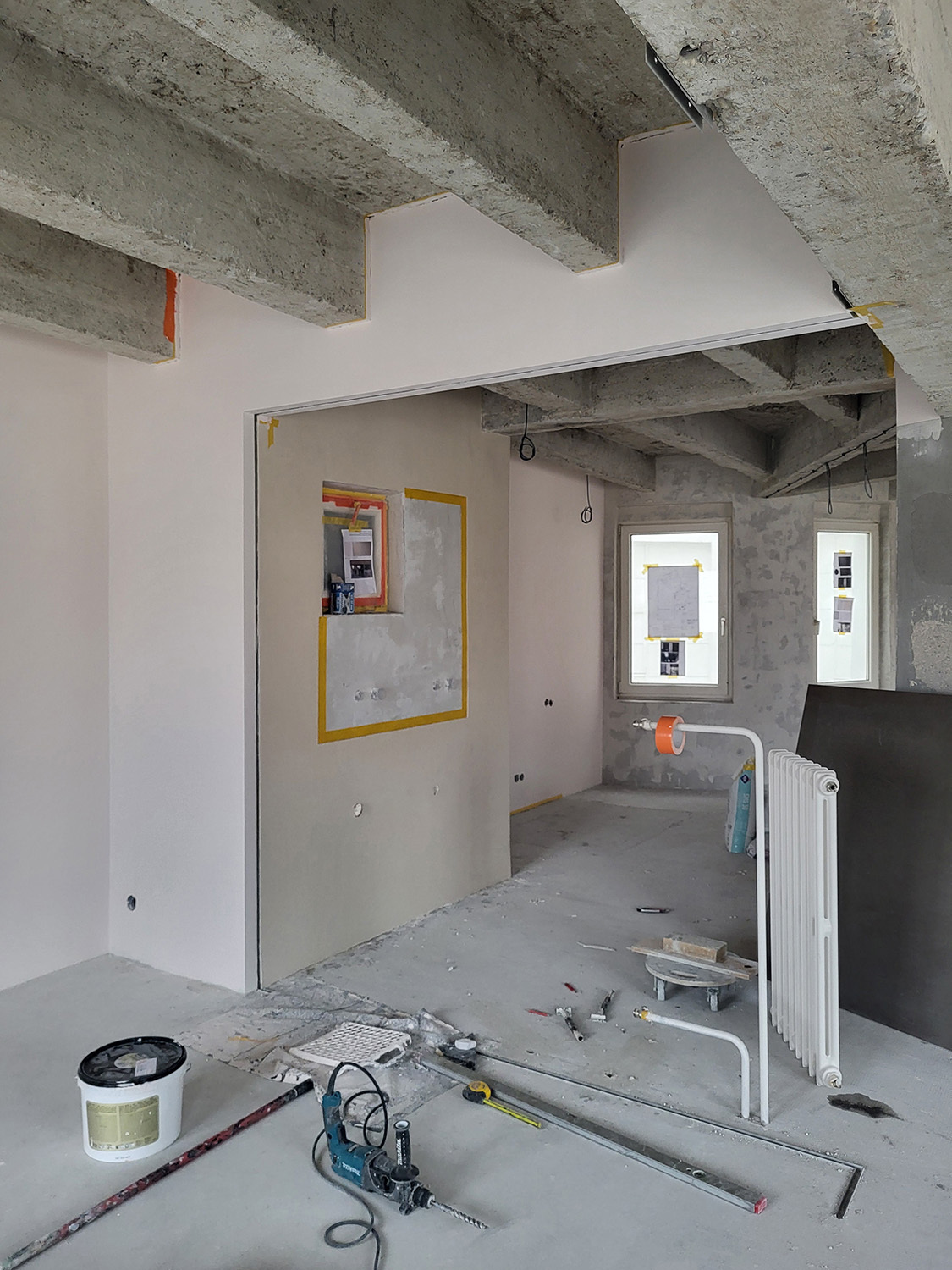 Základný rámec nového ateliérového priestoru z dielne Andrey Lizákovej charakterizujú výrazné železobetónové prievlaky. Určujú východiská pre členenie priestoru aj logiku usporiadania novej vrstvy vstavaného nábytku.