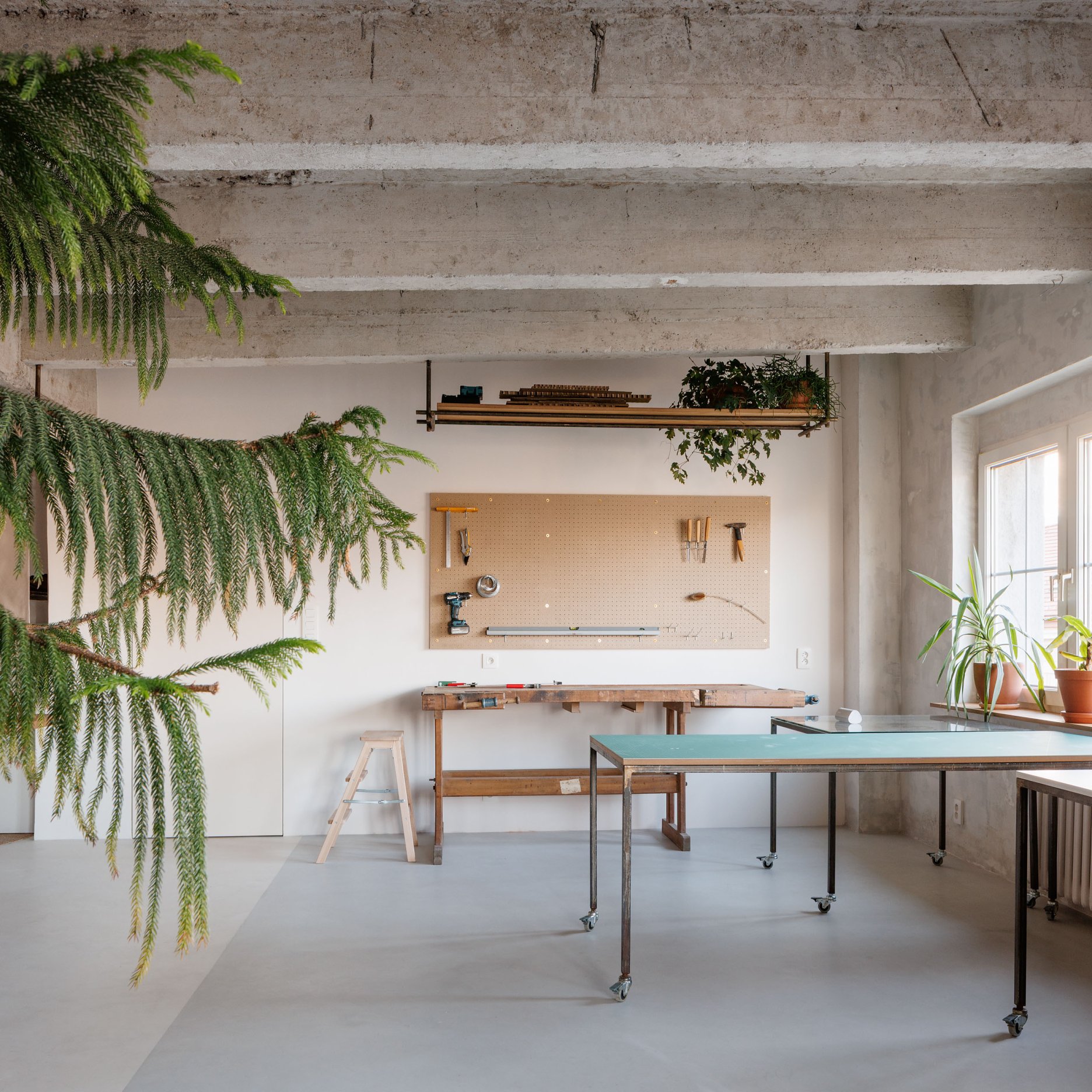 Ateliér je rozdelený na dve hlavné zóny, rozlíšené aj tónom podlahy: