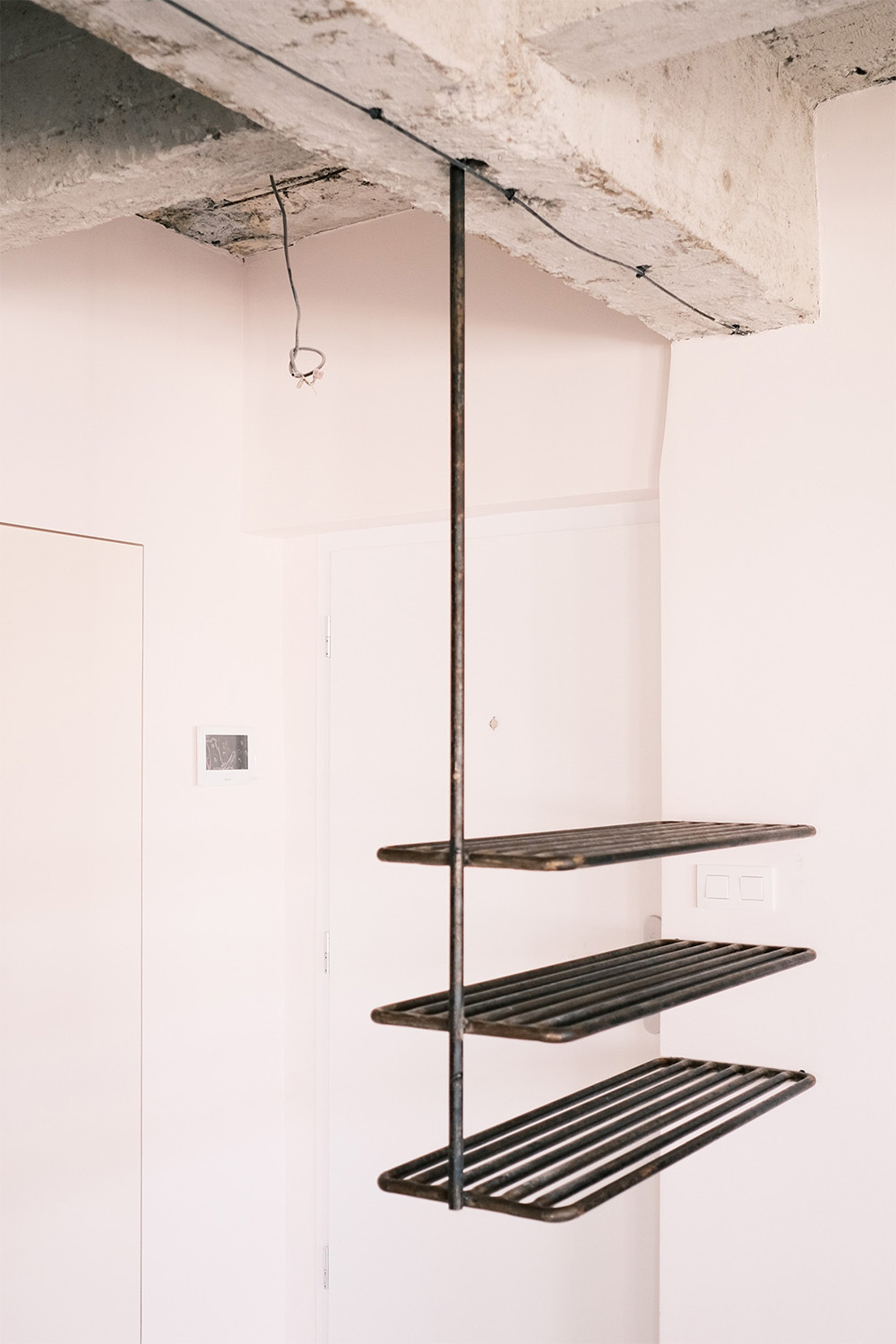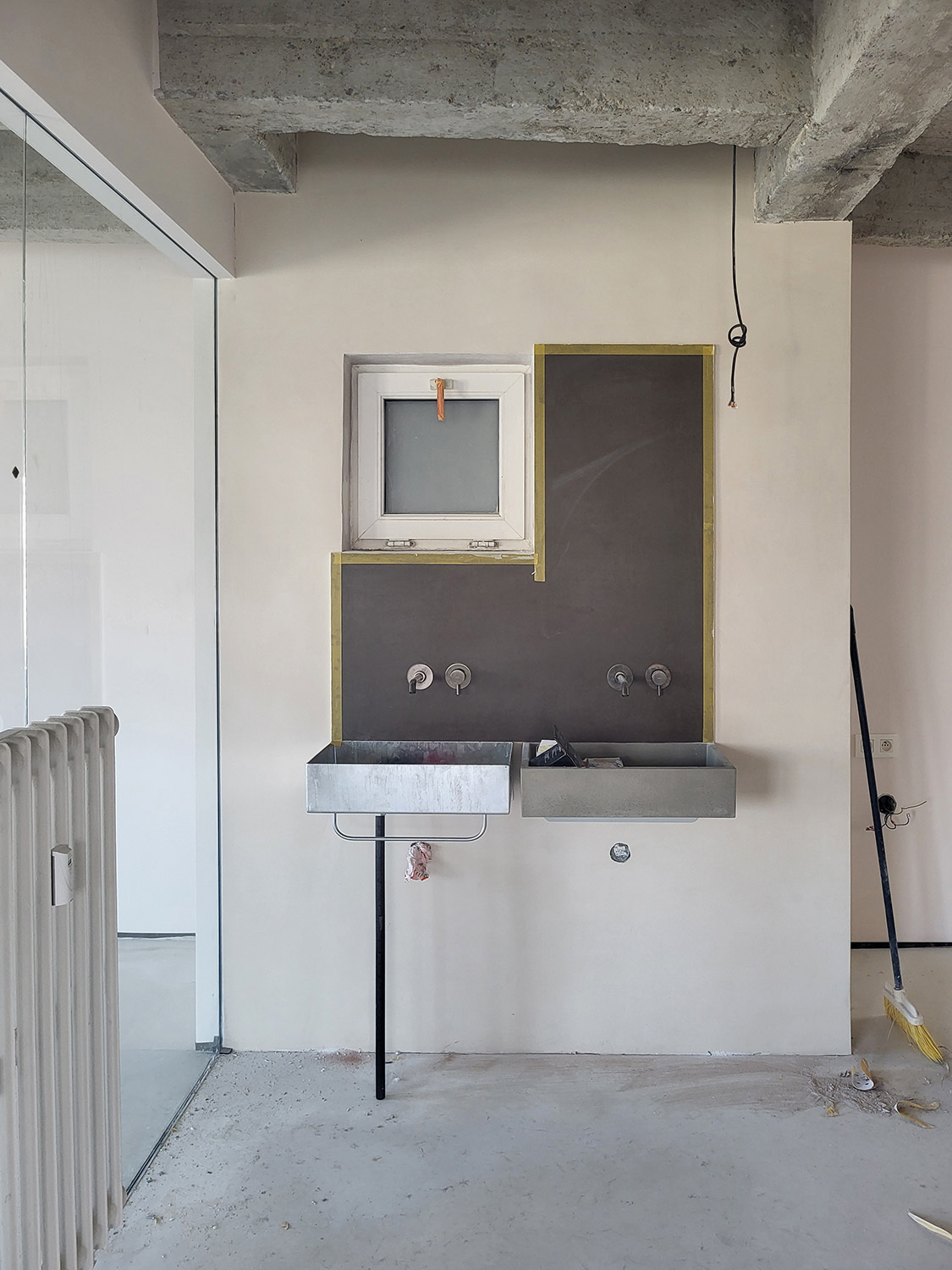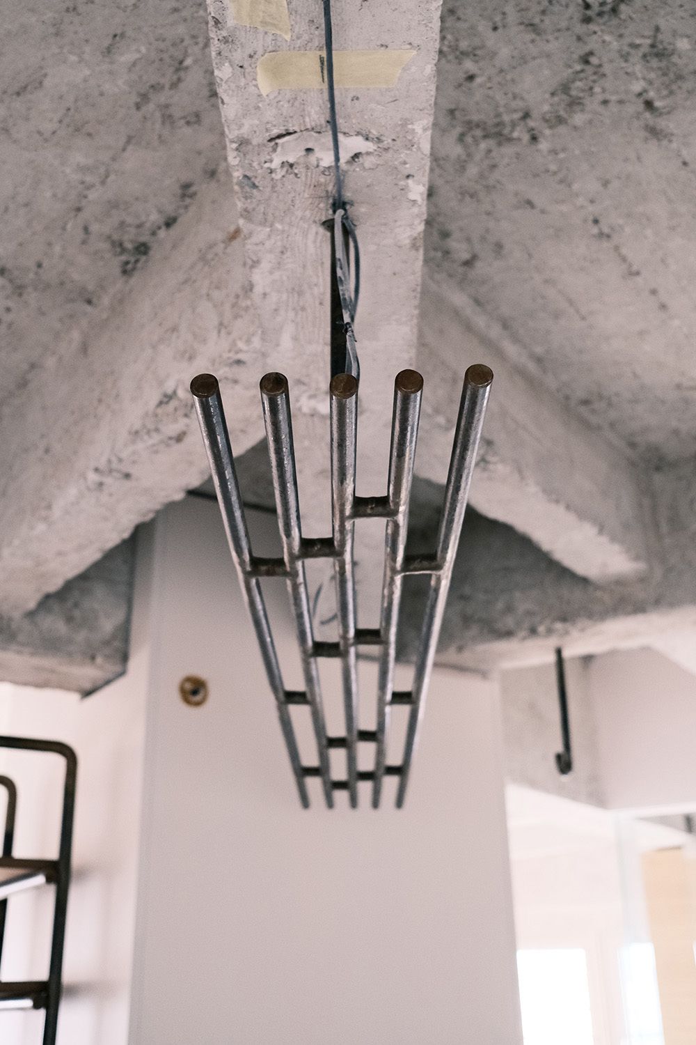 V priebehu rekonštrukcie boli demontované plynové potrubia. Materiál mi bolo ľúto znovu nepoužiť, a tak zvarením viacerých kusov vznikla umývadlová batéria, ktorá je sama dlhým potrubím vychádzajúcim zo stropu. Tmavý, vekom skrášlený materiál sa stal predlohou pre ostatné kovové prvky - zvárané konštrukcie rúrok rôznych priemerov a kuchynský pult zo surovej ocele.