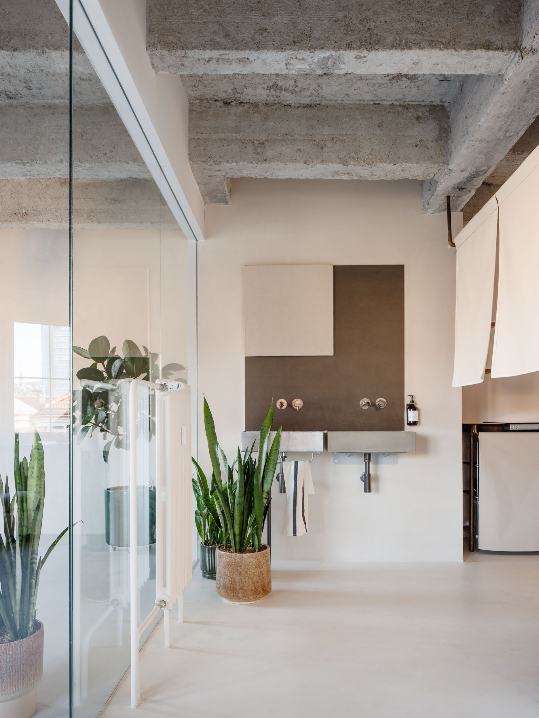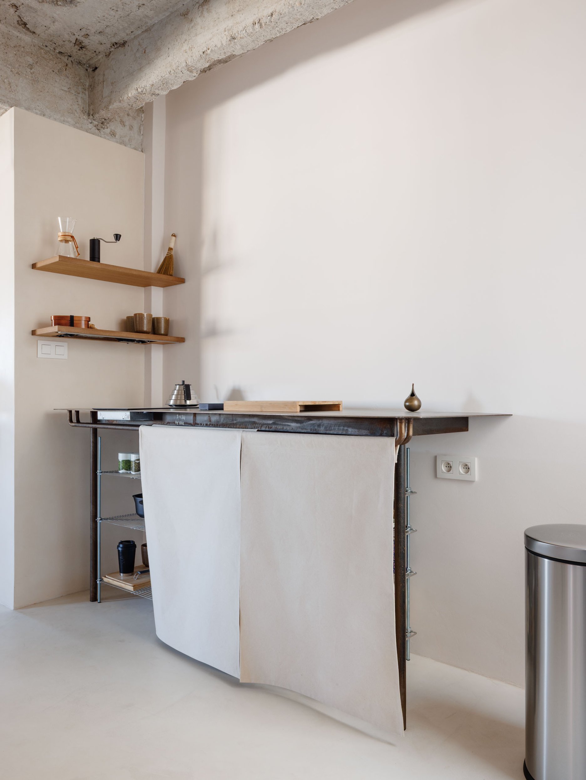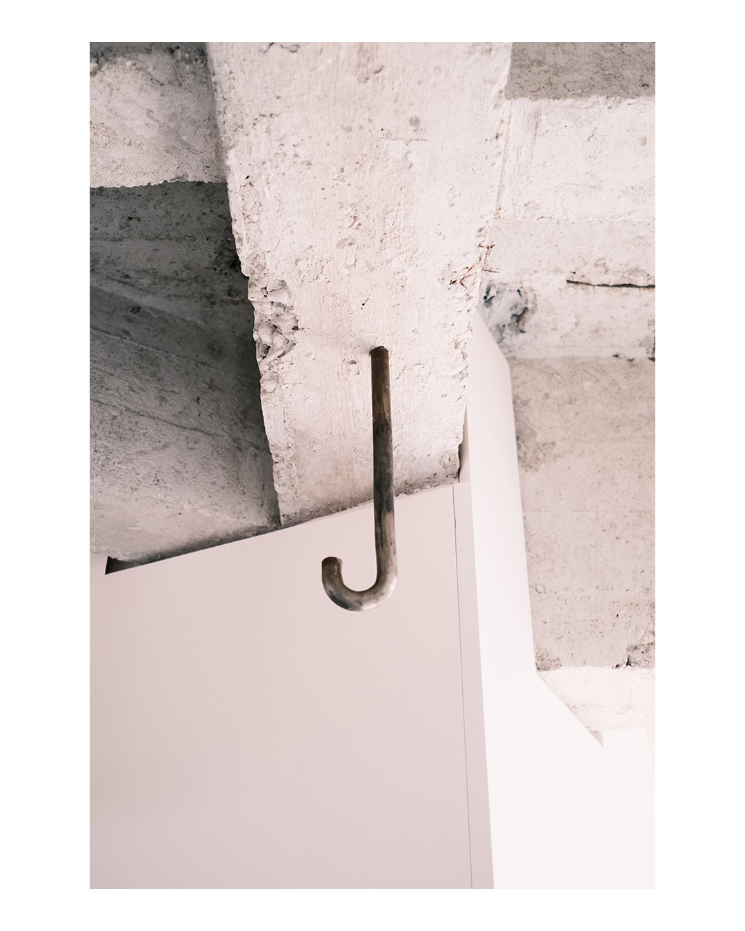 V priebehu rekonštrukcie boli demontované plynové potrubia. Materiál mi bolo ľúto znovu nepoužiť, a tak zvarením viacerých kusov vznikla umývadlová batéria, ktorá je sama dlhým potrubím vychádzajúcim zo stropu. Tmavý, vekom skrášlený materiál sa stal predlohou pre ostatné kovové prvky - zvárané konštrukcie rúrok rôznych priemerov a kuchynský pult zo surovej ocele.