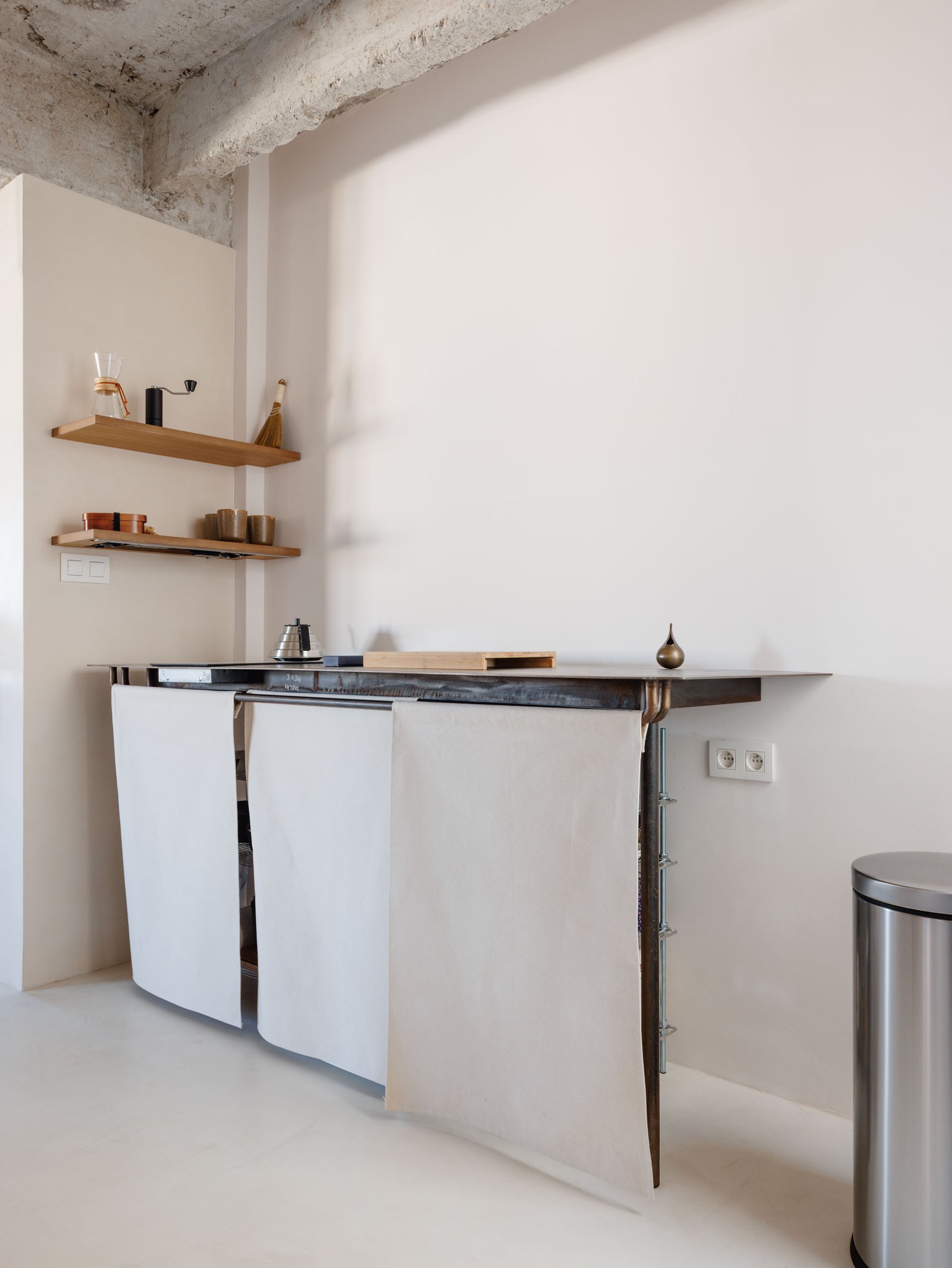 Surové maliarske plátna sú použité na predelenie priestoru namiesto priečok, a na nábytku namiesto dvierok.