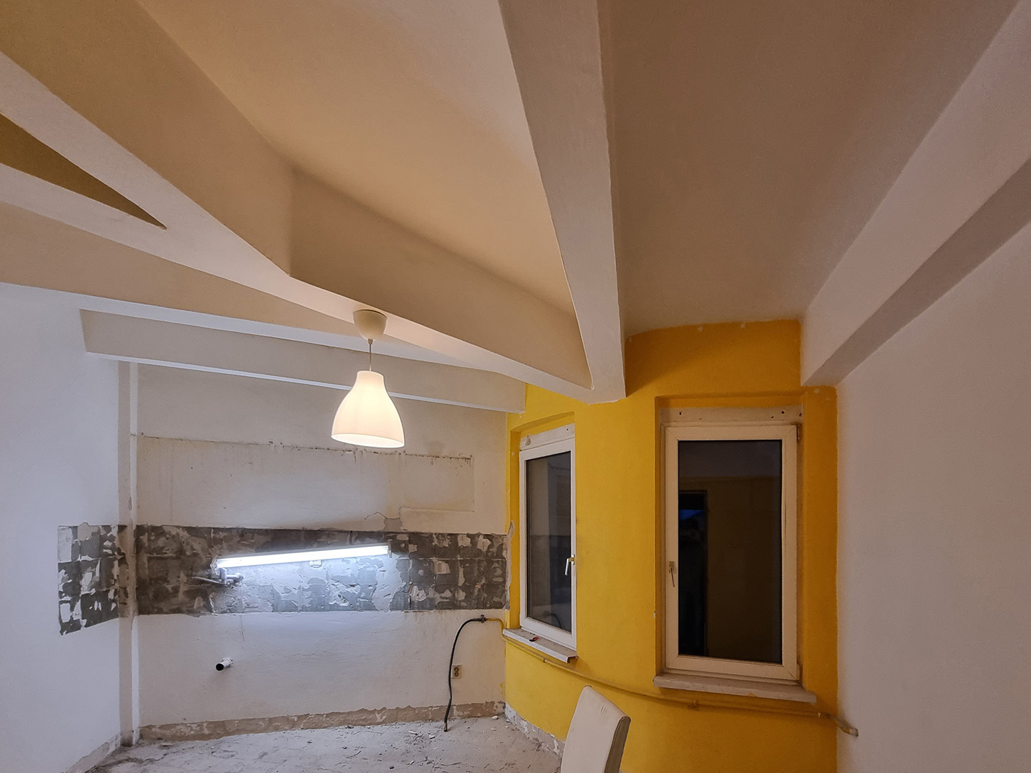Táto stropná schéma je v návrhu reflektovaná členením priestoru a dispozíciou vstavaného nábytku – je umiestnený tak, aby sa s touto schémou nebil a nekonkuroval jej, ale naopak, aby s ňou spolupracoval.