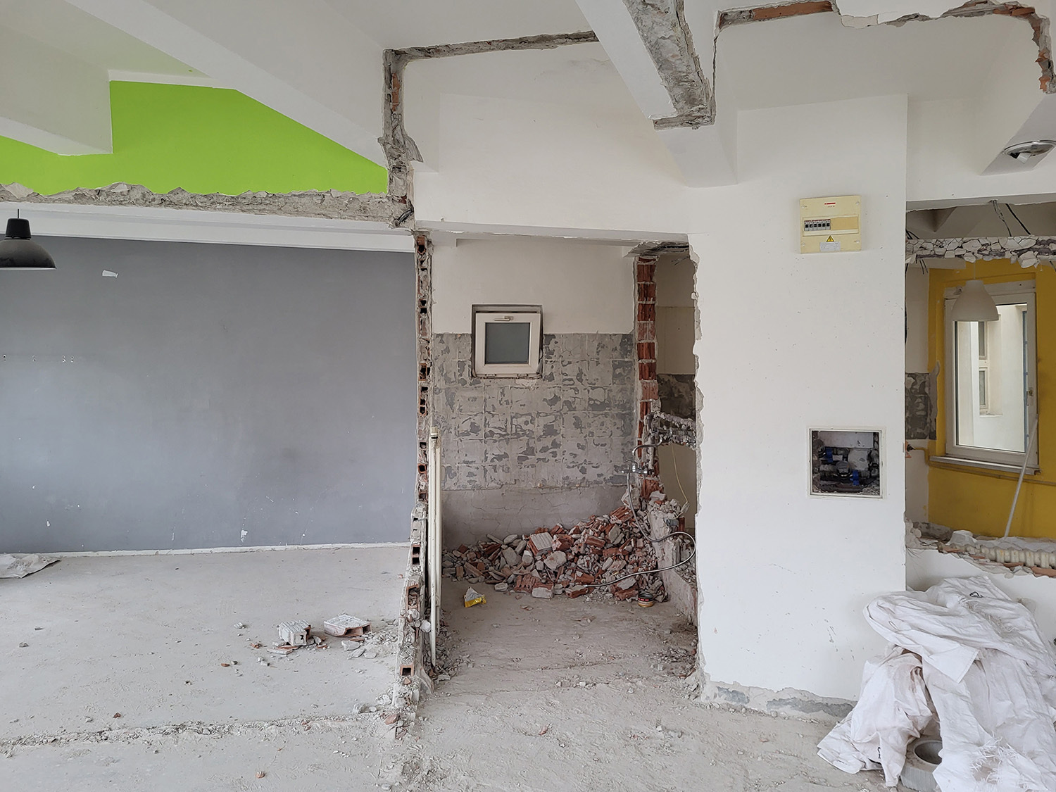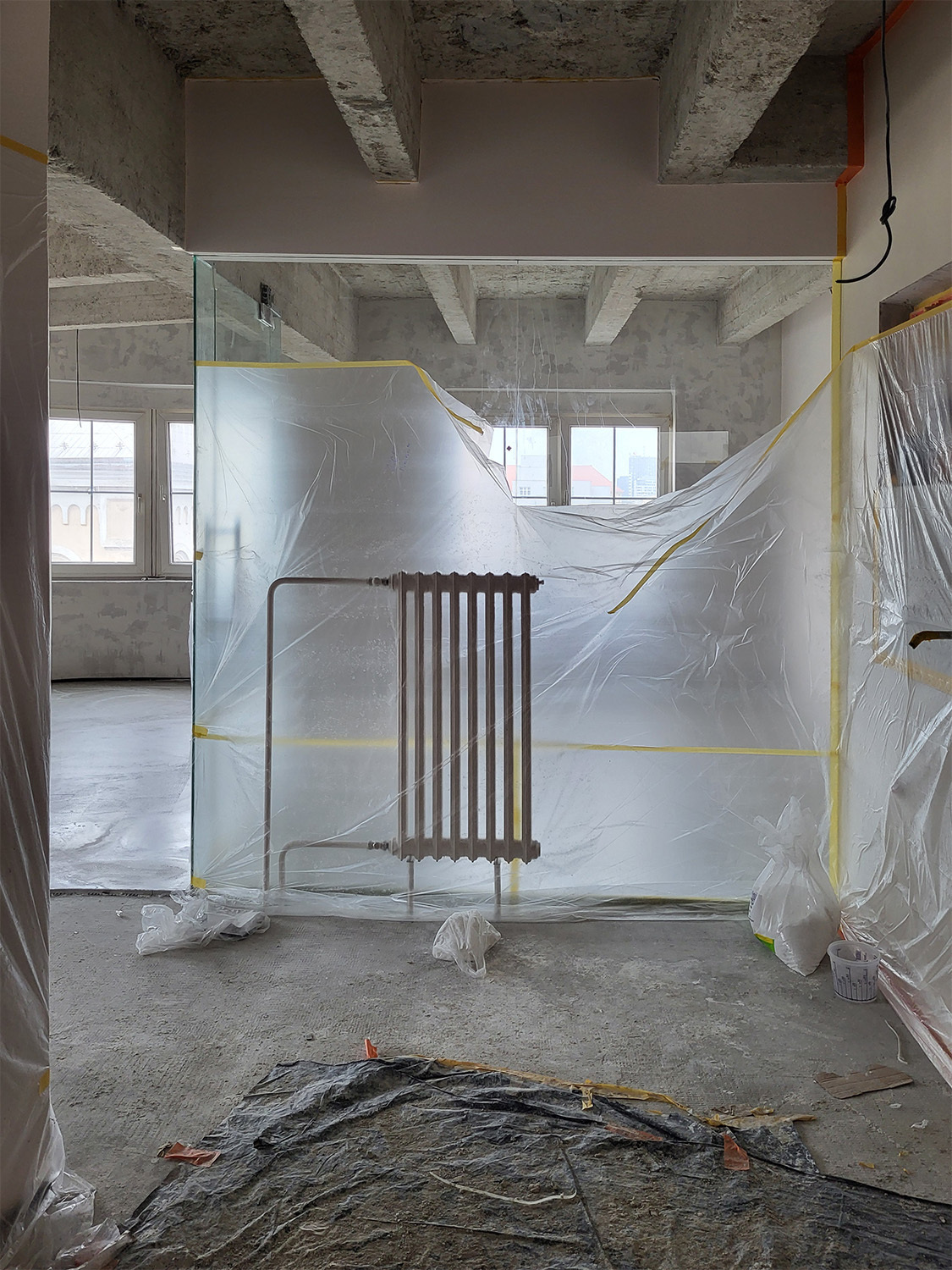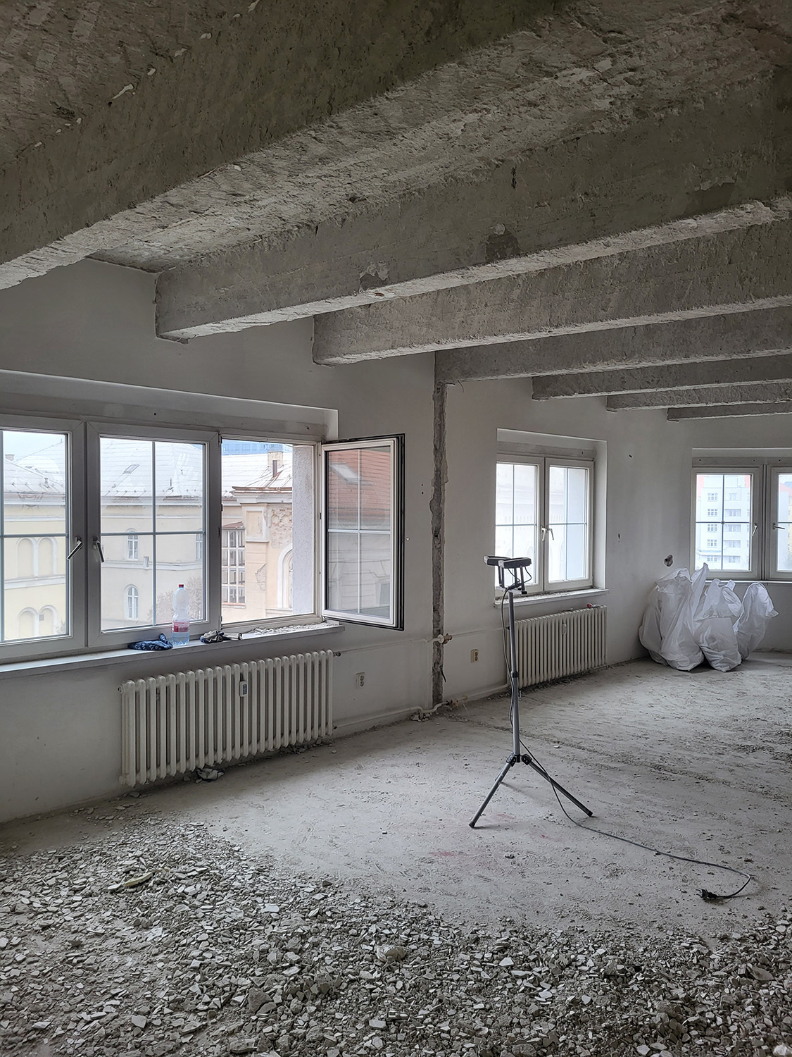 Budova, v ktorej sa priestor nachádza, bola postavená v roku 1928 podľa návrhu architekta Juraja Tvarožka. V 90.rokoch bola rekonštruovaná - pôdorys "pôvodný stav" ukazuje stav po poslednej rekonštrukcii v tom období. Pri novom návrhu bolo mojim cieľom vzdať poctu samotnej budove - nezadusiť kvalitnú stavbu úpravami, ktoré by neboli v súlade s priestorovými kvalitami pôvodného návrhu budovy a zároveň zabezpečiť požiadavky pre novú náplň ateliéru.