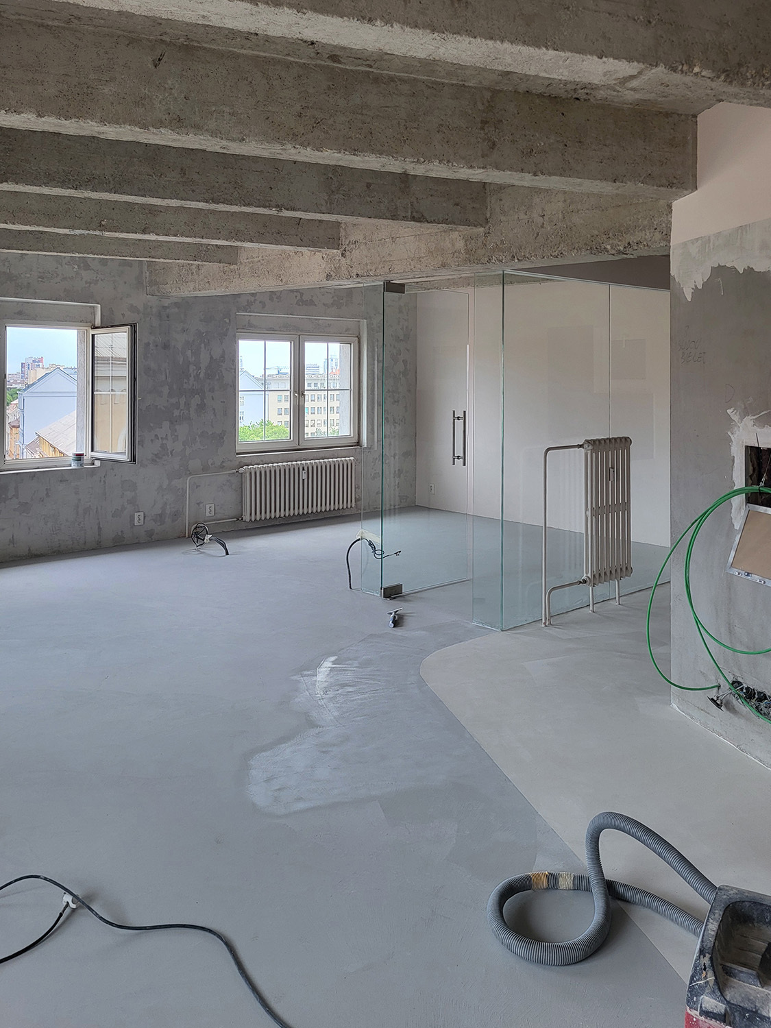 Autorka dbá na zachovanie kontinuity priestoru, aj dôležitých priehľadov. Ťažké prvky dopĺňajú ľahké a pohyblivé – rúrkový mobiliár, presklenie, odnímateľné maliarske plátna a nábytkové prvky na kolieskach, vďaka čomu je ateliér otvorený, no variabilne deliteľný.