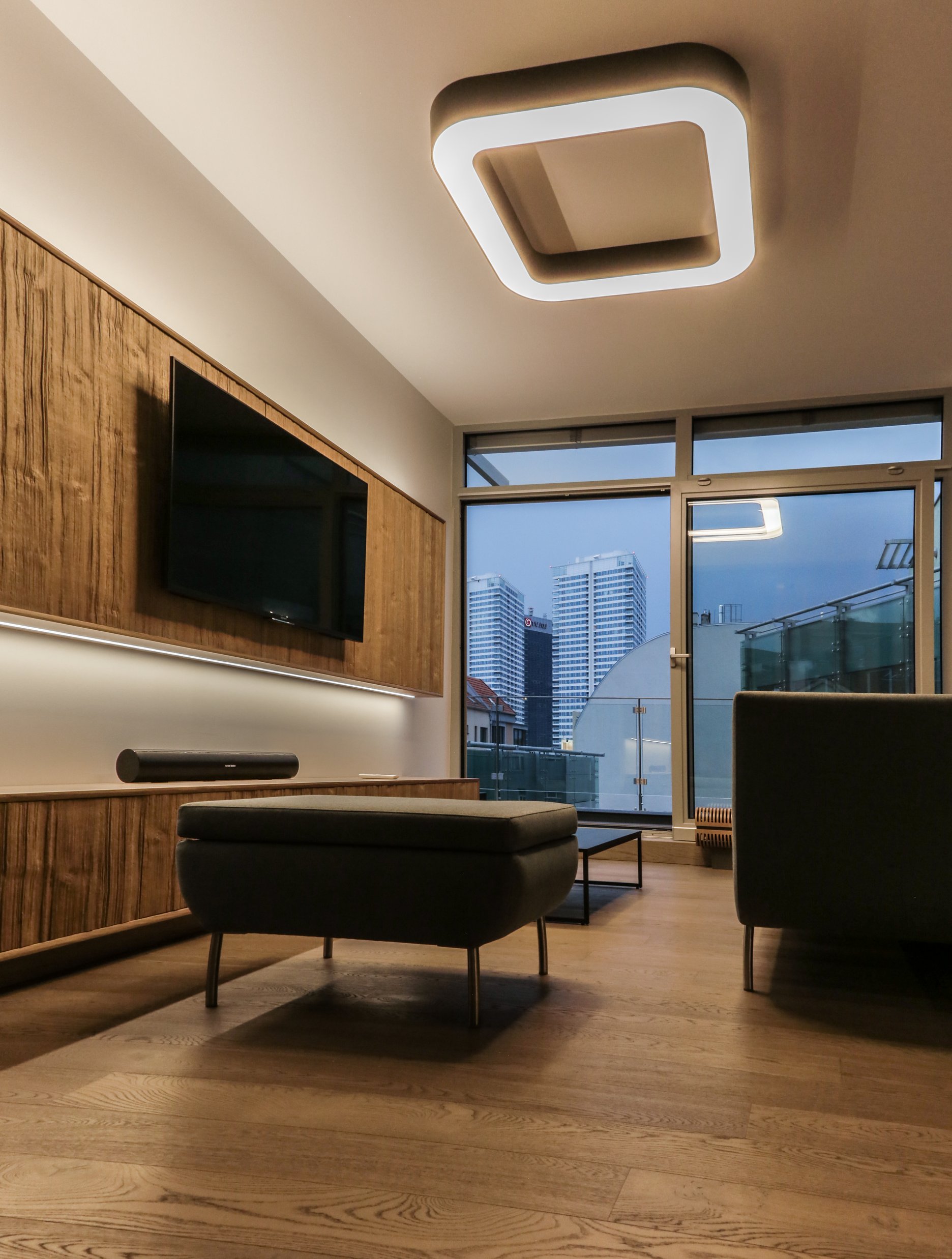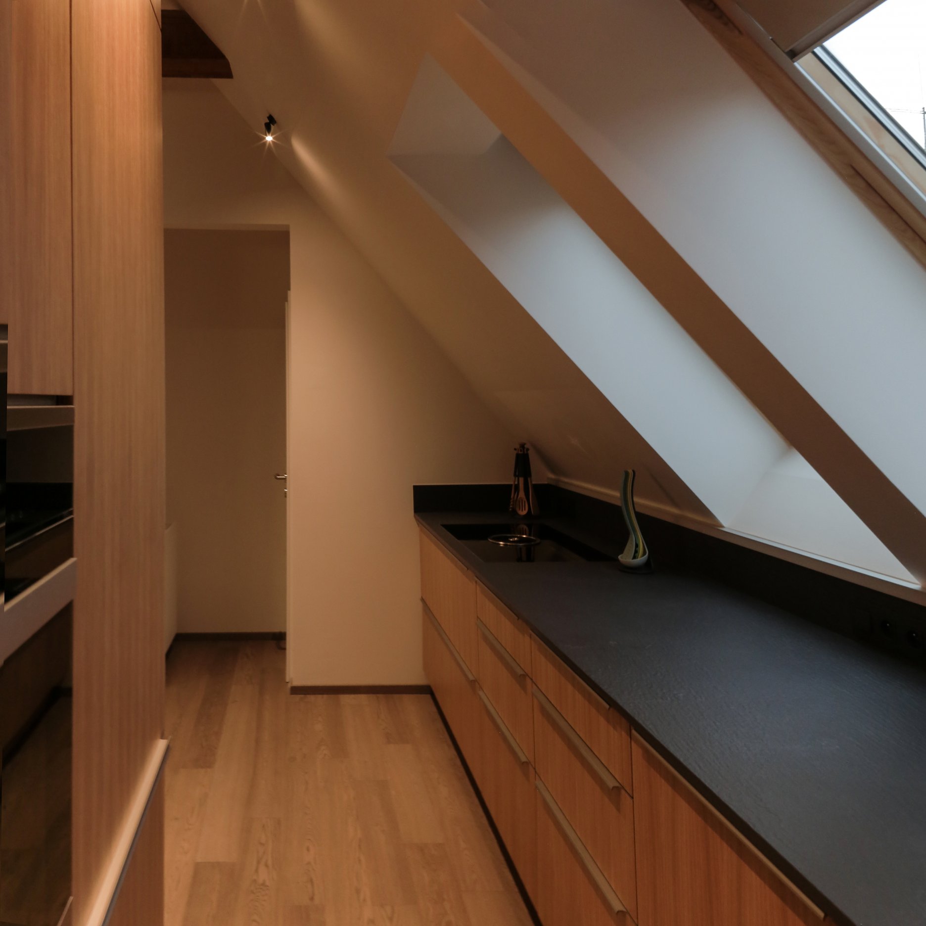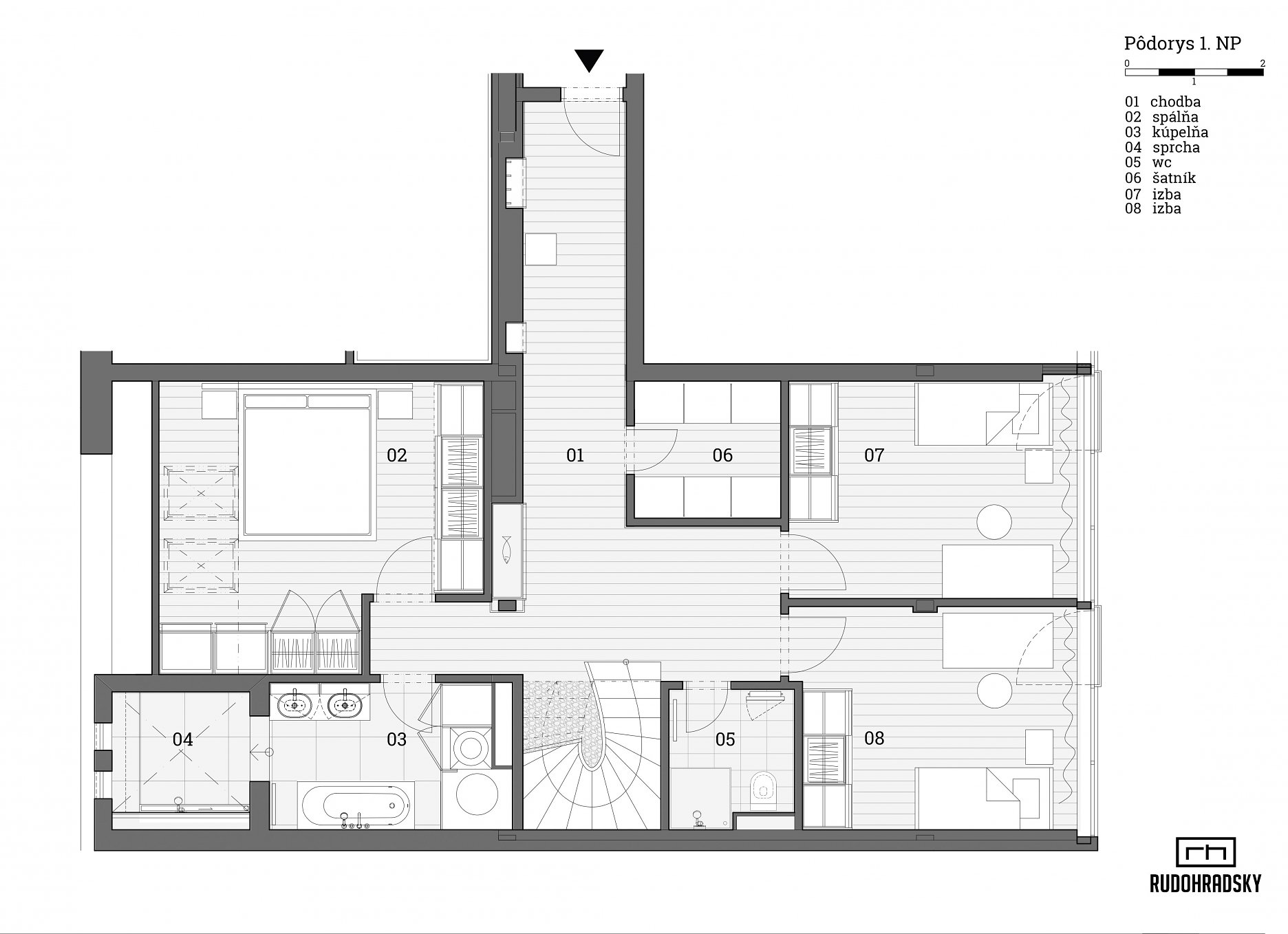 Dvojúrovňová dispozícia bytu je riešená s ohľadom na geometriu šikmej strechy a výhľady ponad strešnú krajinu. Zo spoločných priestorov domu sa do bytu vstupuje cez lineárnu chodbu, ktorá vedie do centrálnej haly. Na spodnom podlaží sa nachádza nočná časť bytu. Z haly sú prístupné dve menšie miestnosti - detská izba a pracovňa s prislúchajúcou kúpeľňou a šatníkom. Na druhej strane sa nachádza spálňa rodičov spolu s veľkou kúpeľňou. Súkromie zabezpečuje diskrétny vstup cez malú predsieň. Zaujímavo je riešený veľkorysý sprchový kút, ktorý sa nachádza v priestore jednej zo strešných vežičiek.