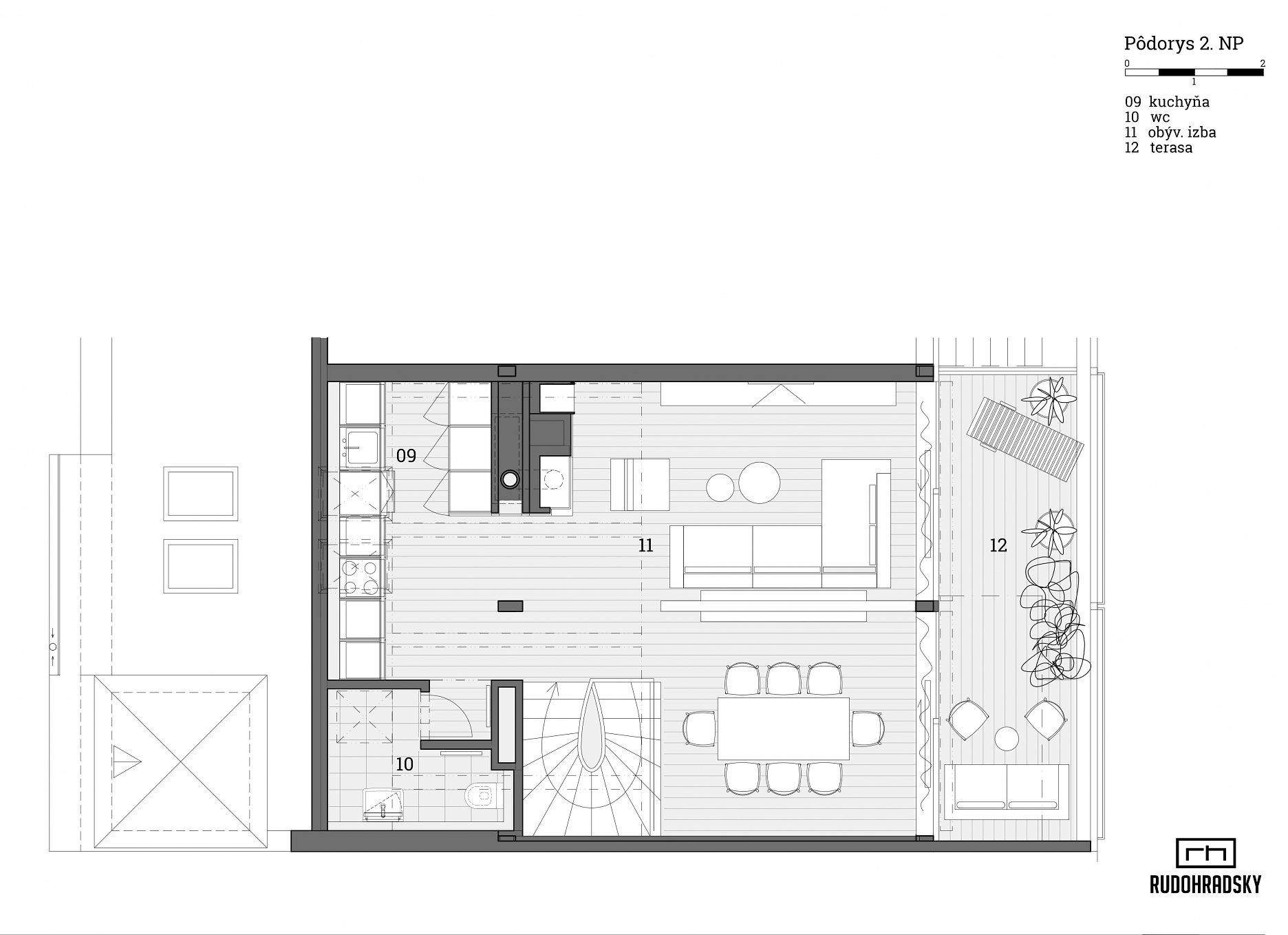 Do dennej časti v podkroví sa vychádza cez vretenové schodisko. Z otvorenej obytnej zóny na poschodí sa otvárajú výhľady na mesto. Na poschodí sa nachádza kuchyňa, jedáleň a obývací priestor. Jednotlivé funkcie sú oddelené vstavanými nábytkovými prvkami. Obývacia izba s južne orientovanou presklenou stenou prechádza do exteriéru pobytovej terasy. Interiér je pred priamym slnečným svetlom chránený exteriérovými žalúziami a výsuvnou markízou.
