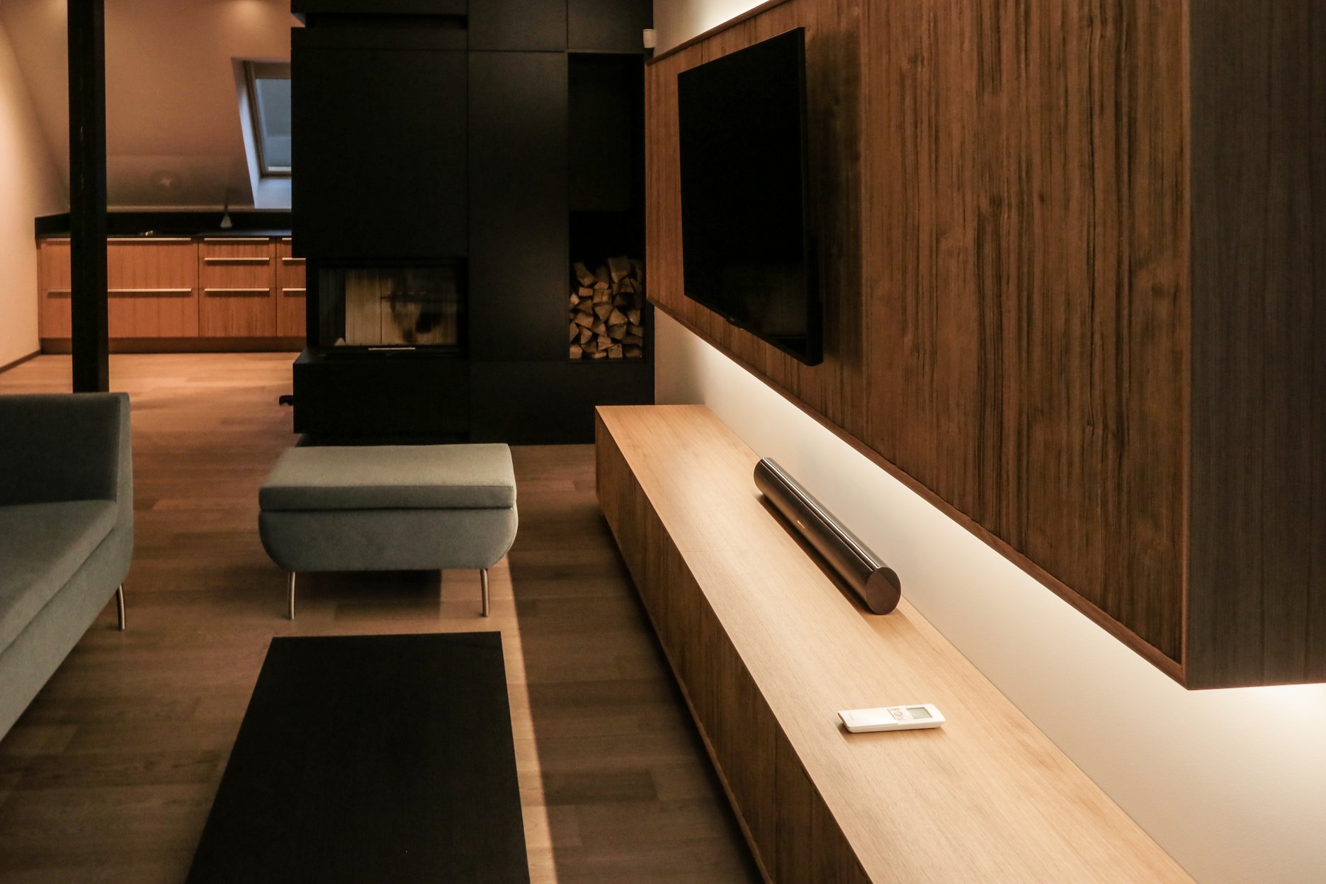 Na poschodí zaujme kubus oddeľujúci kuchynskú a obytnú časť na poschodí. Sú tu zabudované spotrebiče a vysoké odkladacie skrinky kuchynskej strany a vinotéka prístupná z obývacej časti. časť čierneho boxu tvorí aj krbové teleso a priestor na uskladnenie dreva.