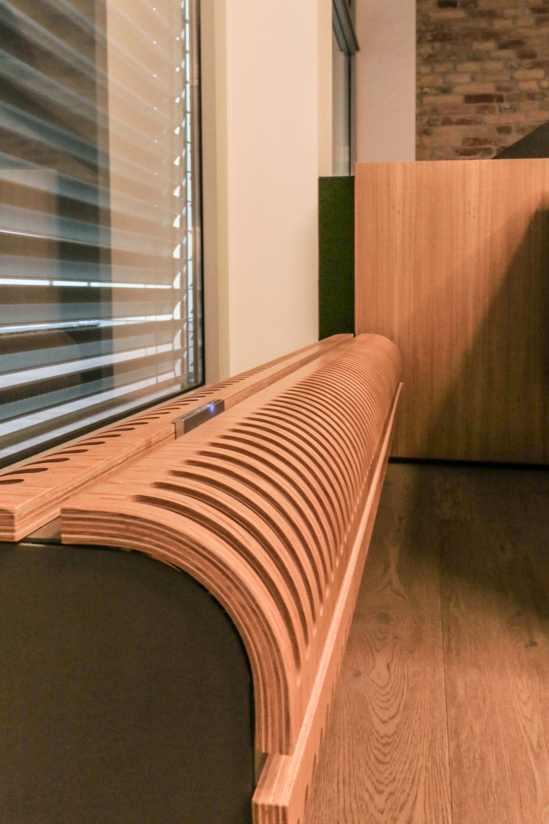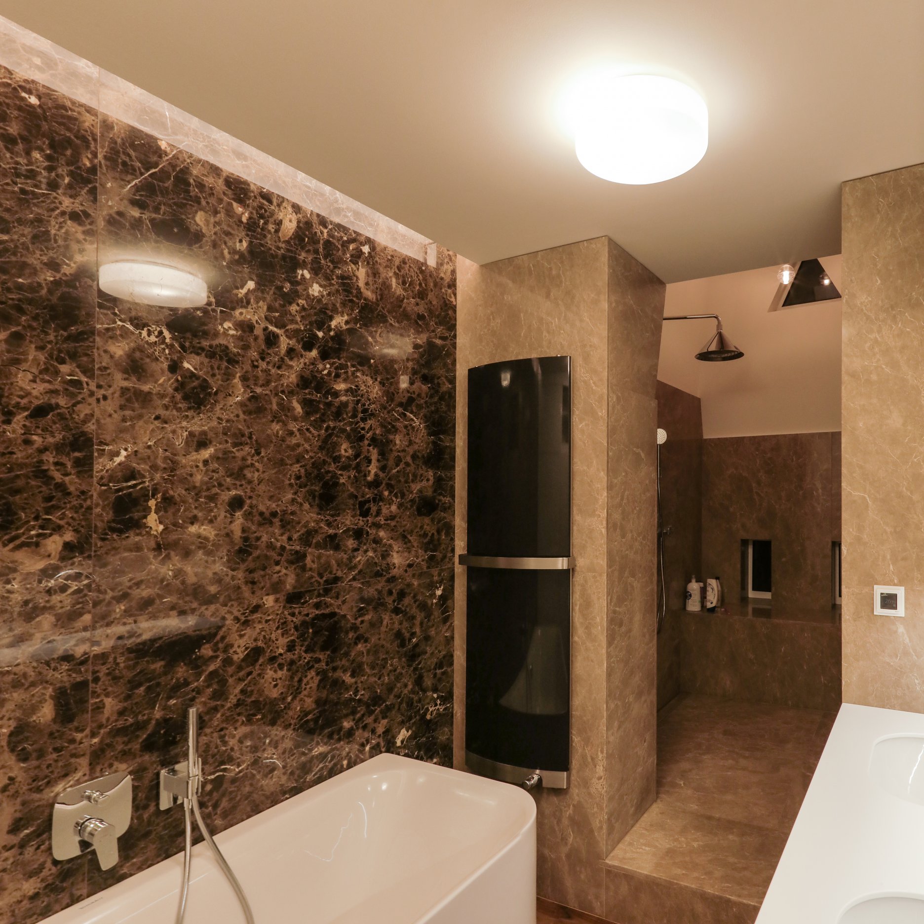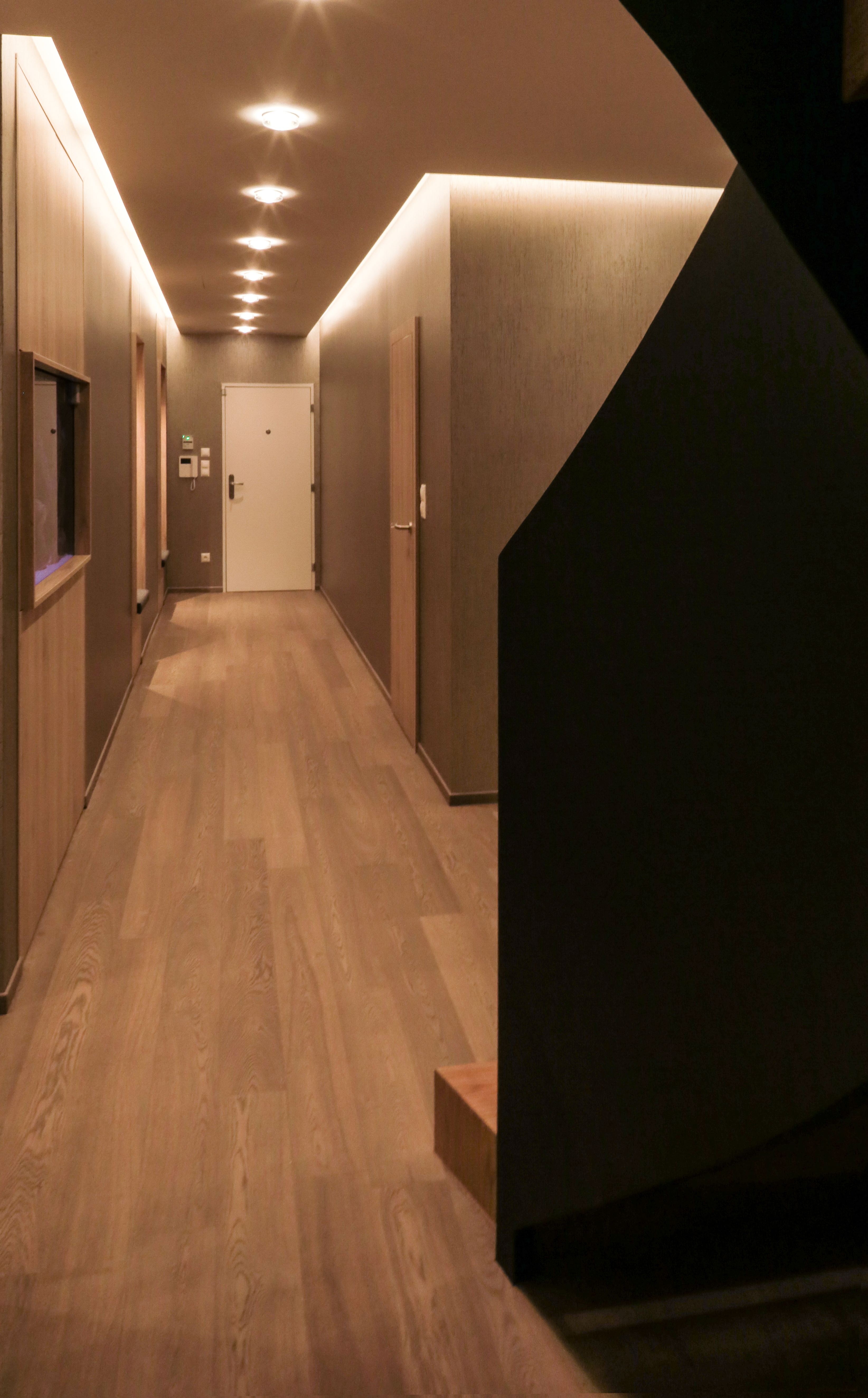 Vstavané nábytkové prvky zjednocuje tlmená farebnosť dubového dreva a precízne vyhotovenie s dôrazom na detail. Medzi premyslené detaily patria napríklad niky vo vstupnej chodbe, ktoré sú vložené medzi nosné konštrukcie. Výklenky funkčne aj opticky rozširujú úzky priestor.