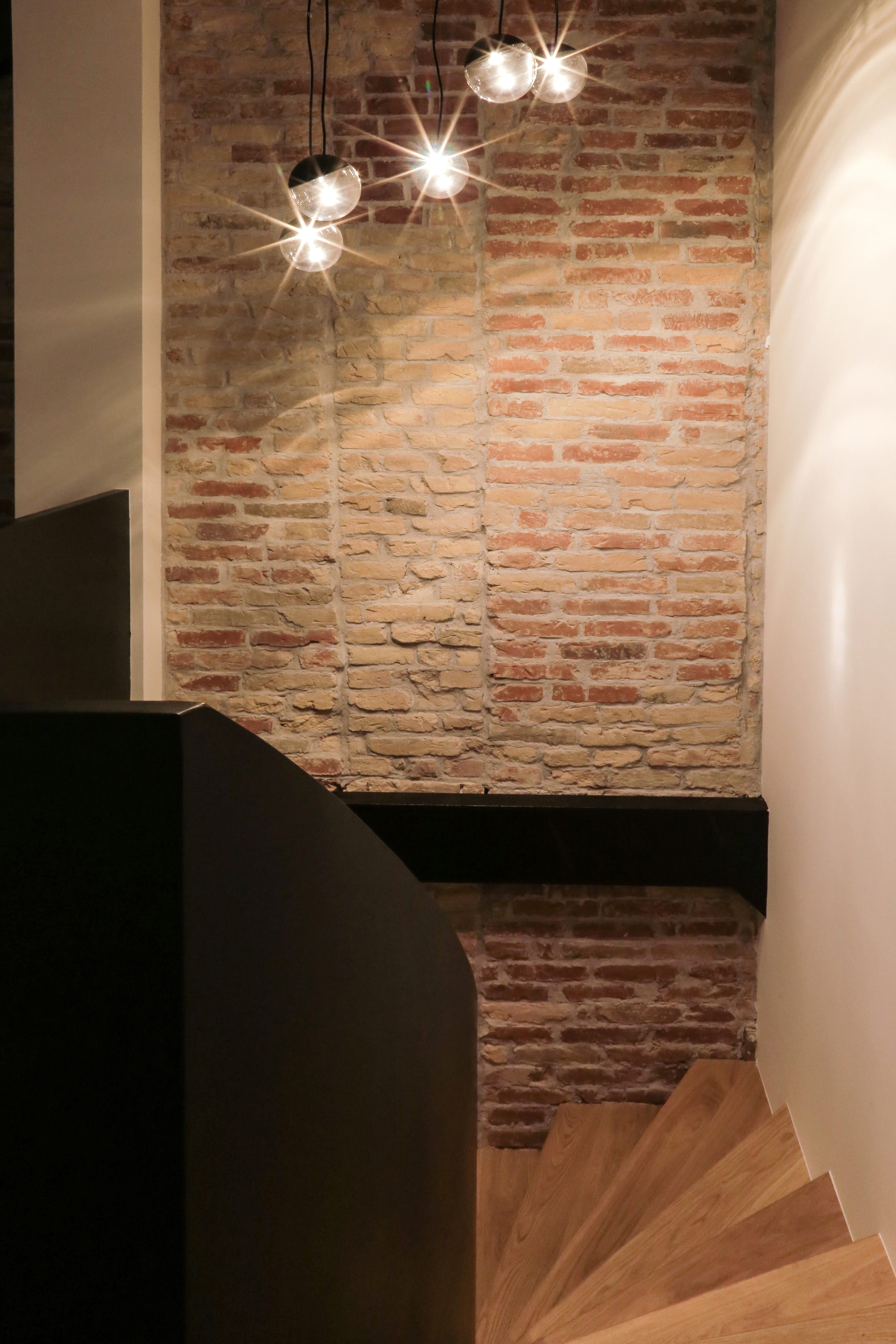 Najvýraznejším prvkom v interiéri je vretenové schodisko, ktoré zaujme hneď po vstupe do bytu. Solitérny prvok vyniká na pozadí tehlovej steny. Jediným viditeľným nosným prvkom je organická krivka čierneho vretena, ktoré slúži zároveň ako zábradlie. Dubové stupne sú po obvode kotvené oceľovými nosníkmi zabudovanými v sadrokartónovej stene.