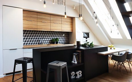 Interiér bytu v pamiatkovo chránenom nájomnom dome na Grösslingovej ulici z konca 19. storočia. Mezonetový byt s podlažnou plochou 157 m2 sa nachádza v podkroví členitej strechy s nárožnými vežičkami.