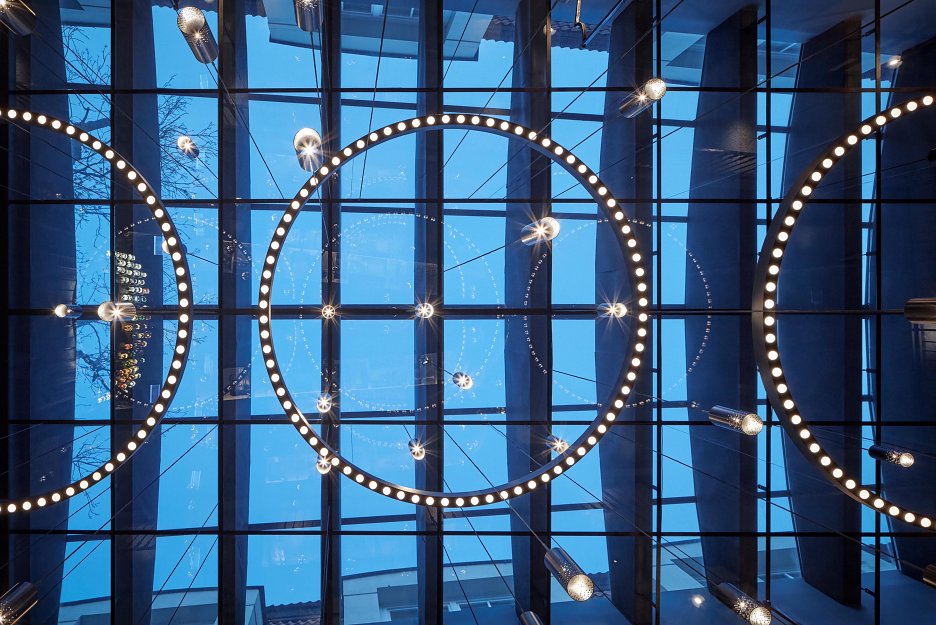 "Zvolené řešení, jako je zdvojený skleněný strop, různé akustické předstěny a omítky jsou integrovány do celkové koncepce interiéru,” vysvetľujú architekti.