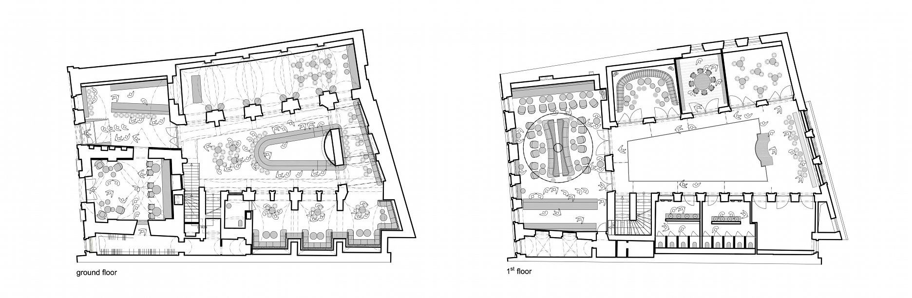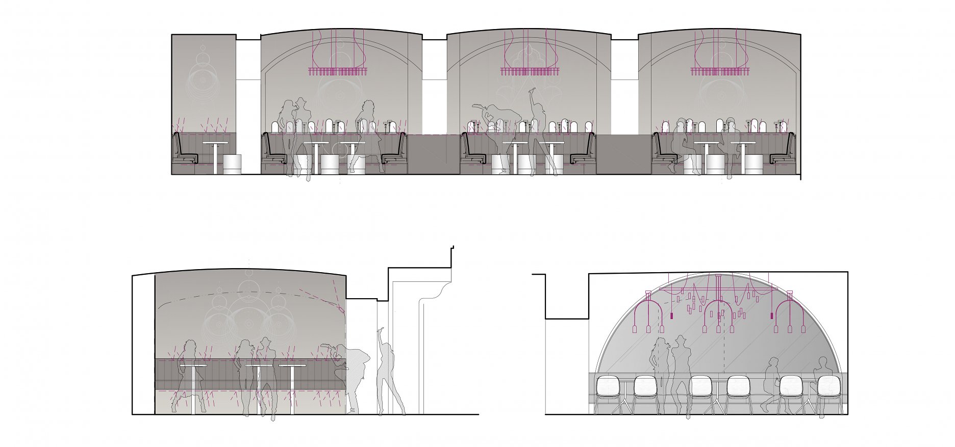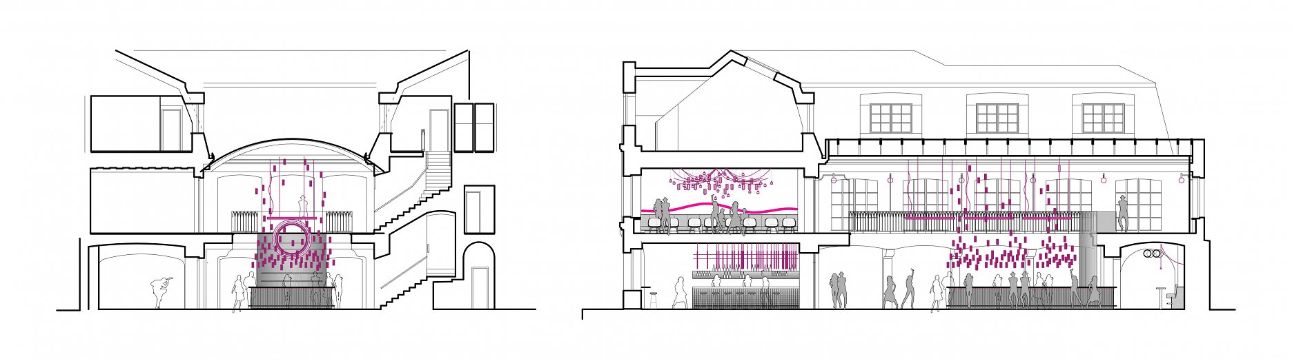 Skĺbenie pôvodnej dispozície s požiadavkami na prevádzku klubu znamenalo vytvorenie viacerých oddychových zón. V klenutých priestoroch, prebiehajúcich pozdĺž dvorany, sú situované salóniky s intímnym osvetlením a tanečný parket. Pavlač na poschodí, ktorá je ideálnym miestom na sledovanie diania okolo baru, sprístupňuje zvyšné salóniky a komornejší Alchymist bar.