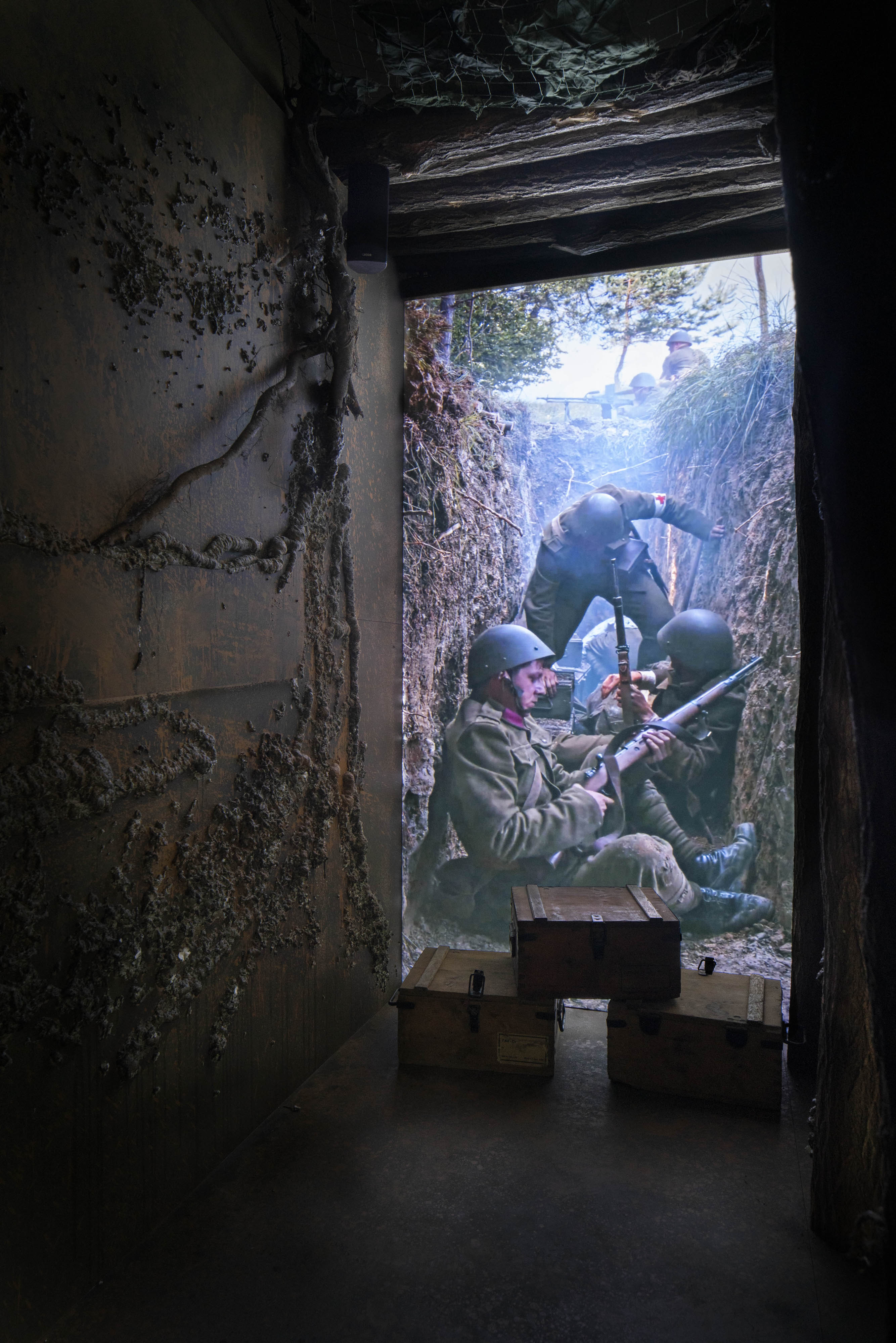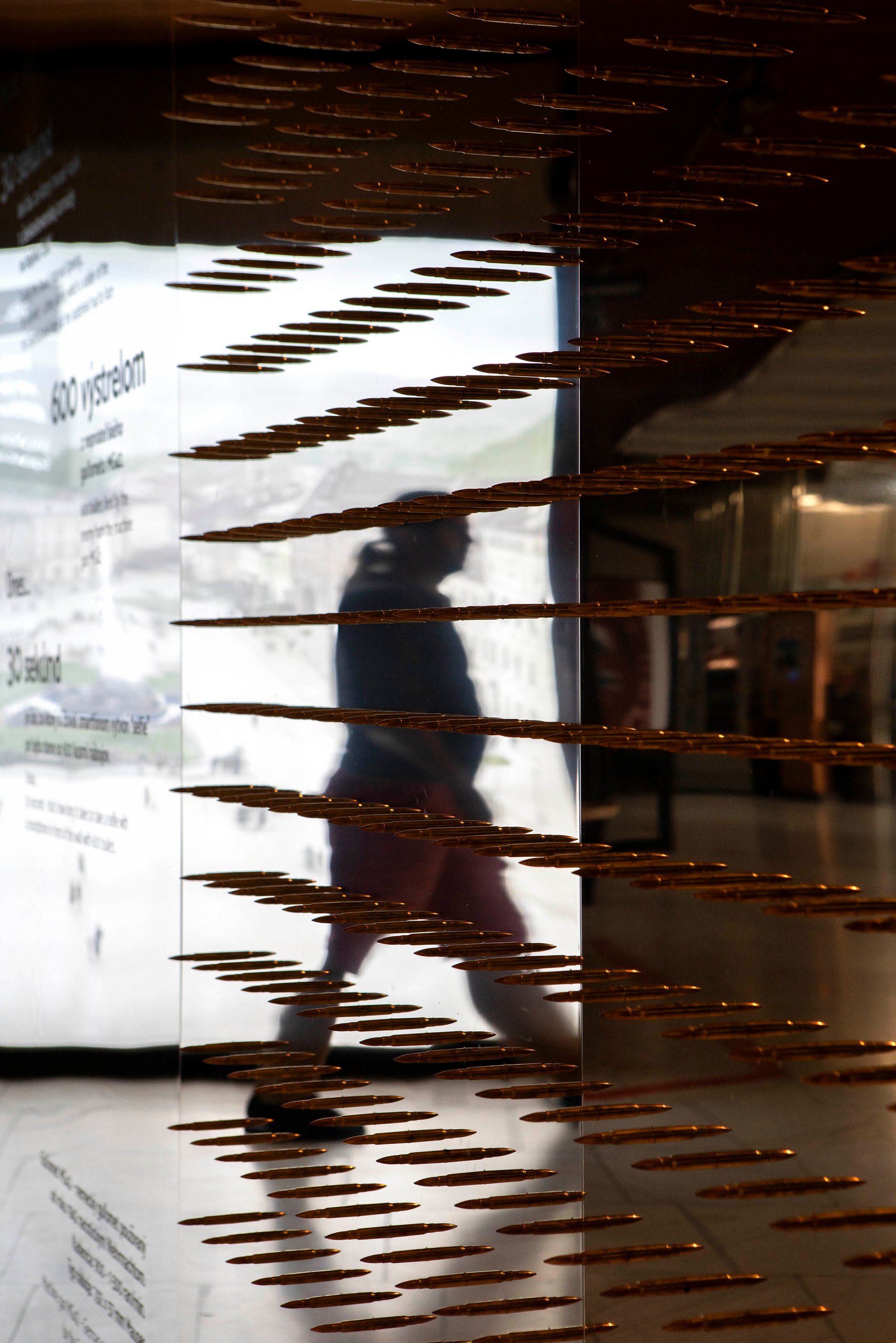 Cesta začína už vo vstupnej hale, kde návštevník narazí na zrkadlovú stenu so šiestimi stovkami “letiacich” nábojov. Výsledný efekt projektilov smerujúcich na pozorovateľa necháva tušiť, čo bude nasledovať. Zaujímavosťou je, že tento silný moment pôvodne nemusel byť realizovaný. Architekti prekročili hranice určeného priestoru, zasiahli aj do foyeru. Presvedčili investora, že výstava by mala mať dôstojné predpolie a nemala by začínať “za dverami”.