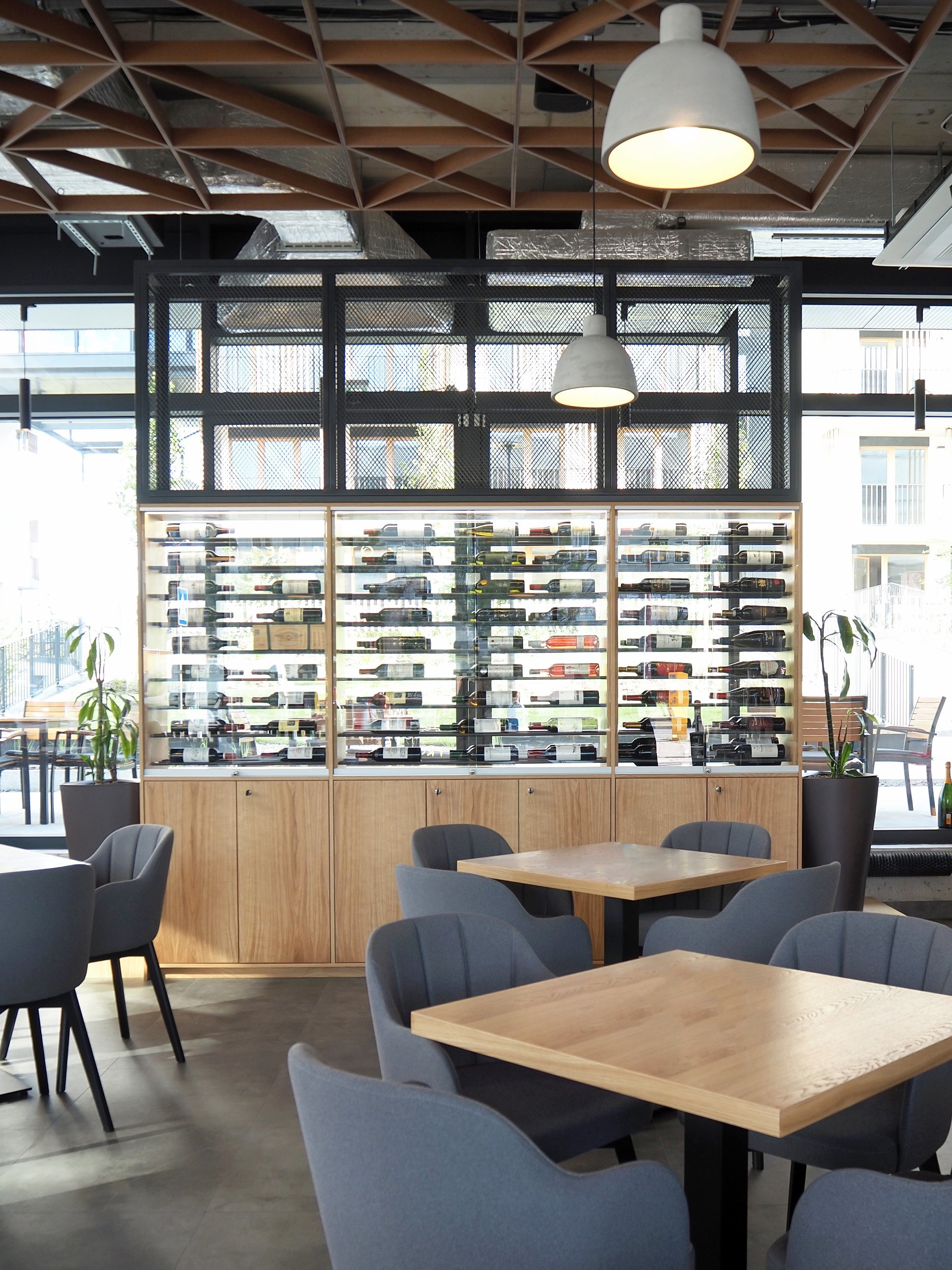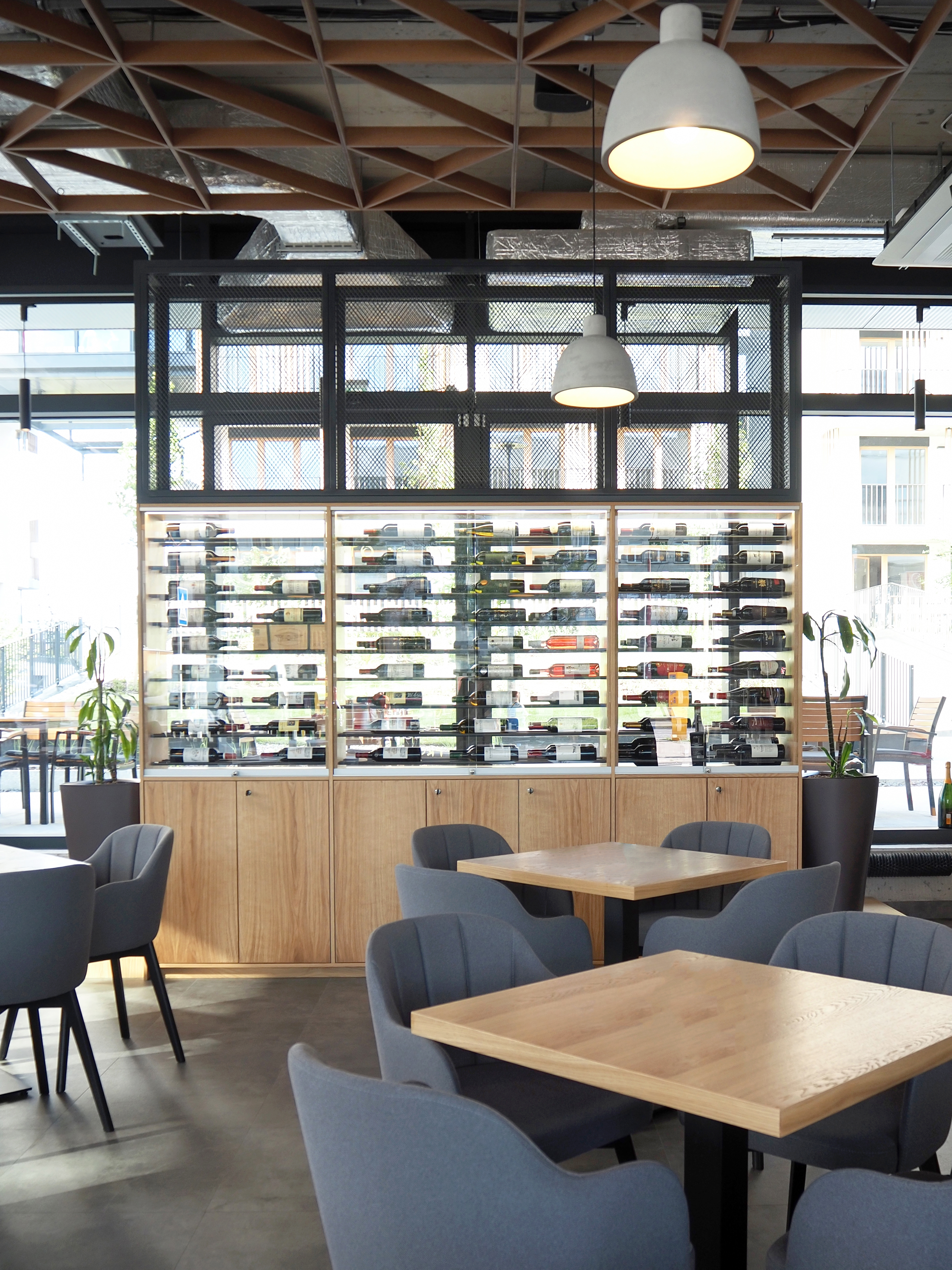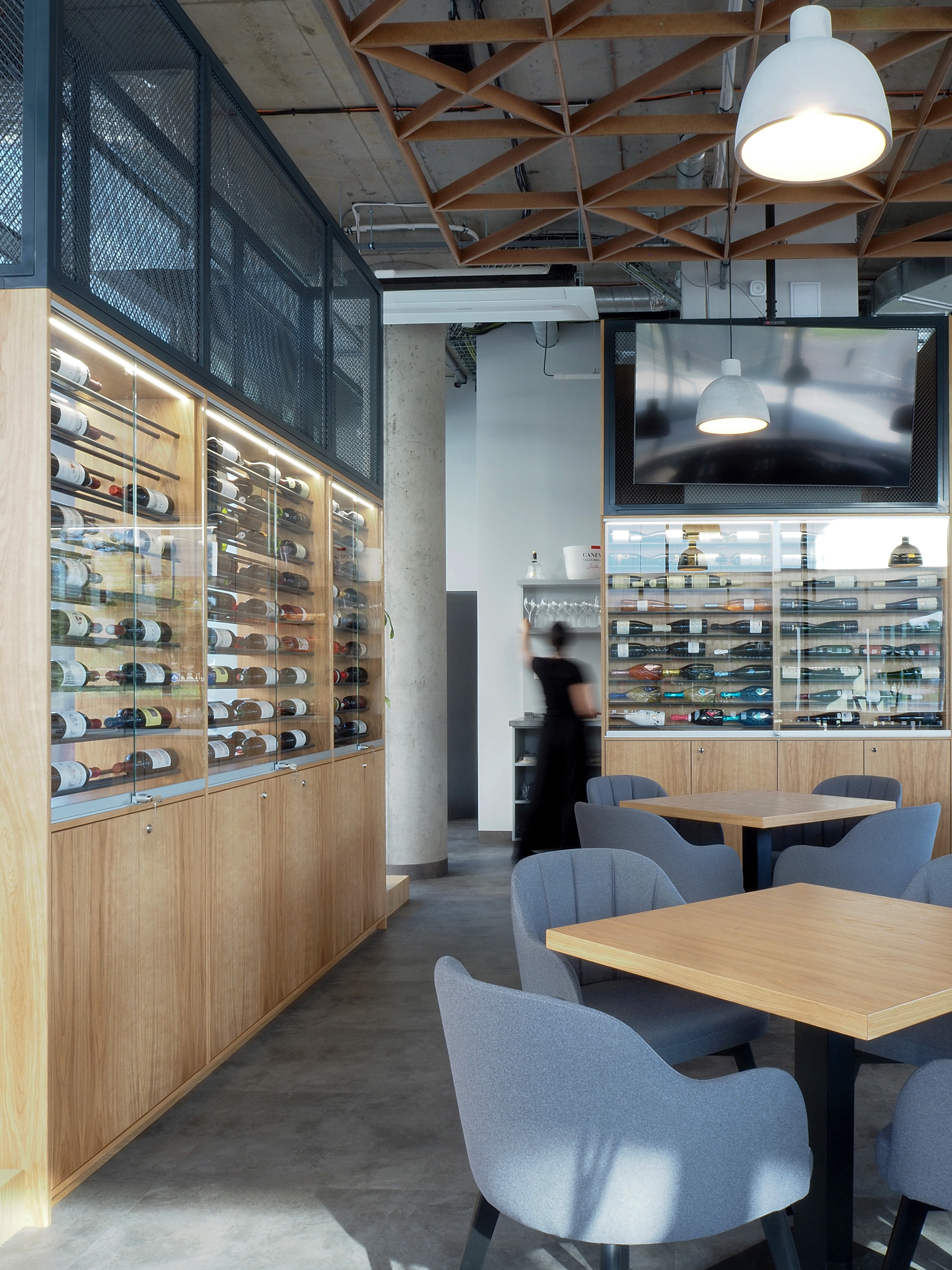 Prvým dominantným prvkom je drevený pult lemujúci presklenú fasádu. Pult smerom do exteriéru prezentuje okoloidúcim víno a z vnútornej strany poskytuje návštevníkom priestor na sedenie s možnosťou vizuálnej komunikácie s okolím. Druhým prvkom je drevená vitrína s presklením, ktorej súčasťou sú drevené schody smerujúce na zadnú terasu. Tento prvok tvorí pomyselnú vstupnú bránu a zároveň obojstranné presklenie vitríny. Okrem prezentácie vín, poskytuje výhľad na atraktívny vnútroblok bytového komplexu. Tretím prvkom je barový pult, ktorého oblý tvar a poloha vychádza z charakteru celého priestoru. Použitým materiálom je oceľ v kombinácii s ťahokovom. Umelé osvetlenie je realizované systémom rámp pre zaručenie variability v budúcnosti.
