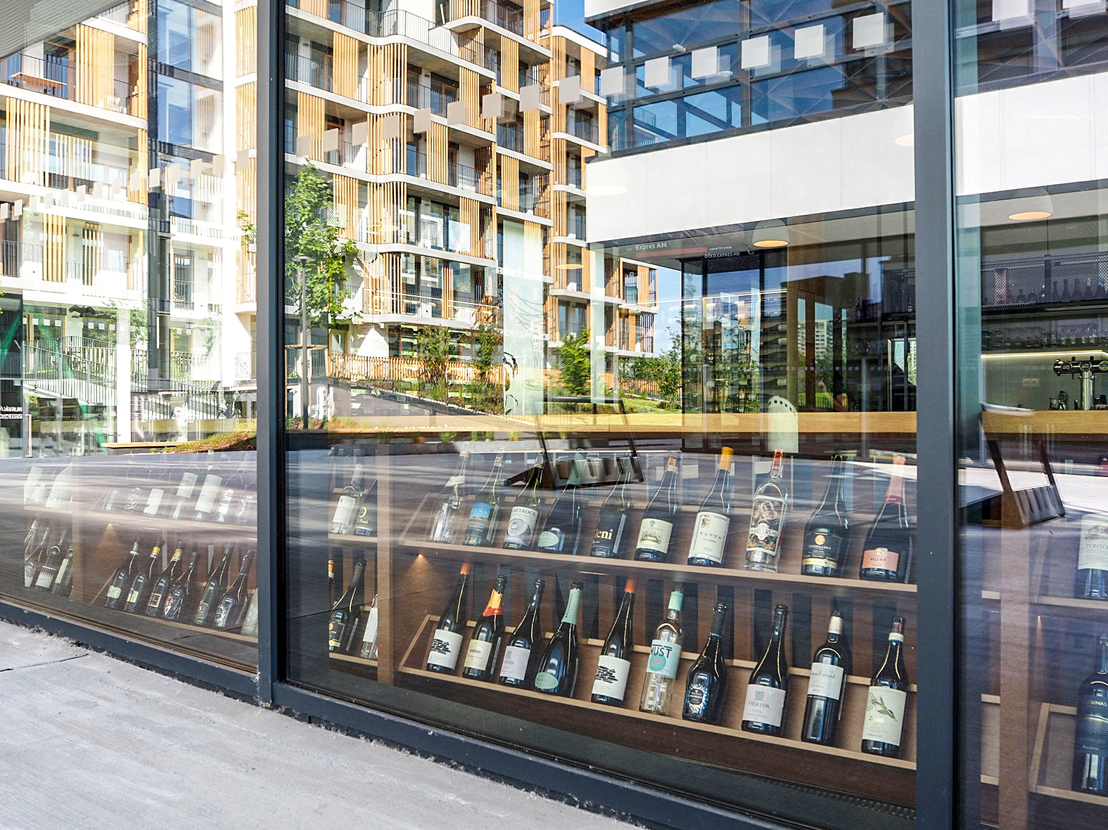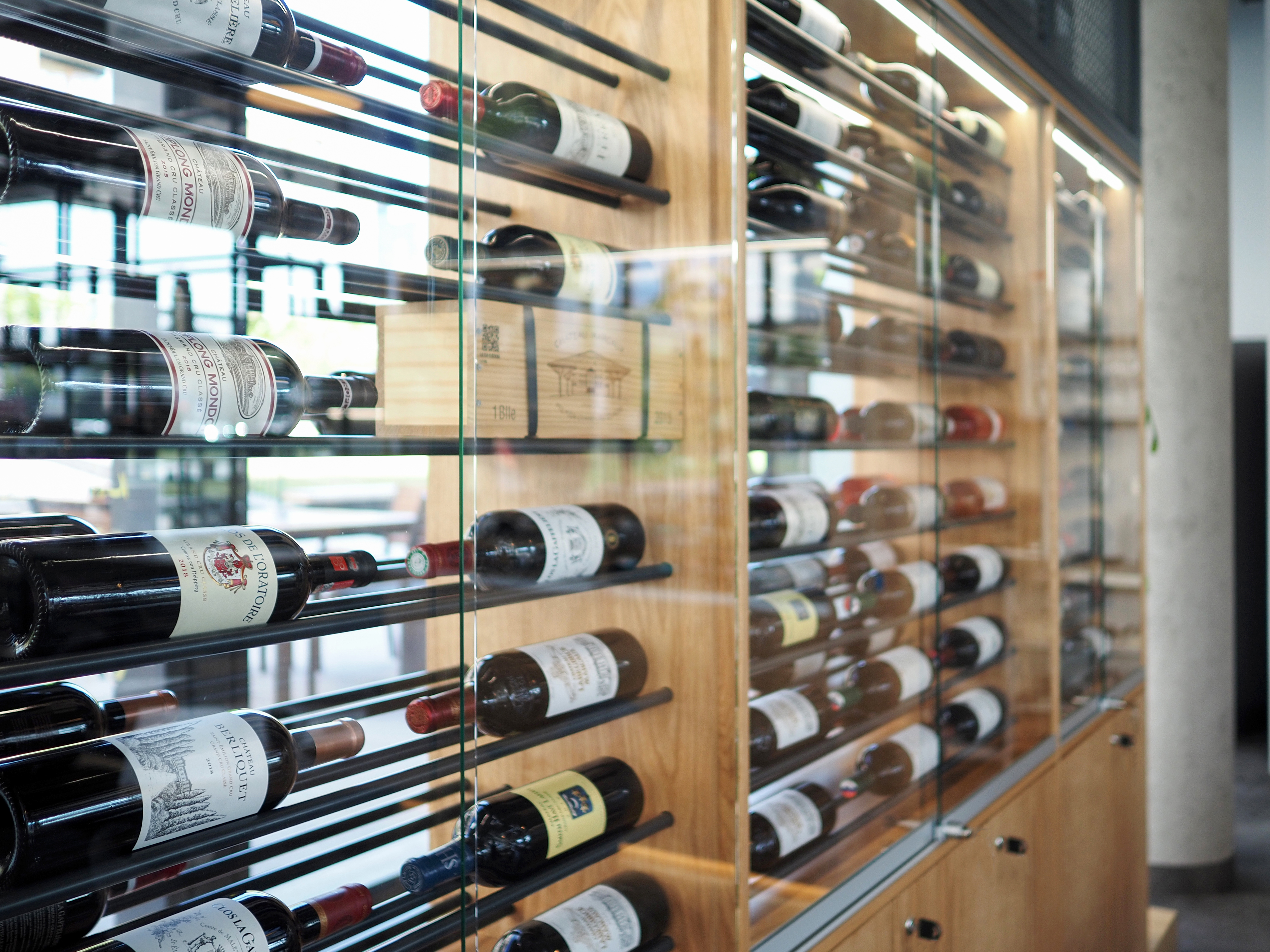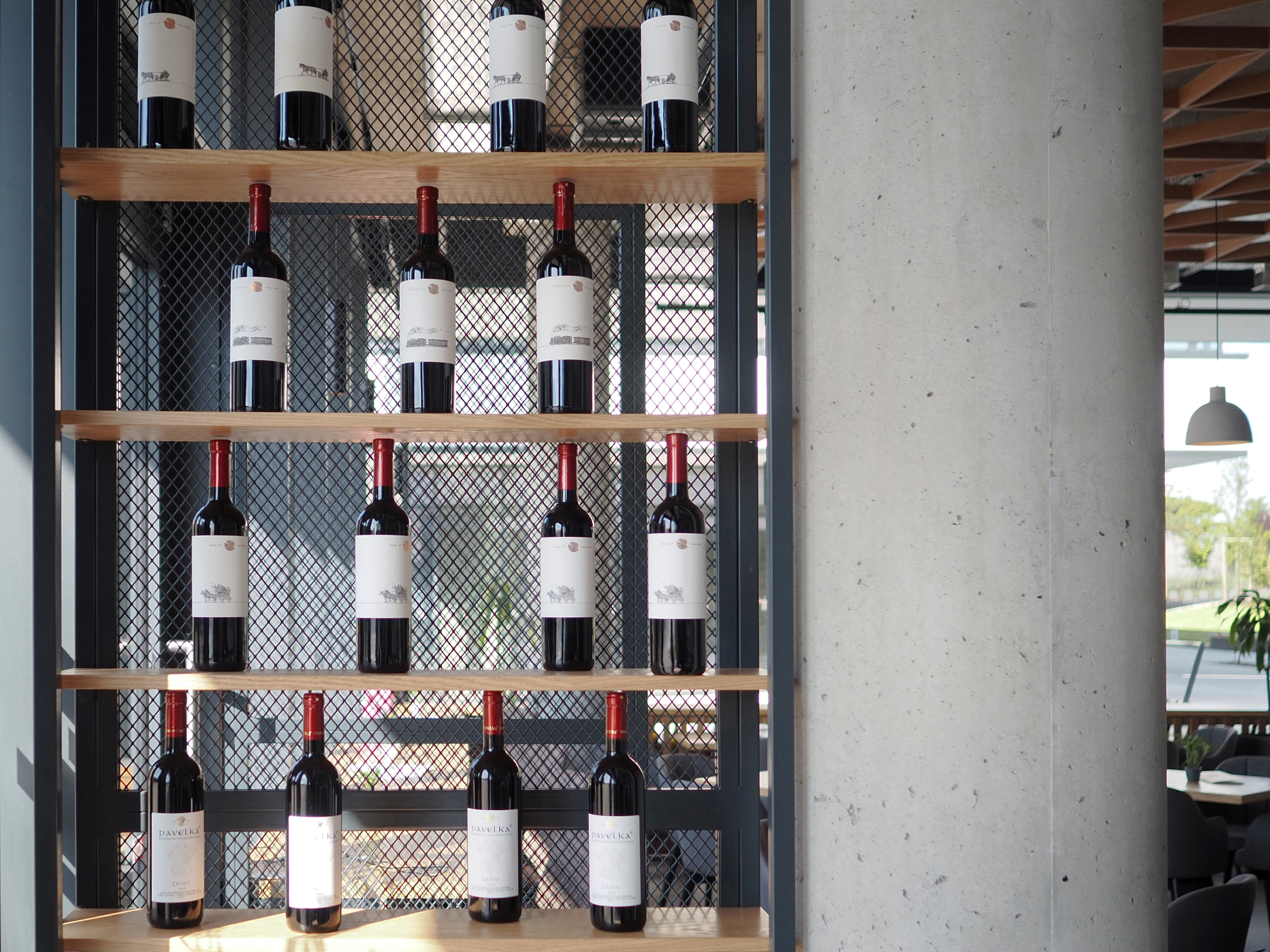 Prvým dominantným prvkom je drevený pult lemujúci presklenú fasádu. Pult smerom do exteriéru prezentuje okoloidúcim víno a z vnútornej strany poskytuje návštevníkom priestor na sedenie s možnosťou vizuálnej komunikácie s okolím. Druhým prvkom je drevená vitrína s presklením, ktorej súčasťou sú drevené schody smerujúce na zadnú terasu. Tento prvok tvorí pomyselnú vstupnú bránu a zároveň obojstranné presklenie vitríny. Okrem prezentácie vín, poskytuje výhľad na atraktívny vnútroblok bytového komplexu. Tretím prvkom je barový pult, ktorého oblý tvar a poloha vychádza z charakteru celého priestoru. Použitým materiálom je oceľ v kombinácii s ťahokovom. Umelé osvetlenie je realizované systémom rámp pre zaručenie variability v budúcnosti.