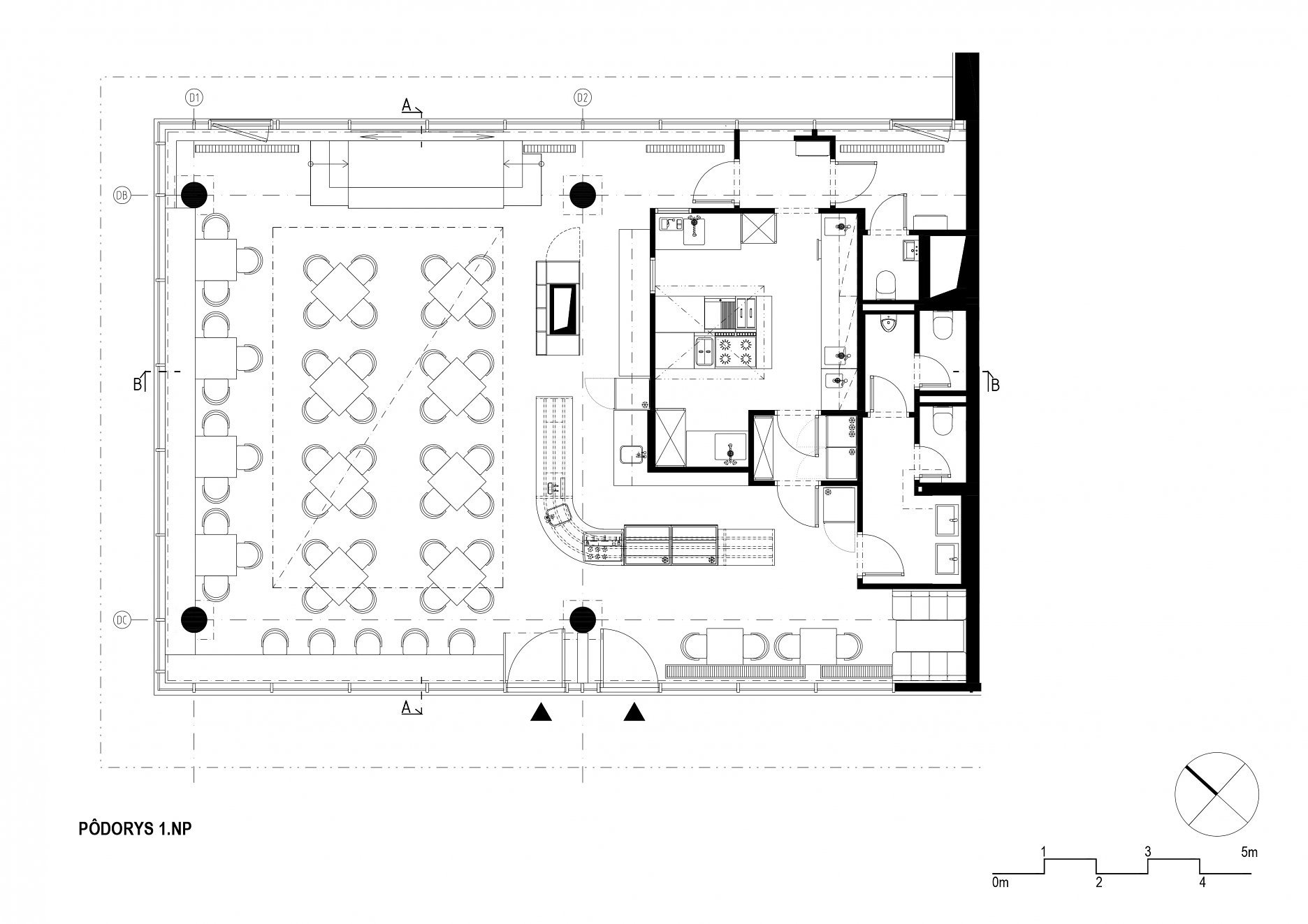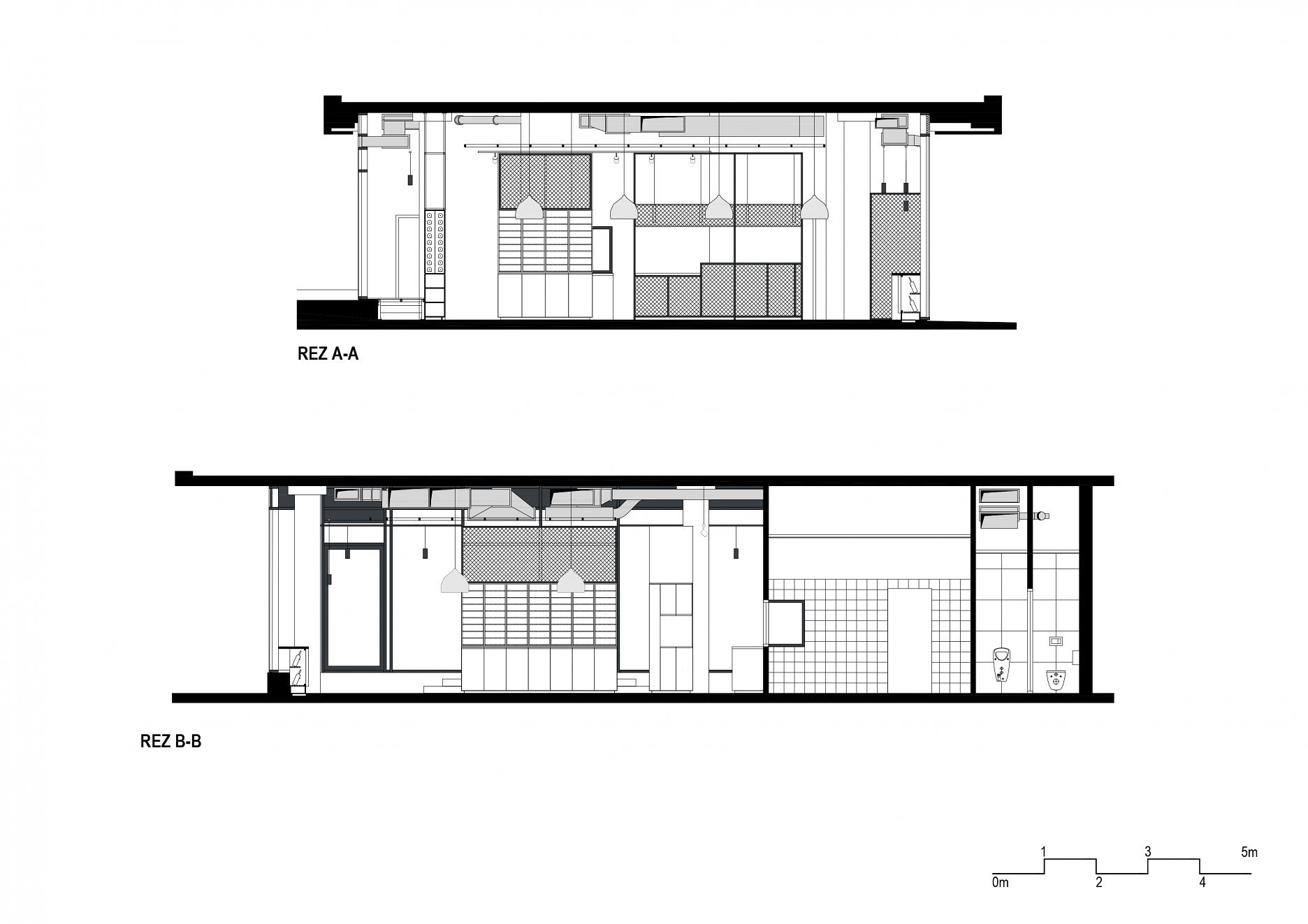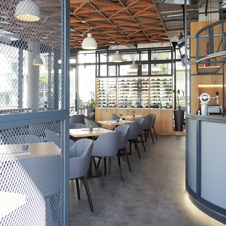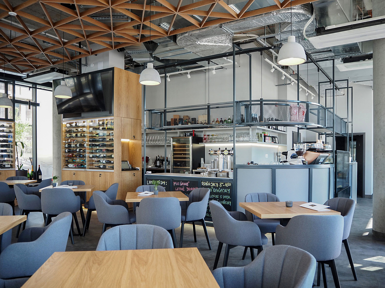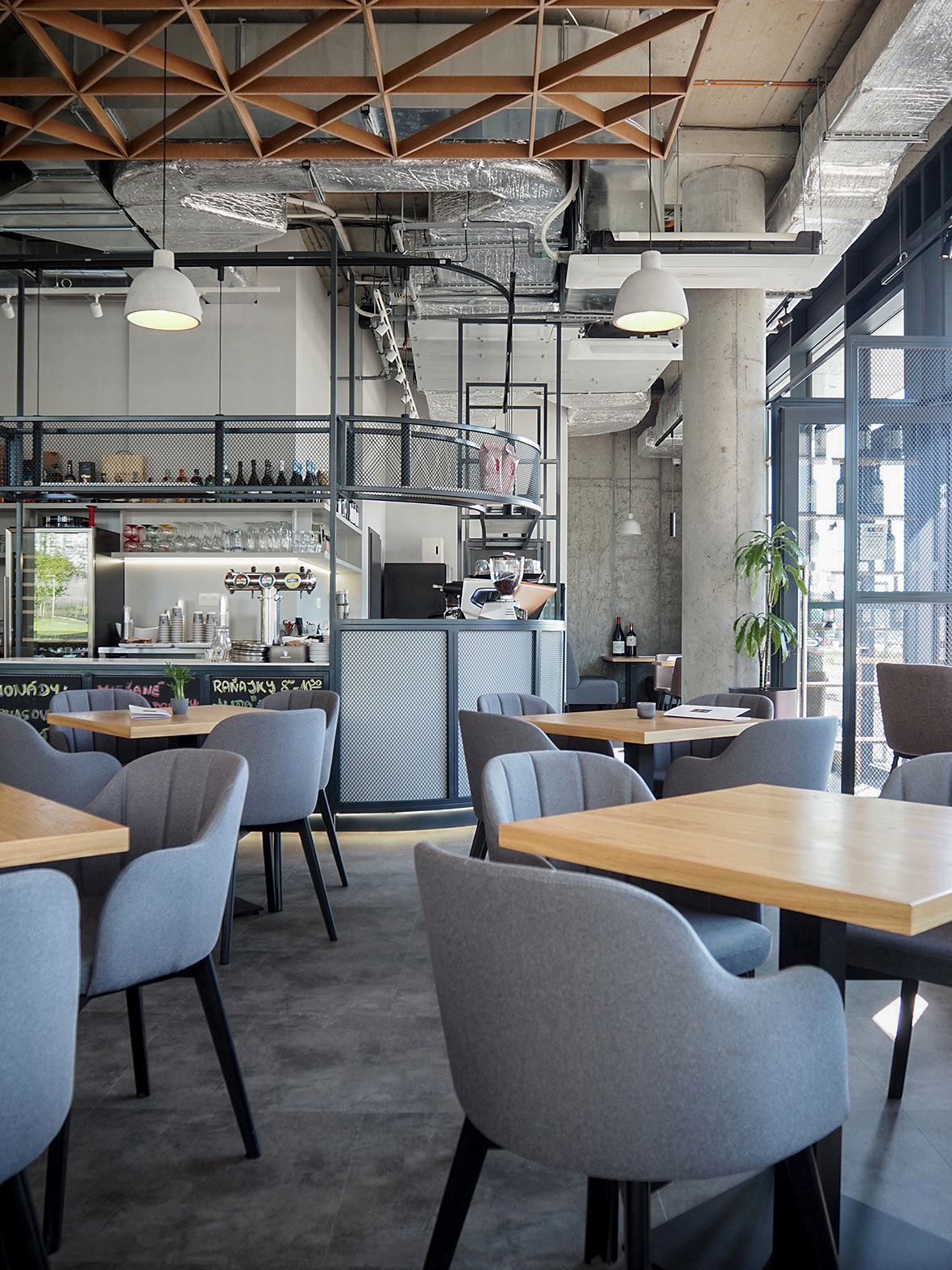 Návrh je rozdelený na dve časti, prvá časť - zázemie s kuchyňou a druhá časť - reštaurácia. Pomerne skromný odbytový priestor sme sa snažili čo najefektívnejšie využiť. Po vizuálnej stránke sme sa rozhodli zachovať všetky pôvodné materiály, surové betónové prvky a technické rozvody, čo má za úlohu zdôrazniť charakter priestoru. Nové navrhované prvky sú kombináciou ocele a ťahokovu ako súčasť industriálne ladeného objektu. Zároveň sme použili prírodný materiál - drevo, ktorý do celého priestoru vnáša teplo a robí ho útulným a ideálnym miestom aj na dlhšie posedenia.