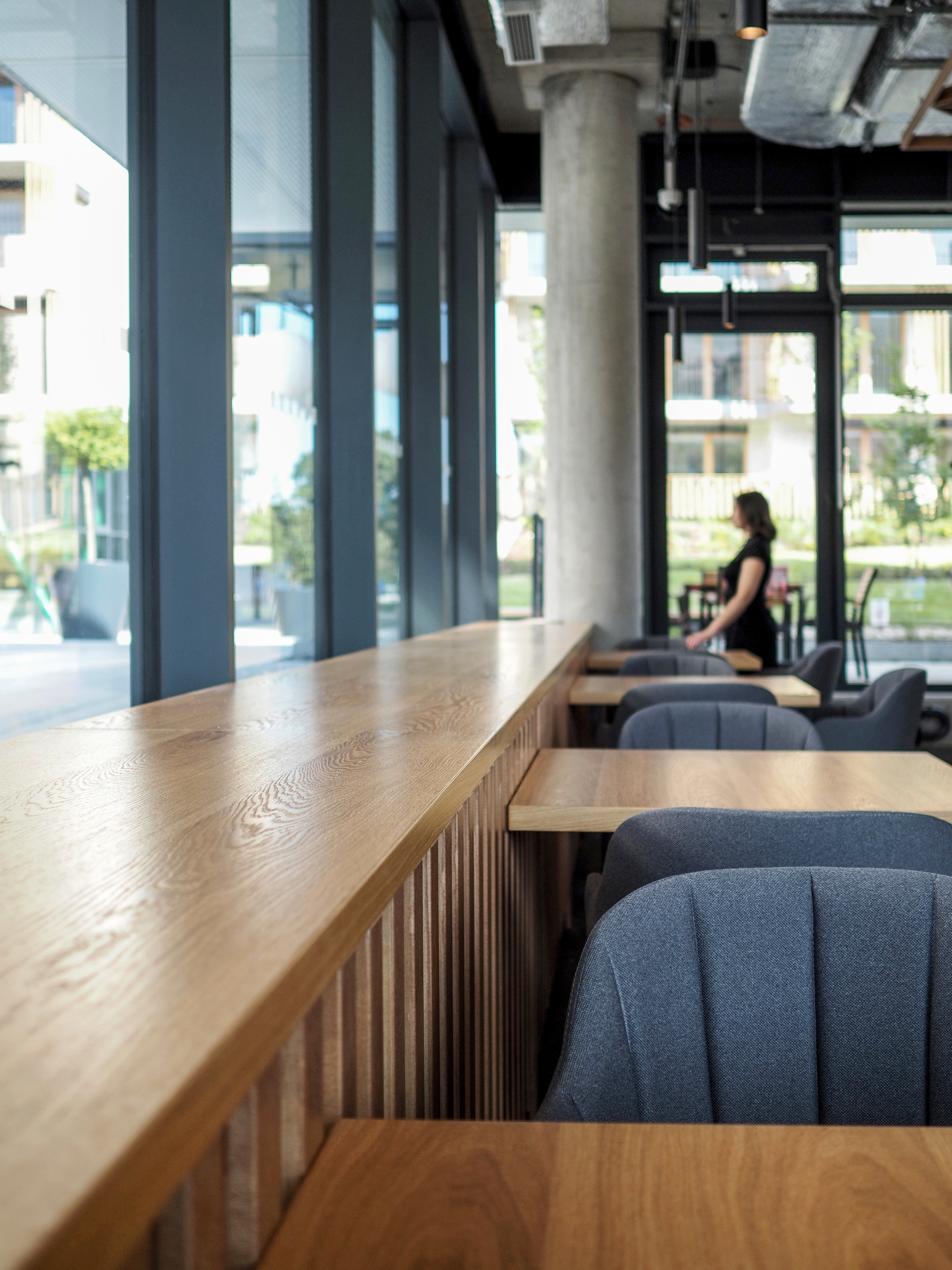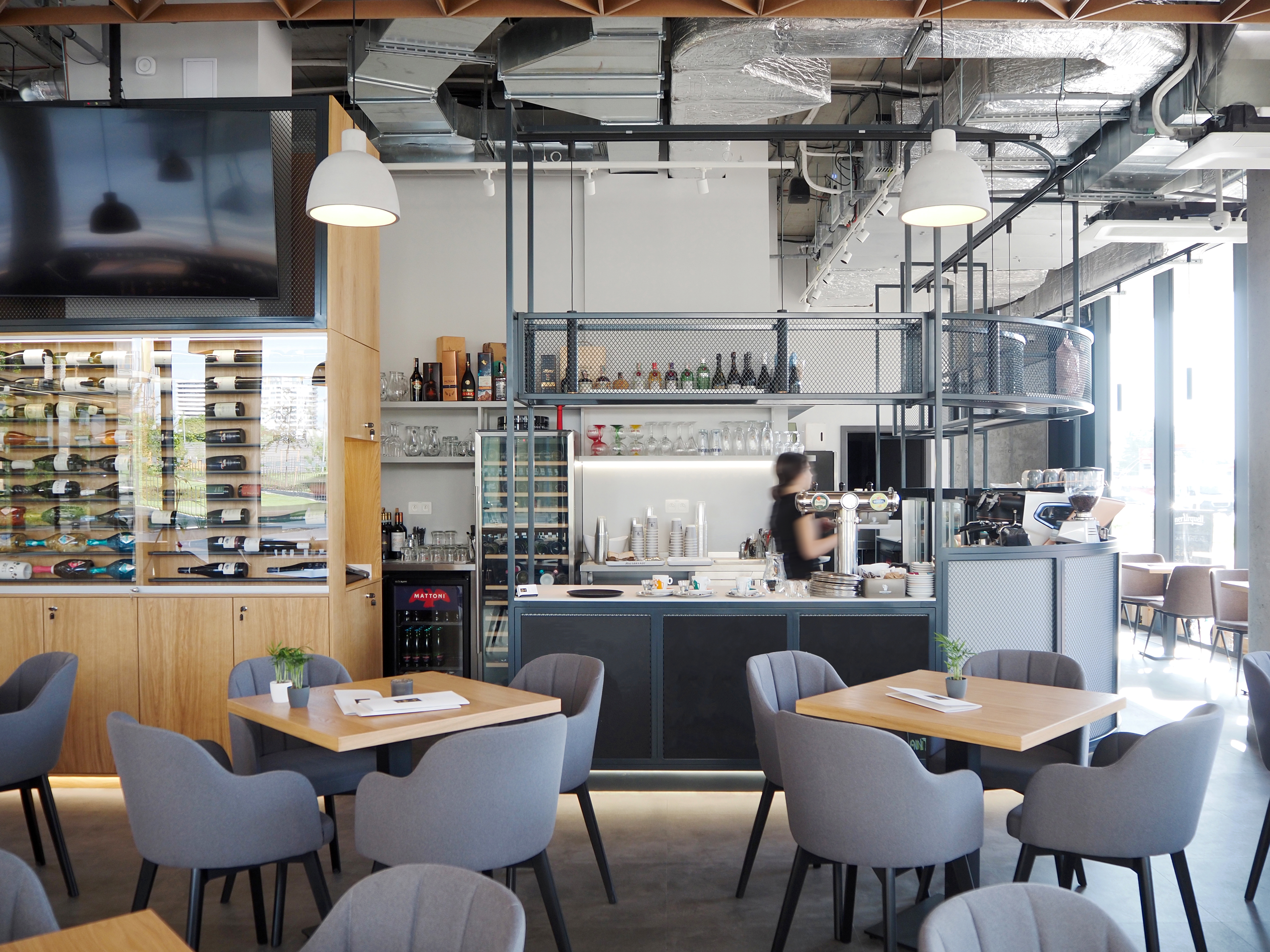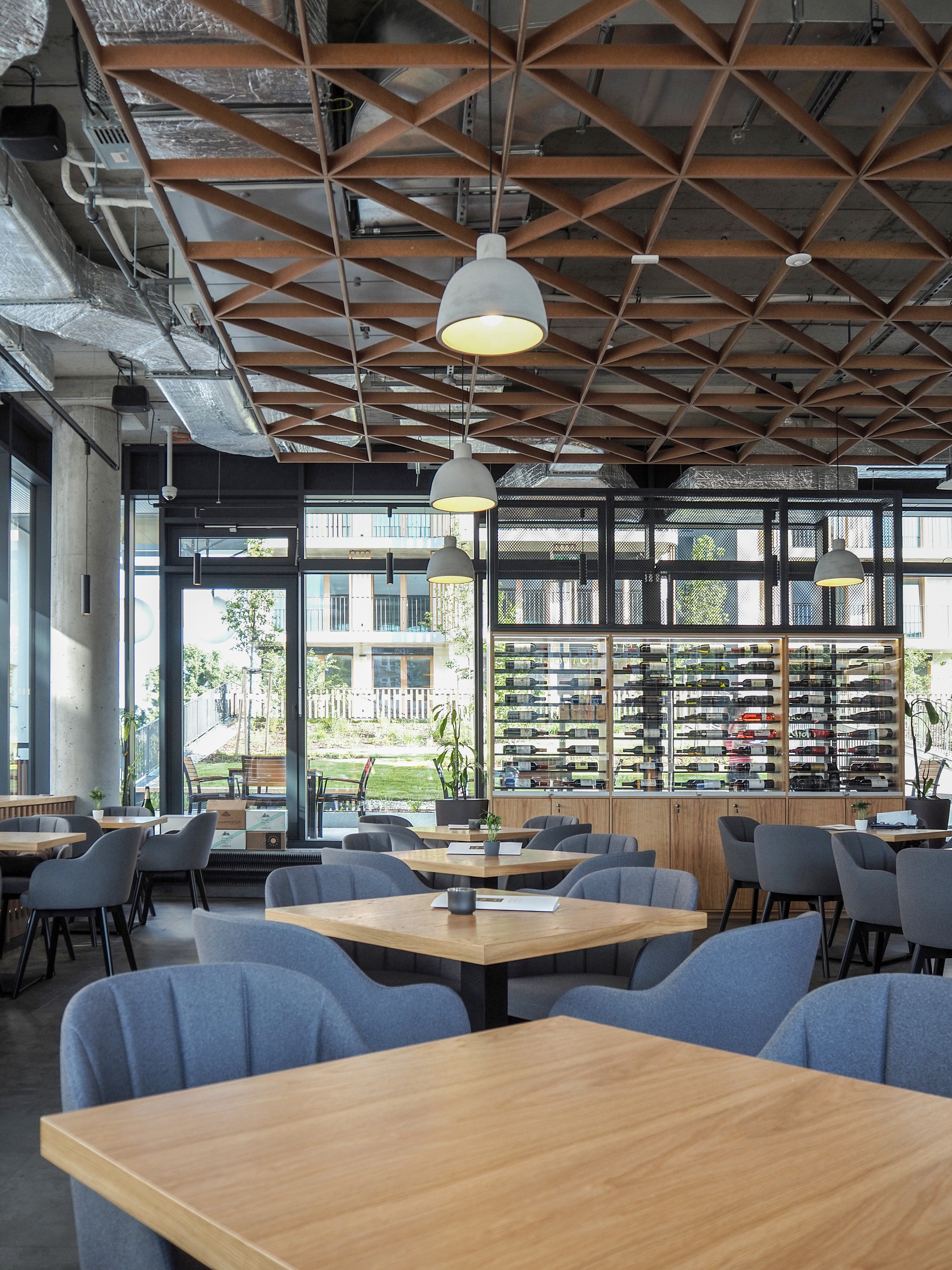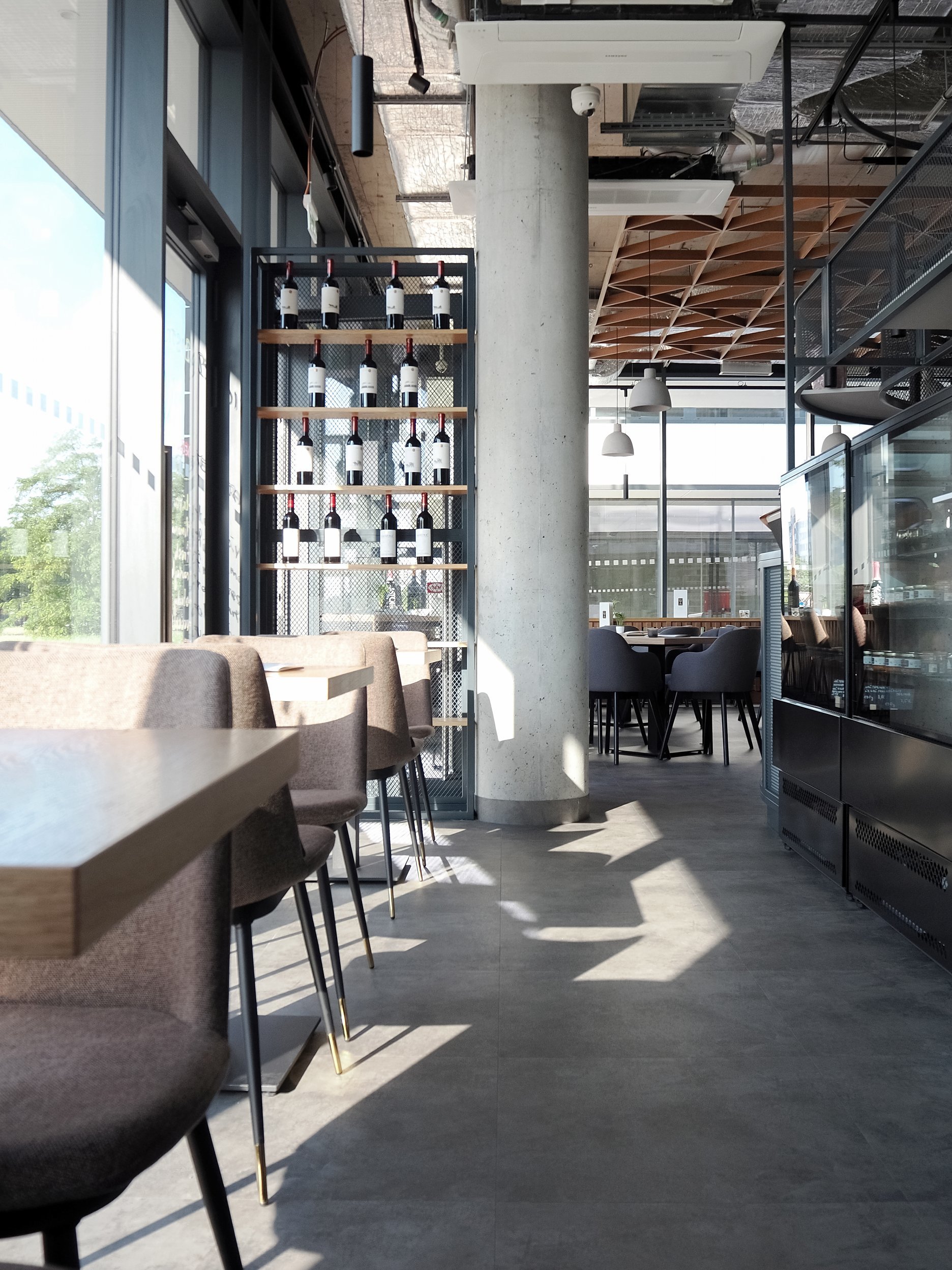 Návrh je rozdelený na dve časti, prvá časť - zázemie s kuchyňou a druhá časť - reštaurácia. Pomerne skromný odbytový priestor sme sa snažili čo najefektívnejšie využiť. Po vizuálnej stránke sme sa rozhodli zachovať všetky pôvodné materiály, surové betónové prvky a technické rozvody, čo má za úlohu zdôrazniť charakter priestoru. Nové navrhované prvky sú kombináciou ocele a ťahokovu ako súčasť industriálne ladeného objektu. Zároveň sme použili prírodný materiál - drevo, ktorý do celého priestoru vnáša teplo a robí ho útulným a ideálnym miestom aj na dlhšie posedenia.