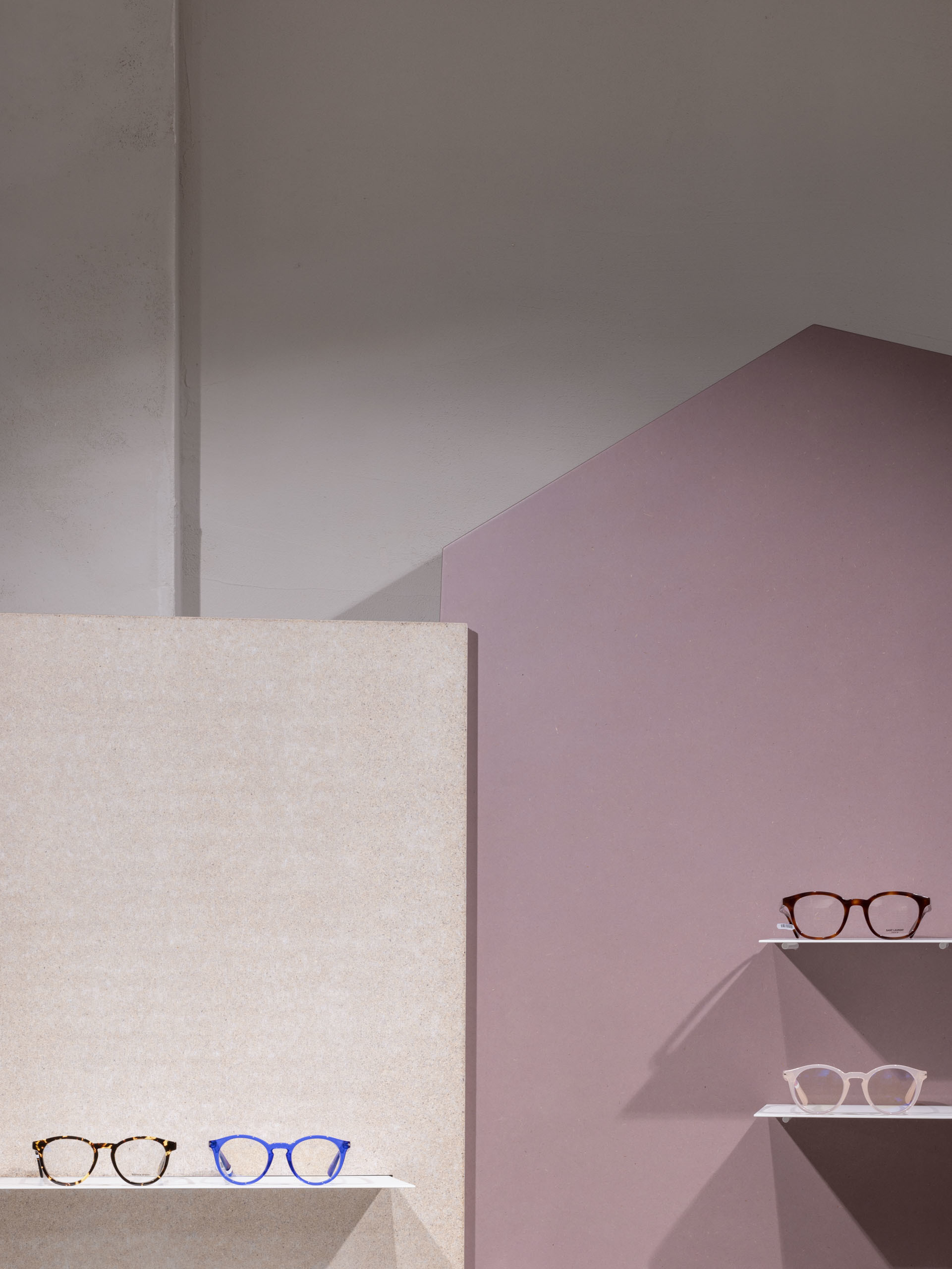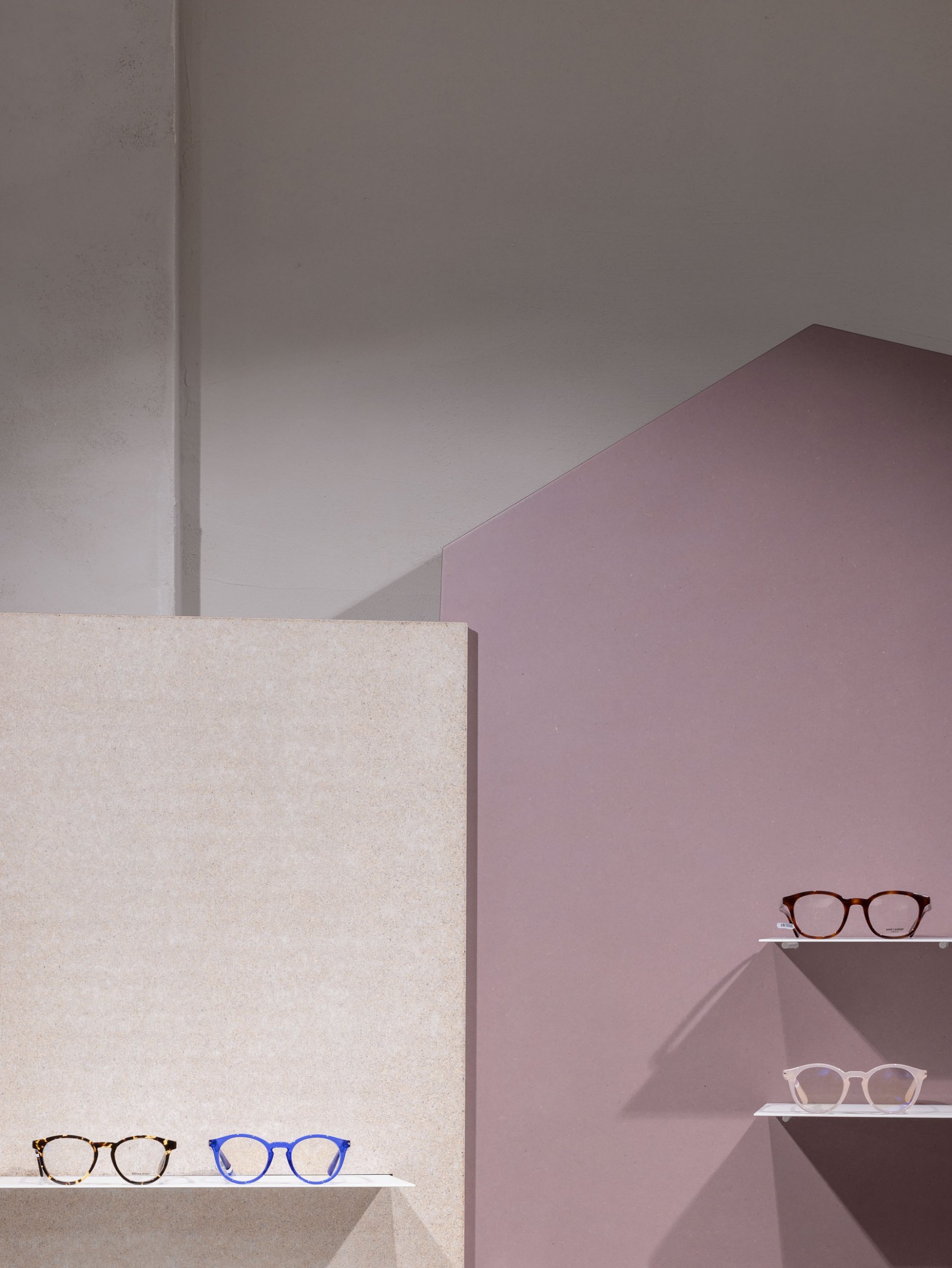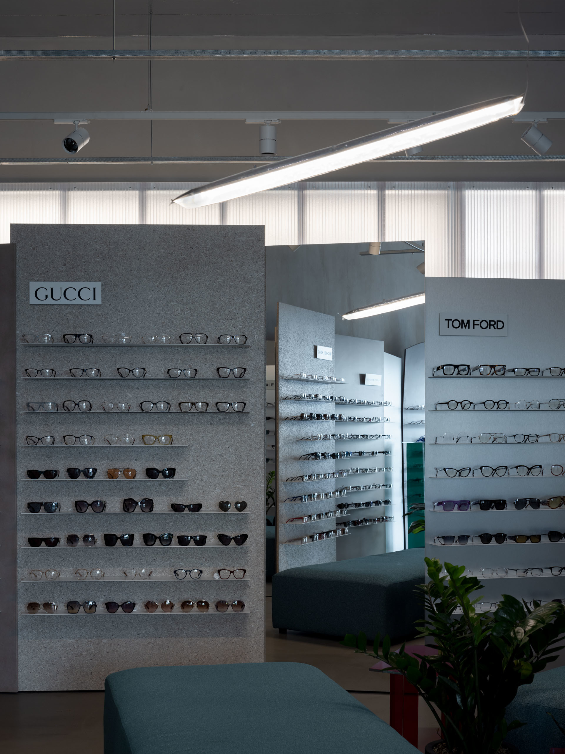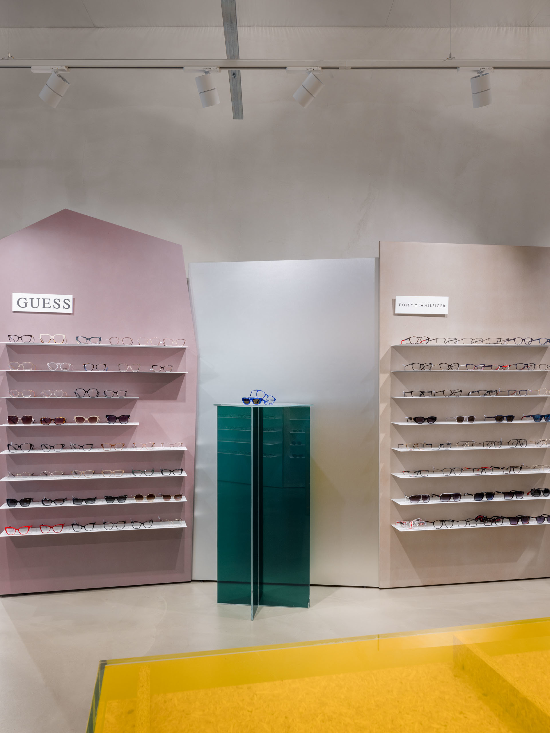 Využívame maximálnym výrobným rozmer materiálu a redukujeme tak množstvo odpadu pri jeho formátovaní. Túto základnú štruktúru panelov vkladáme do surového priestoru s minimom zásahov. Pracujeme s betónovou podlahou či priznanými sádrovými omietkami bez finálnej úpravy. Priestor prirodzene delíme vloženou translucentnou stenou oddeľujúcou zázemie a vyšetrovňu od samotnej predajne. Nenarúšame tak hĺbku priestoru a zároveň si vzájomne presvetľujeme obe časti. Vzhľadom na hĺbku dispozície a nedostatok prirodzeného svetla pracujeme so sekundárne nasvieteným stropom so striebornou fóliou, ktorá nám ho rozptyľuje prirodzene do celého interiéru. Priestor dopĺňame transparentným skleneným mobiliárom ako pult či výstavné stolíky v niekoľkých farbách, ktoré vytvárajú rôzne reflexie svetla tak ako šošovky v okuliaroch.