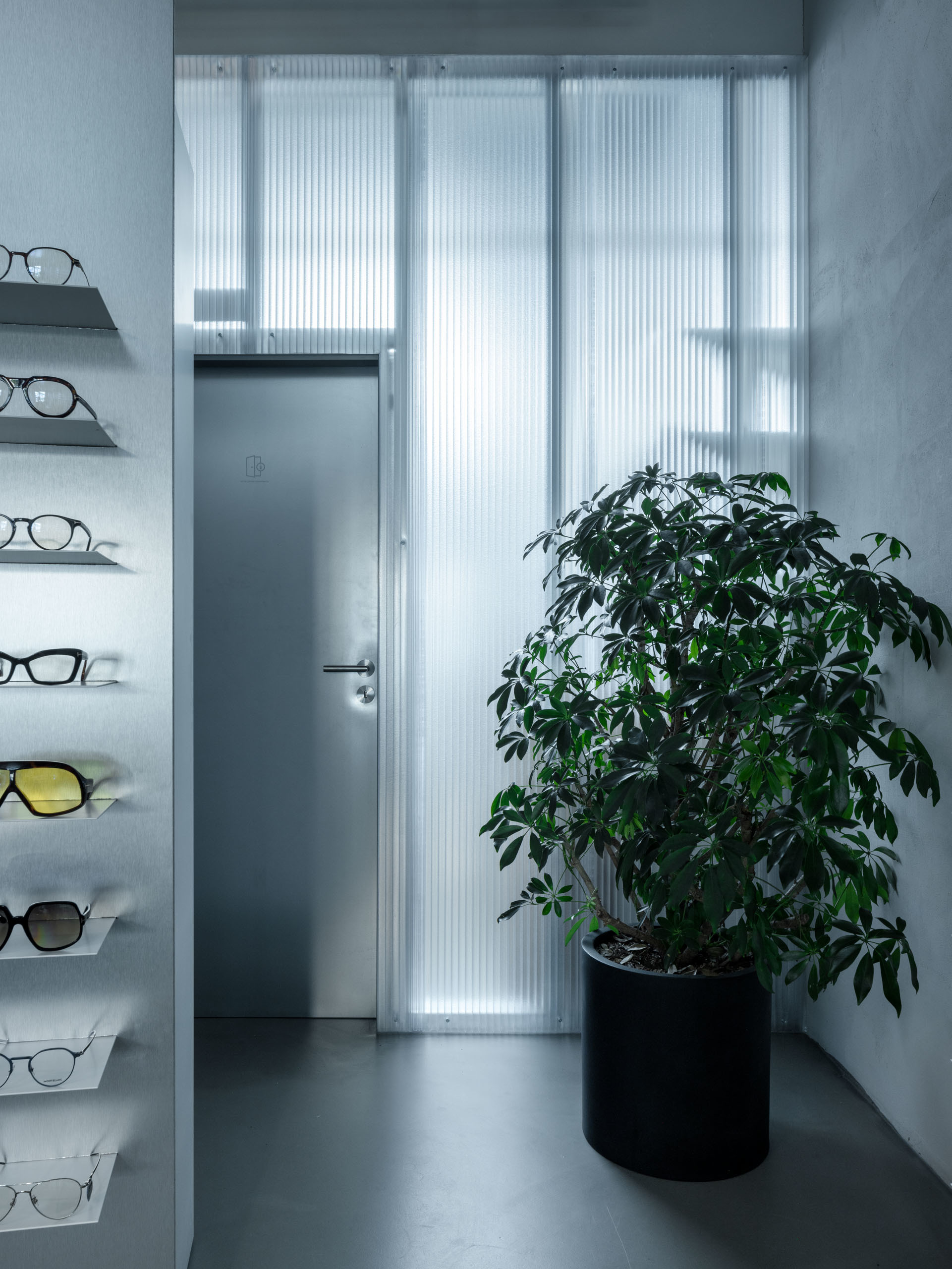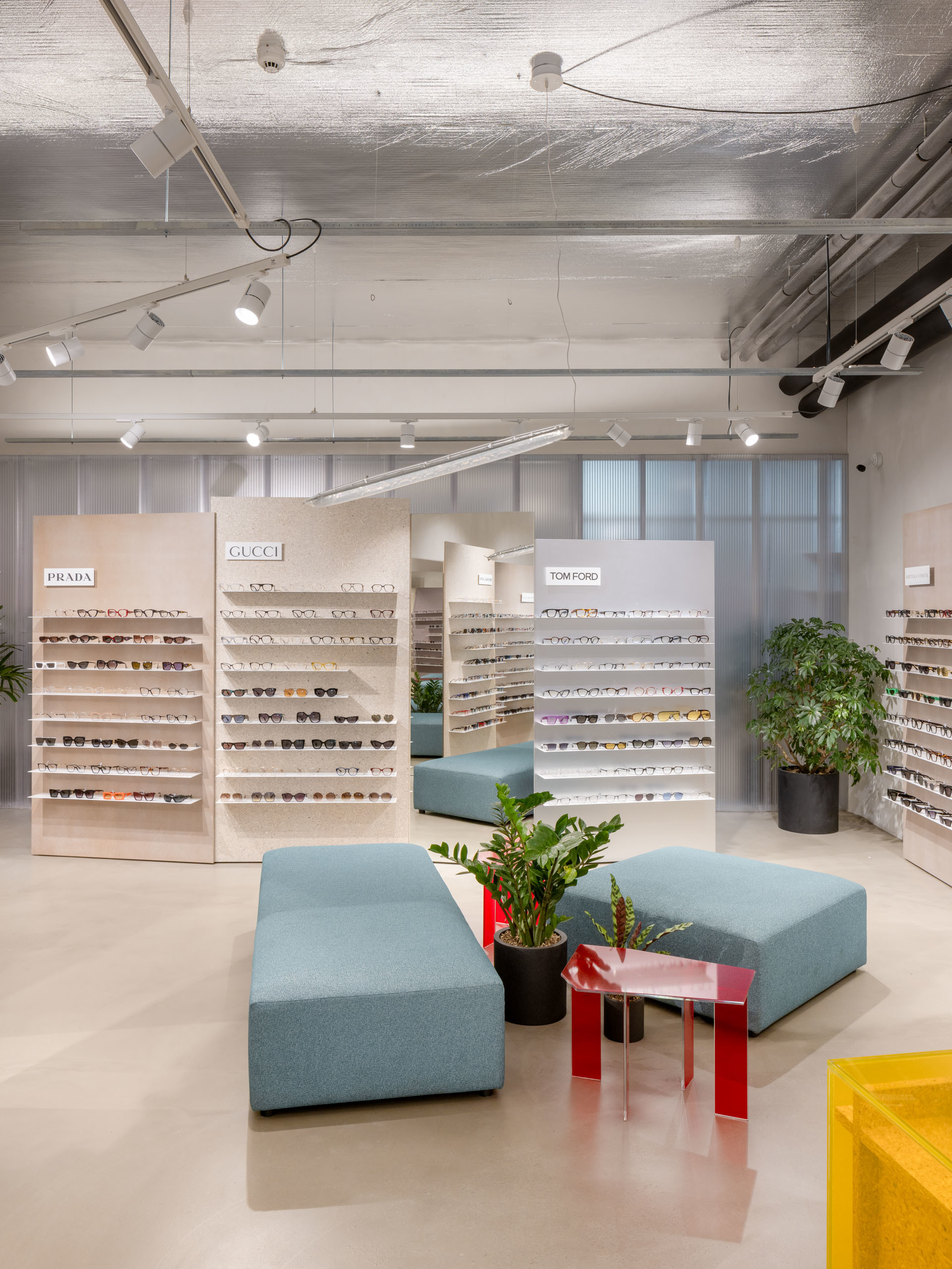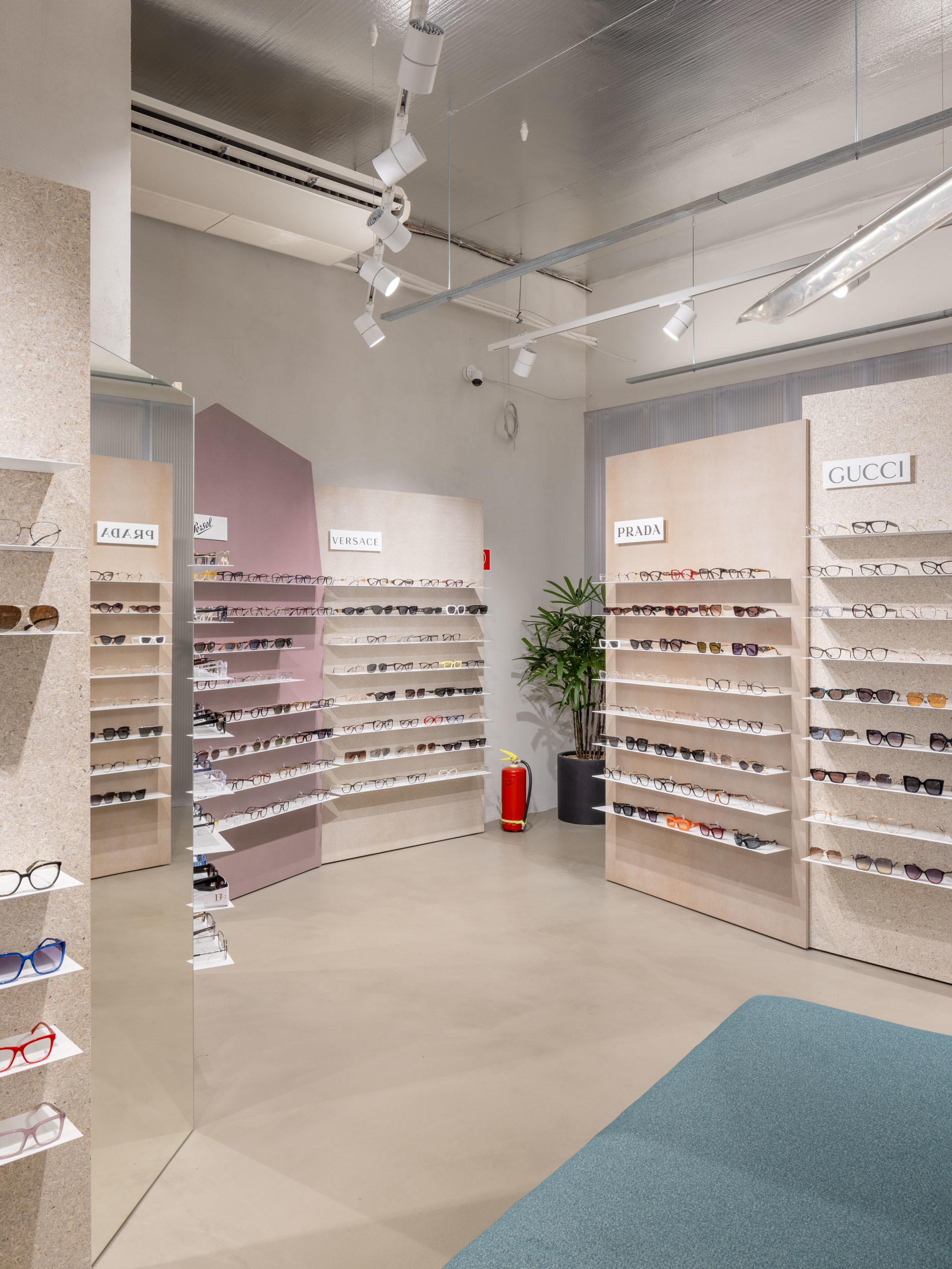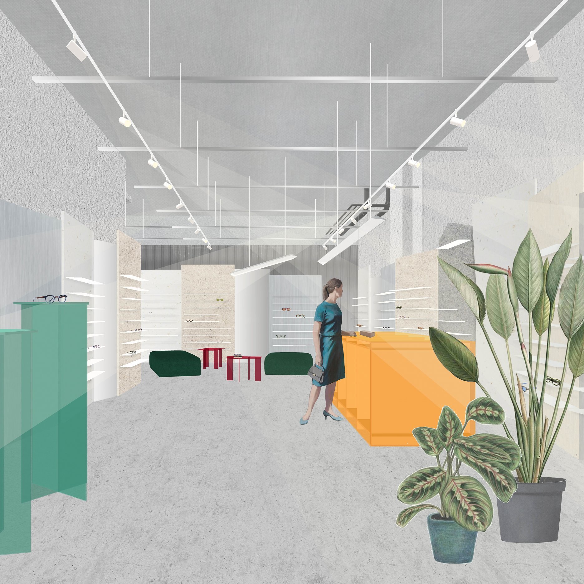 Využívame maximálnym výrobným rozmer materiálu a redukujeme tak množstvo odpadu pri jeho formátovaní. Túto základnú štruktúru panelov vkladáme do surového priestoru s minimom zásahov. Pracujeme s betónovou podlahou či priznanými sádrovými omietkami bez finálnej úpravy. Priestor prirodzene delíme vloženou translucentnou stenou oddeľujúcou zázemie a vyšetrovňu od samotnej predajne. Nenarúšame tak hĺbku priestoru a zároveň si vzájomne presvetľujeme obe časti. Vzhľadom na hĺbku dispozície a nedostatok prirodzeného svetla pracujeme so sekundárne nasvieteným stropom so striebornou fóliou, ktorá nám ho rozptyľuje prirodzene do celého interiéru. Priestor dopĺňame transparentným skleneným mobiliárom ako pult či výstavné stolíky v niekoľkých farbách, ktoré vytvárajú rôzne reflexie svetla tak ako šošovky v okuliaroch.