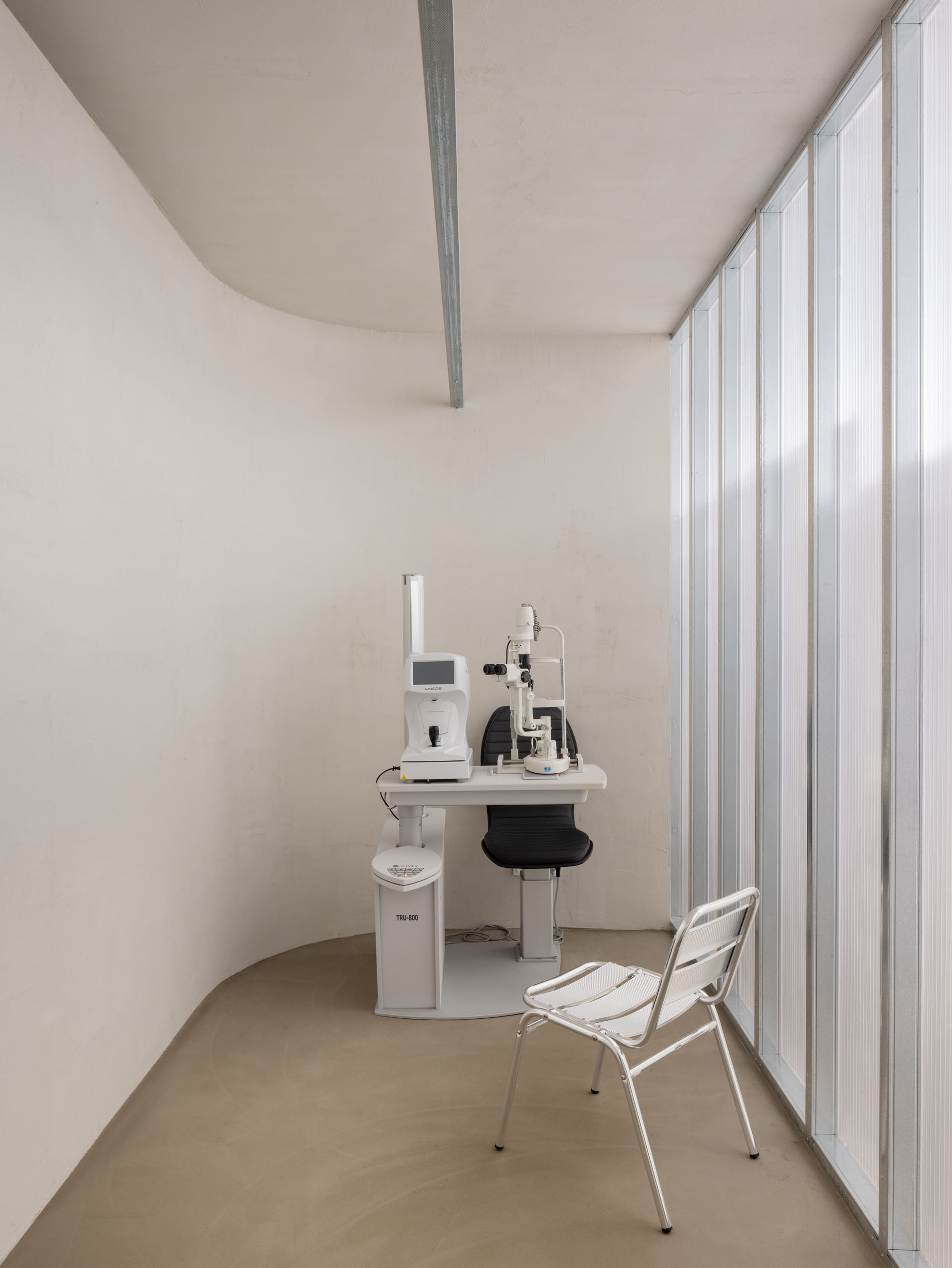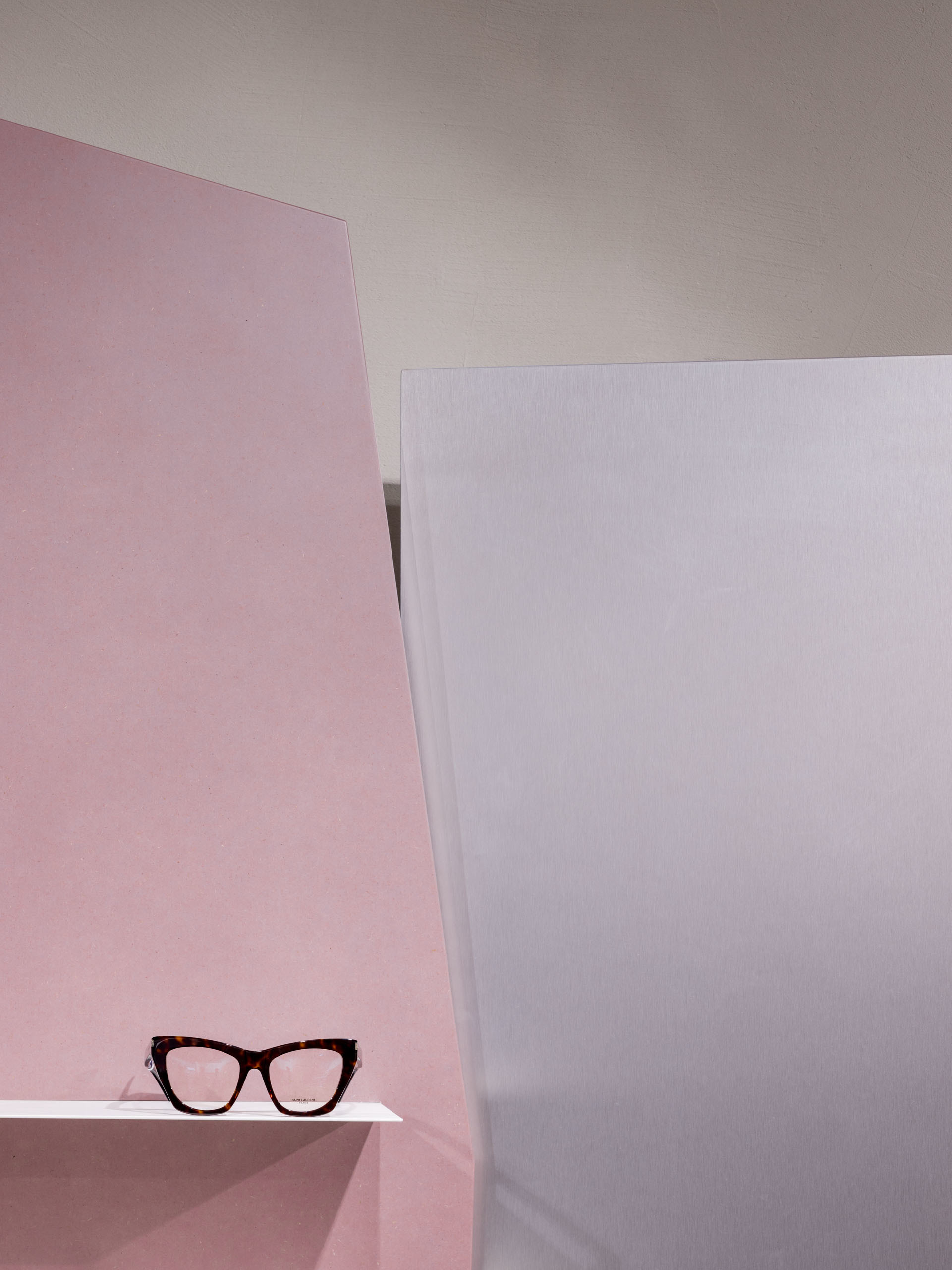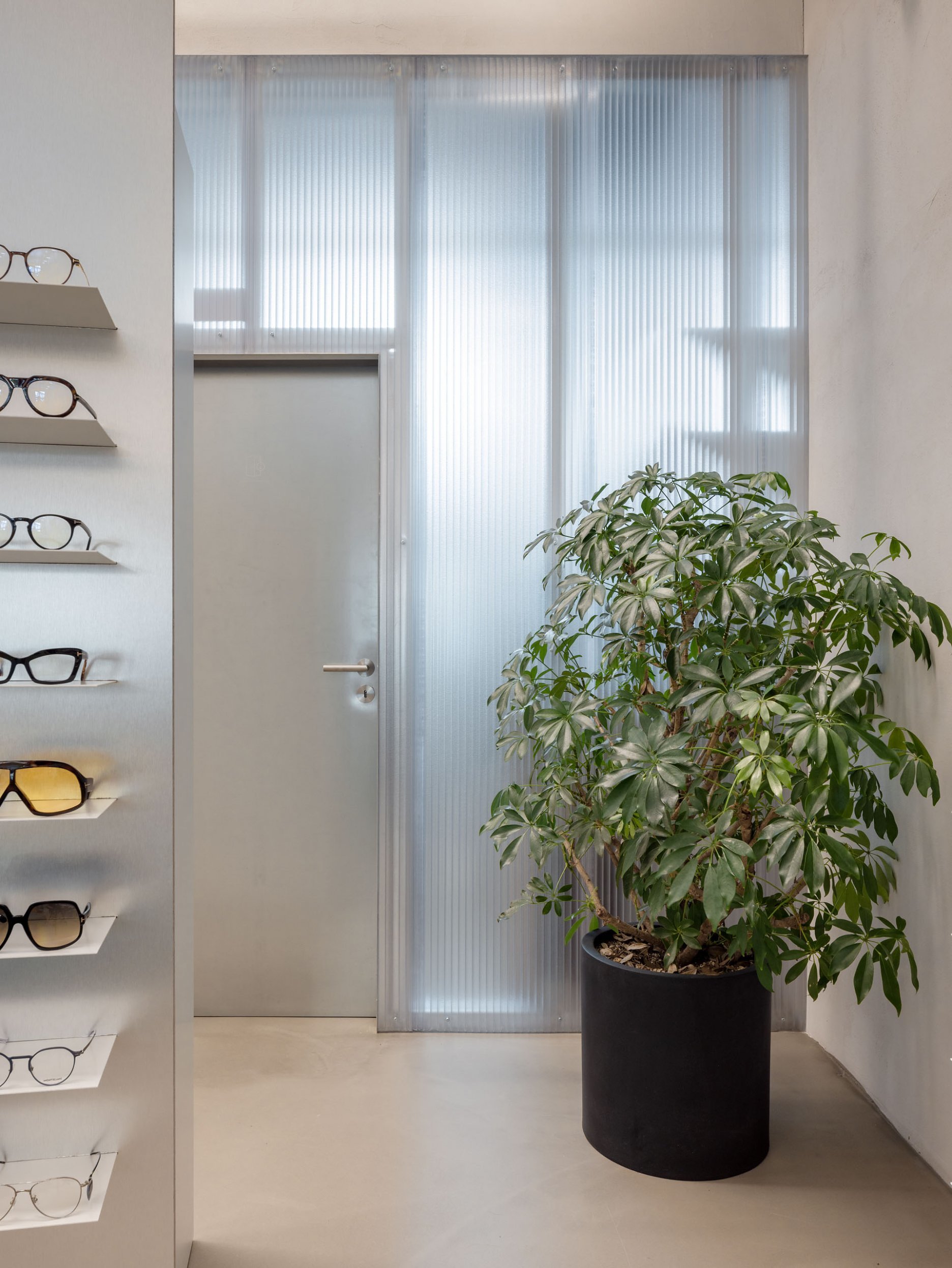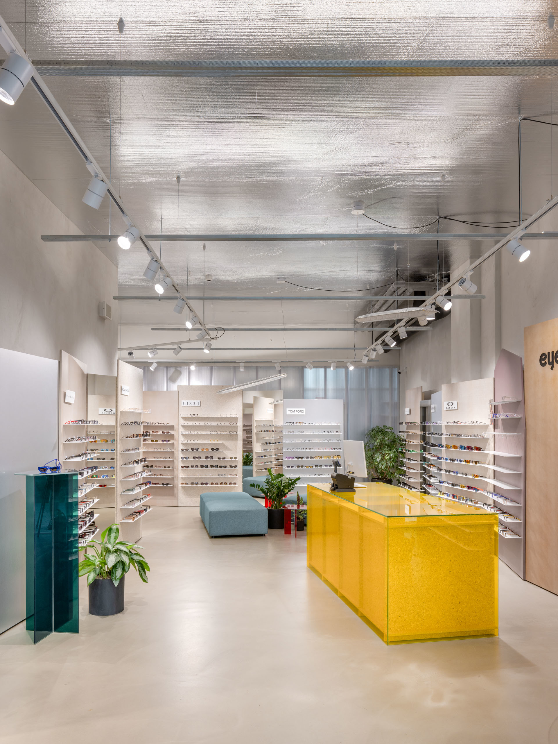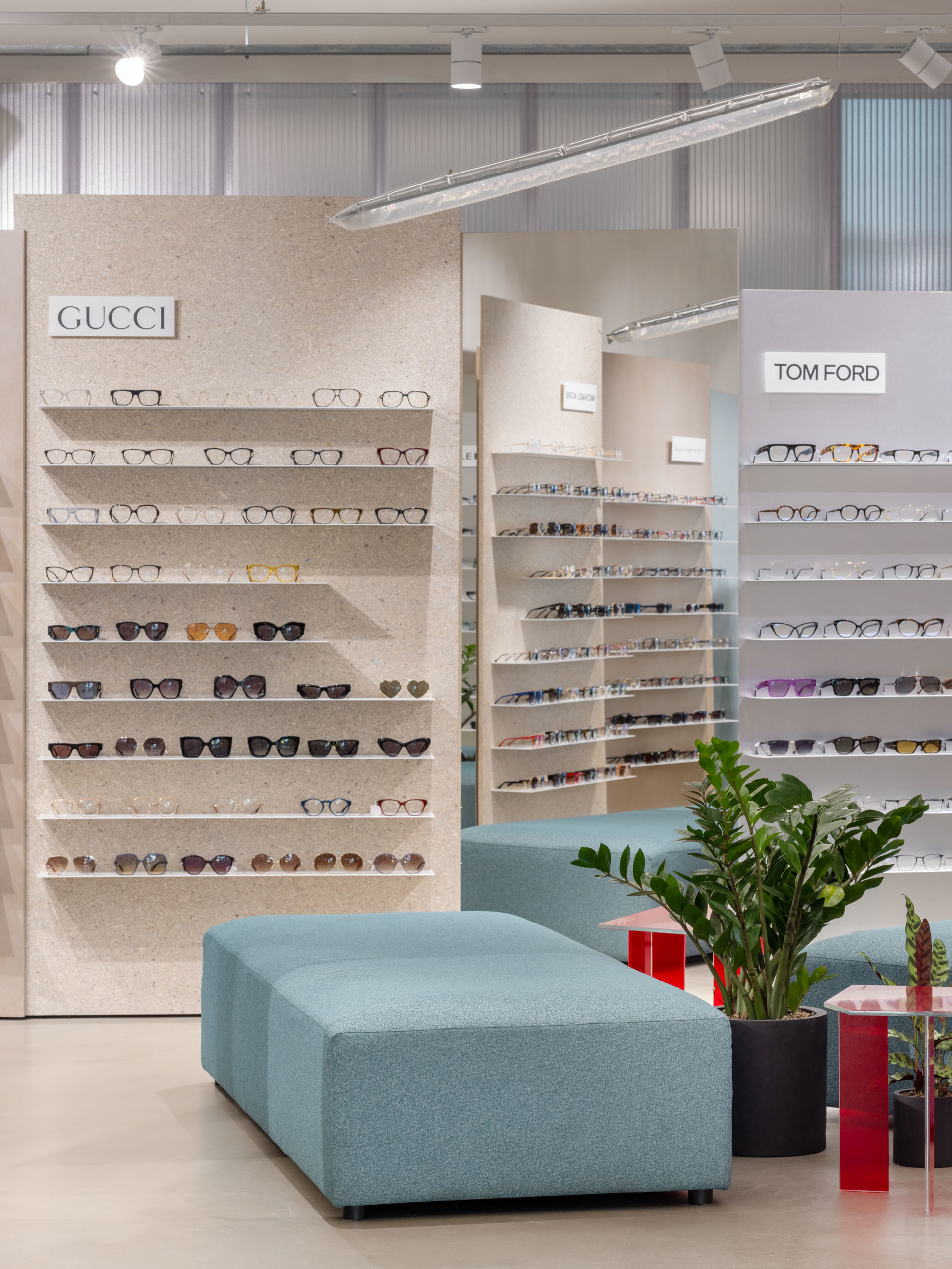Využívame maximálnym výrobným rozmer materiálu a redukujeme tak množstvo odpadu pri jeho formátovaní. Túto základnú štruktúru panelov vkladáme do surového priestoru s minimom zásahov. Pracujeme s betónovou podlahou či priznanými sádrovými omietkami bez finálnej úpravy. Priestor prirodzene delíme vloženou translucentnou stenou oddeľujúcou zázemie a vyšetrovňu od samotnej predajne. Nenarúšame tak hĺbku priestoru a zároveň si vzájomne presvetľujeme obe časti. Vzhľadom na hĺbku dispozície a nedostatok prirodzeného svetla pracujeme so sekundárne nasvieteným stropom so striebornou fóliou, ktorá nám ho rozptyľuje prirodzene do celého interiéru. Priestor dopĺňame transparentným skleneným mobiliárom ako pult či výstavné stolíky v niekoľkých farbách, ktoré vytvárajú rôzne reflexie svetla tak ako šošovky v okuliaroch.