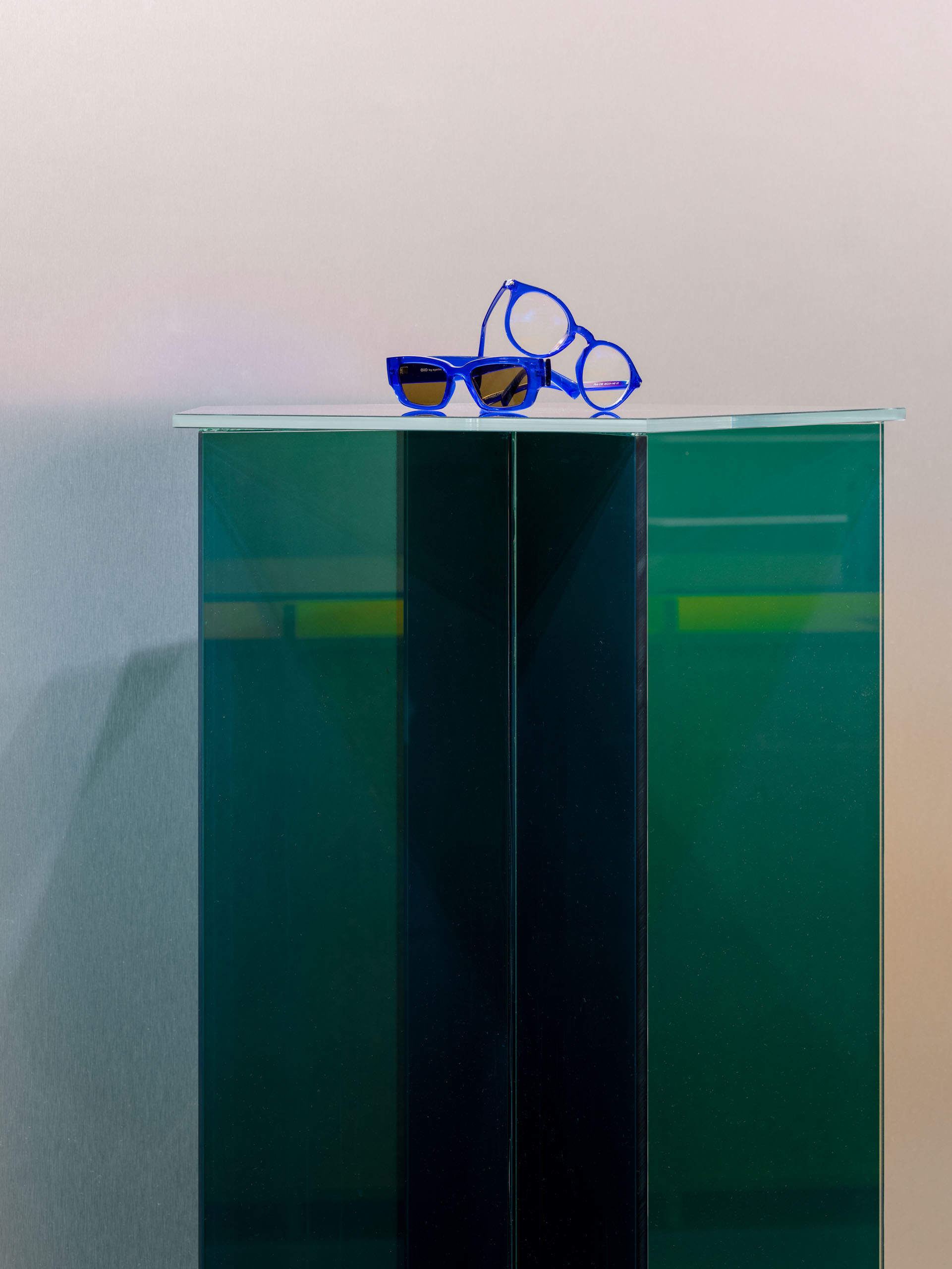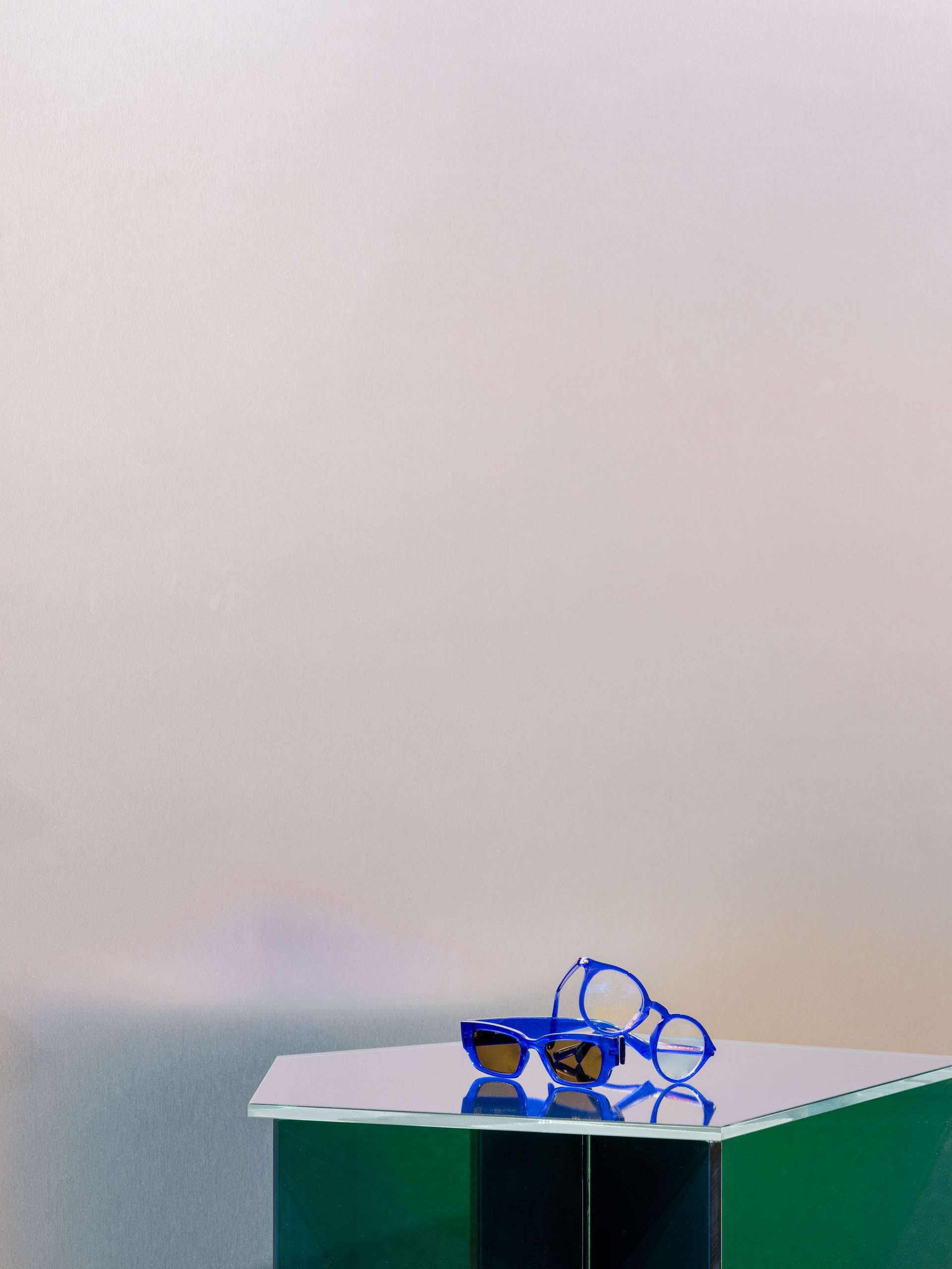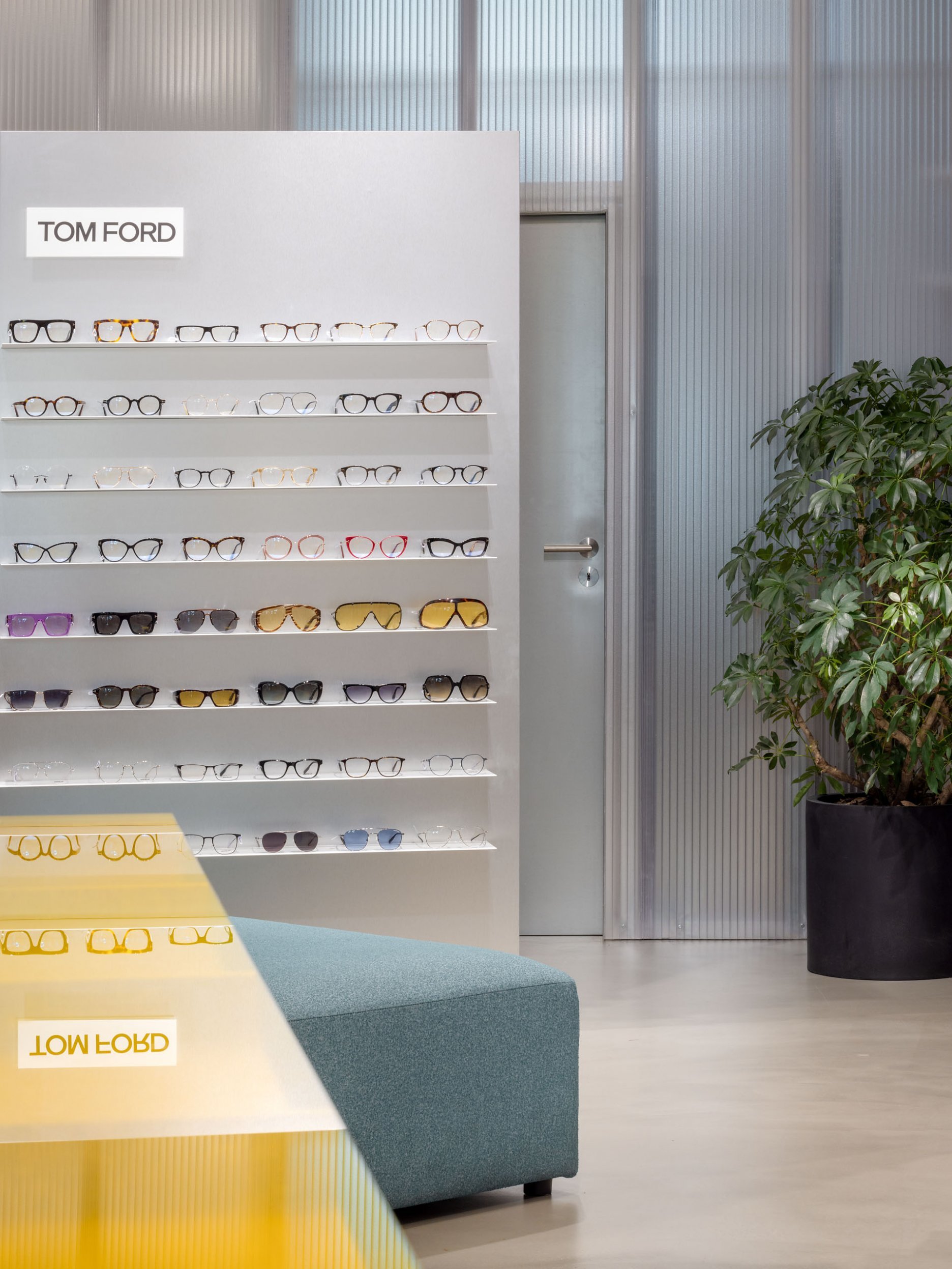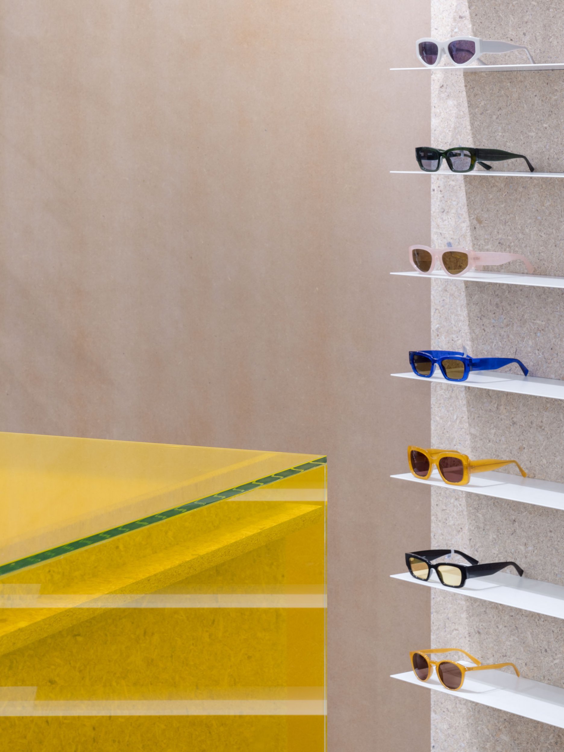Využívame maximálnym výrobným rozmer materiálu a redukujeme tak množstvo odpadu pri jeho formátovaní. Túto základnú štruktúru panelov vkladáme do surového priestoru s minimom zásahov. Pracujeme s betónovou podlahou či priznanými sádrovými omietkami bez finálnej úpravy. Priestor prirodzene delíme vloženou translucentnou stenou oddeľujúcou zázemie a vyšetrovňu od samotnej predajne. Nenarúšame tak hĺbku priestoru a zároveň si vzájomne presvetľujeme obe časti. Vzhľadom na hĺbku dispozície a nedostatok prirodzeného svetla pracujeme so sekundárne nasvieteným stropom so striebornou fóliou, ktorá nám ho rozptyľuje prirodzene do celého interiéru. Priestor dopĺňame transparentným skleneným mobiliárom ako pult či výstavné stolíky v niekoľkých farbách, ktoré vytvárajú rôzne reflexie svetla tak ako šošovky v okuliaroch.