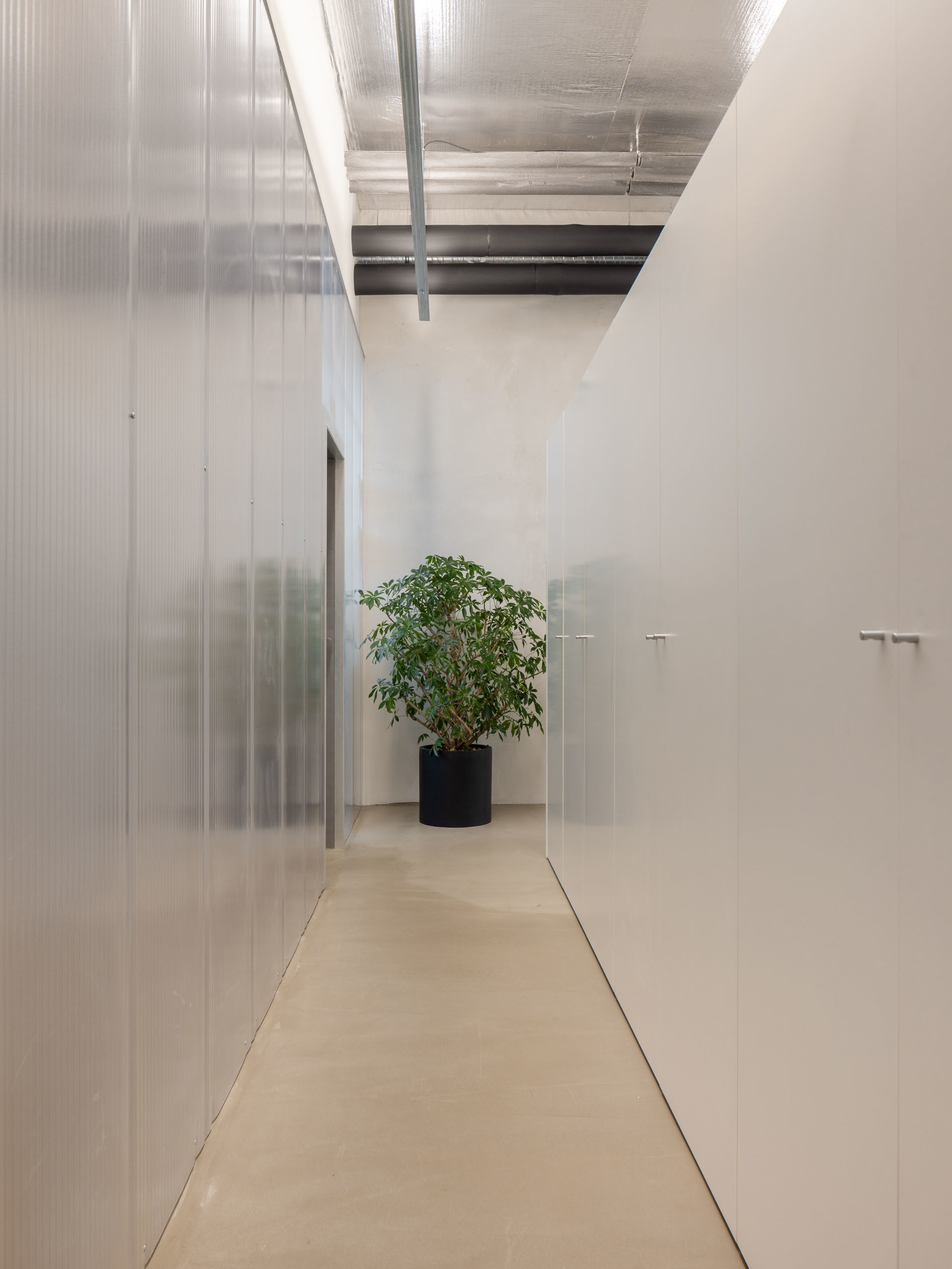 Pracujeme s prirodzenou materialitou panelov ako DTD, MDF, MFP ktoré zjednocujeme jemným bielením a dopĺňame o nerezové panely či pásy zrkadla. Vďaka tejto rôznorodej materialite je možné vizuálne definovať nie len priestor ale aj jednotlivé značky, ktoré je potrebné od seba odlíšiť.