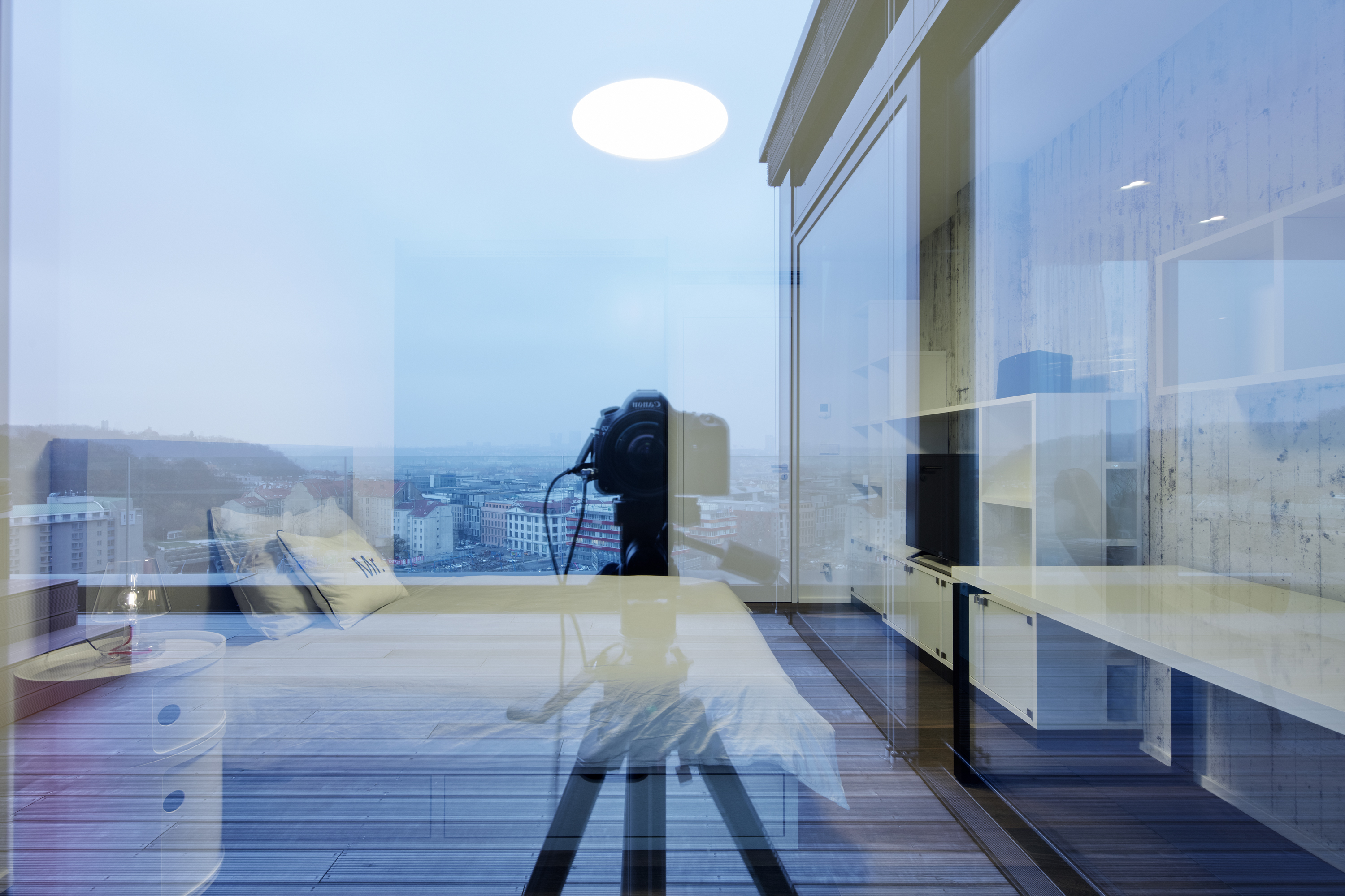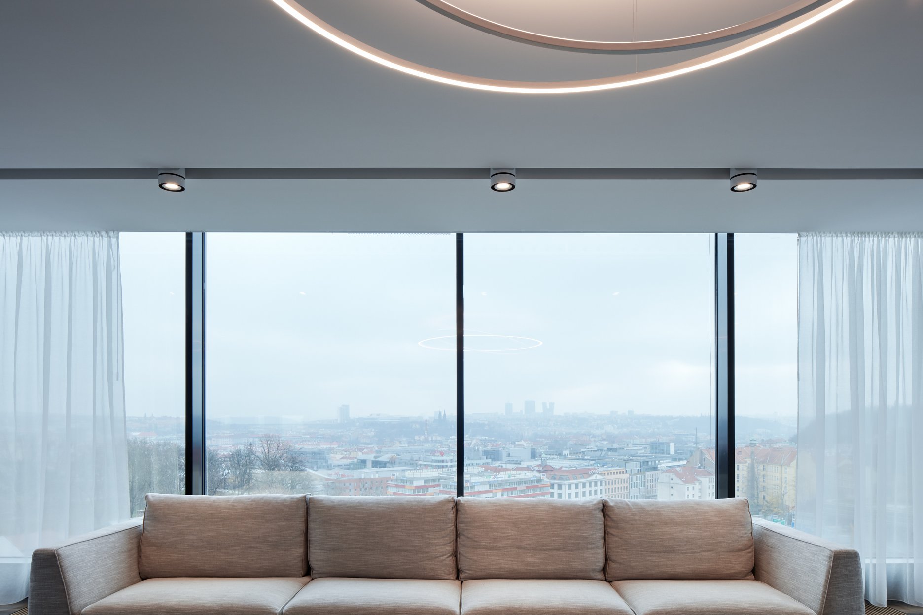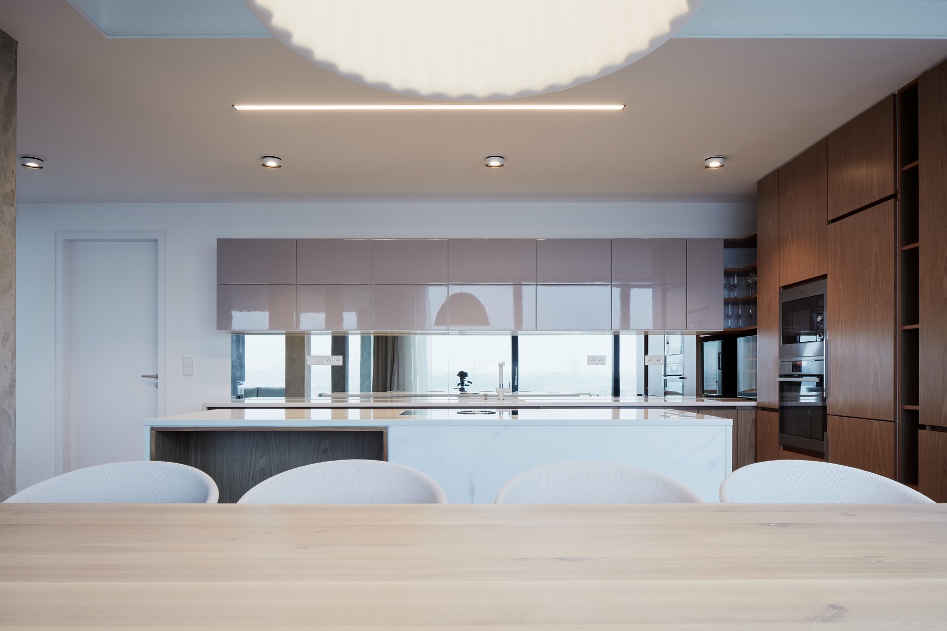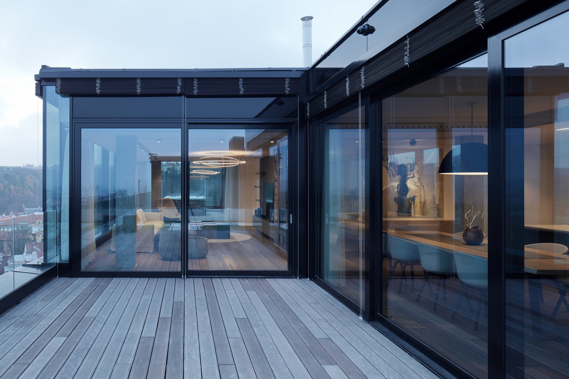 Otvorené priehľady na mesto zabezpečuje presklenná stena v obytnom a jedálenskom celku. Preto je dispozícia dennej časti bytu navrhnutá s maximálnym dôrazom na otvorenosť. Hneď od vstupných dverí tak vznikajú prekvapivé priehľady.