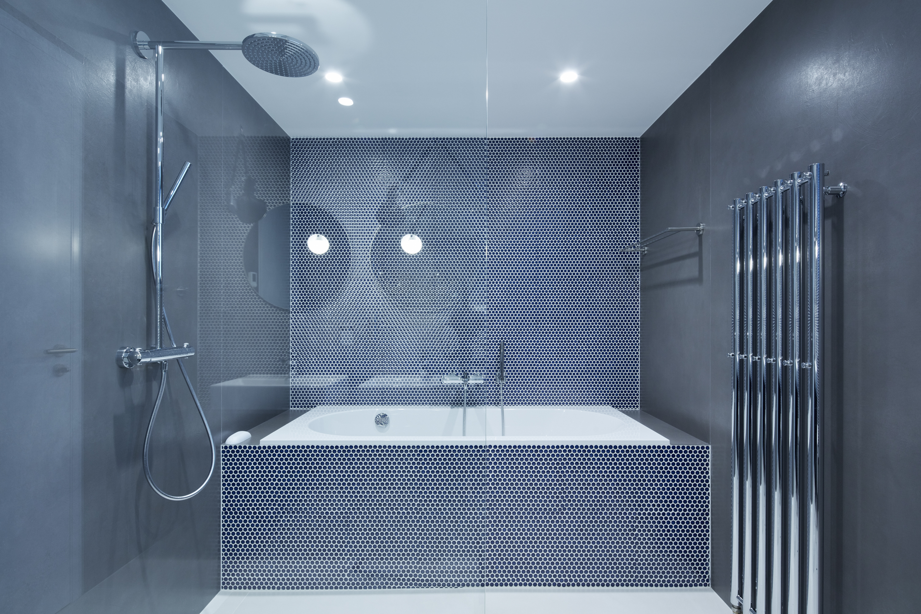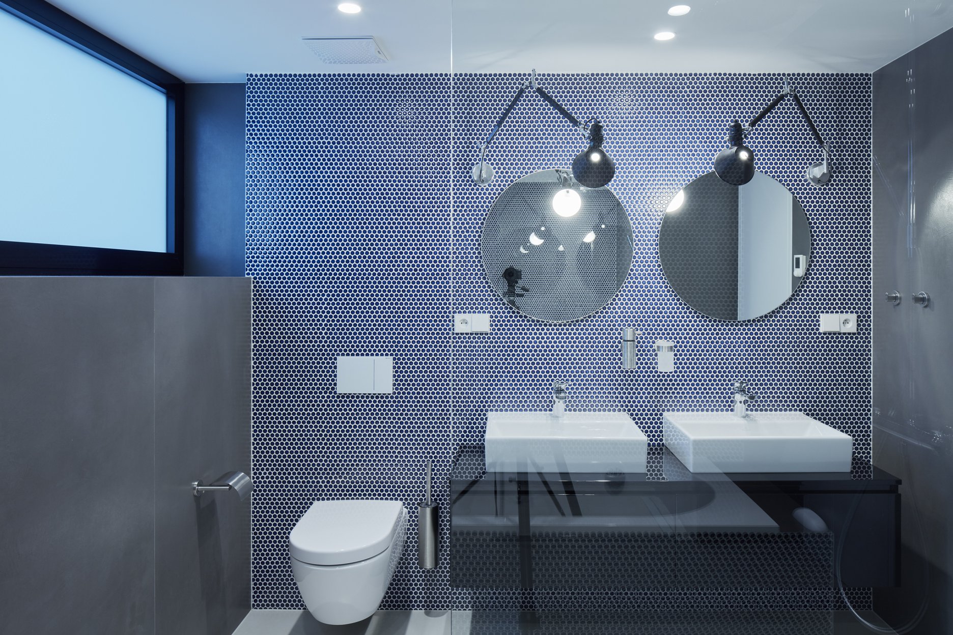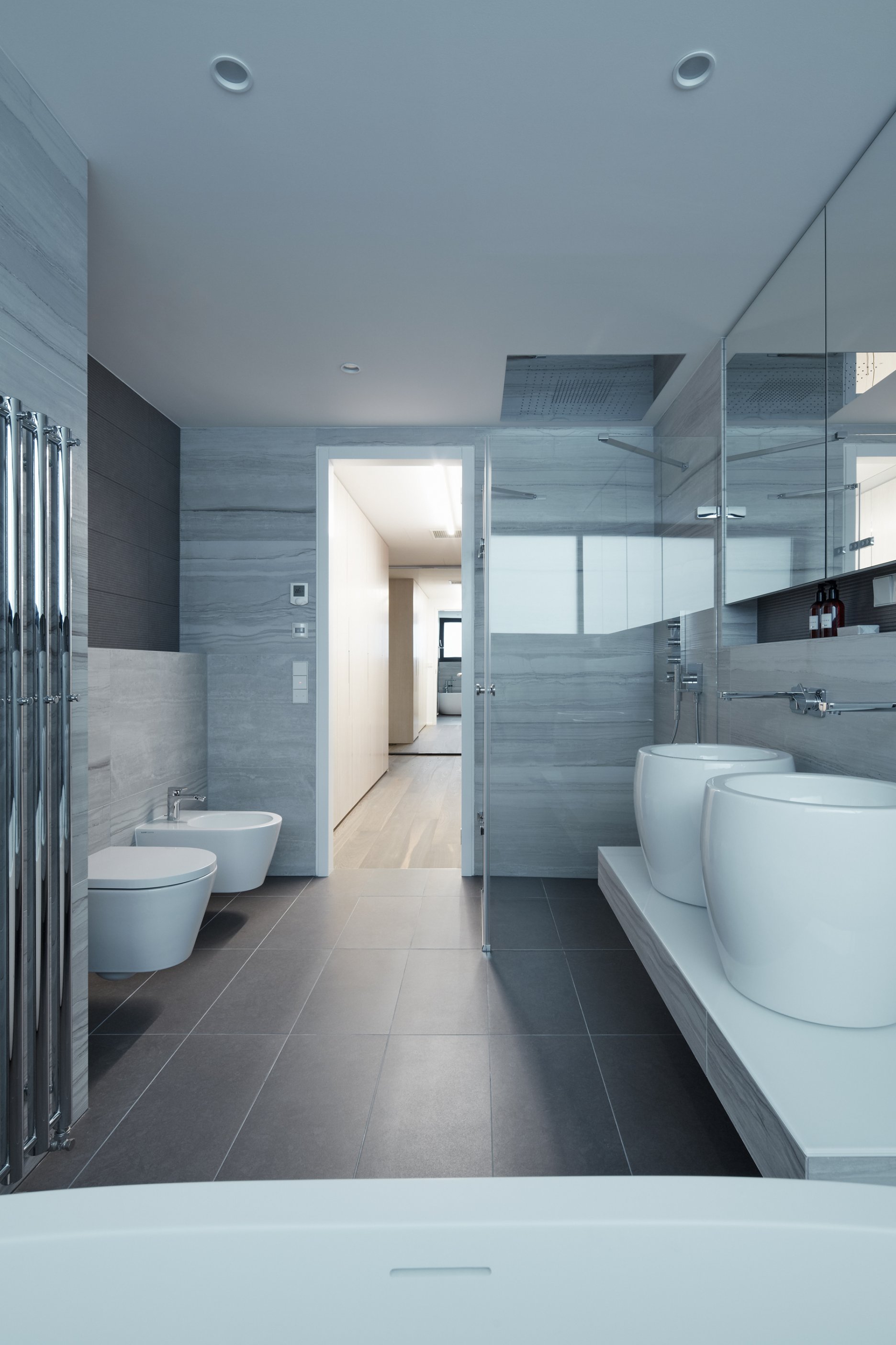“Ke každému křídlu bytu náleží samostatná koupelna. Proto se jejich vzhled liší tak, aby korespondovaly s jednotlivými funkčními celky. Master koupelna navazuje na šatnu a je barevně sladěná s dýhou šatních skříní. V koupelně pro dva chlapce v teenagerovském věku byla požitá drobná modrá mozaika v kontrastu s velkoformátovým obkladem na celou výšku místnosti,“ dodáva Jana Schnappel.