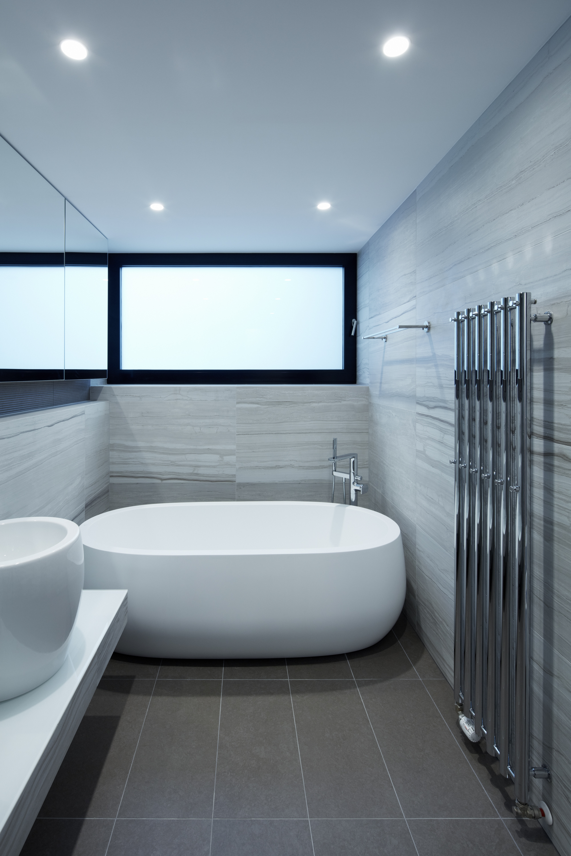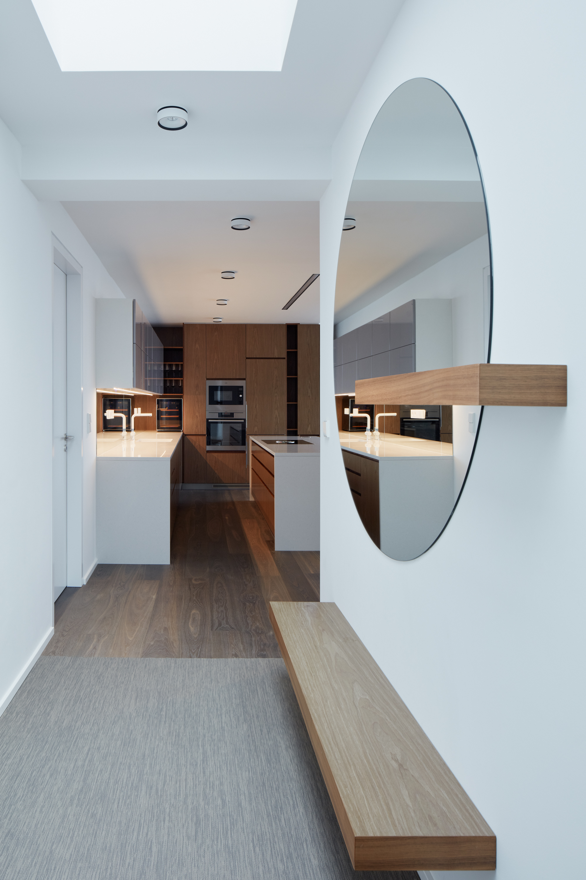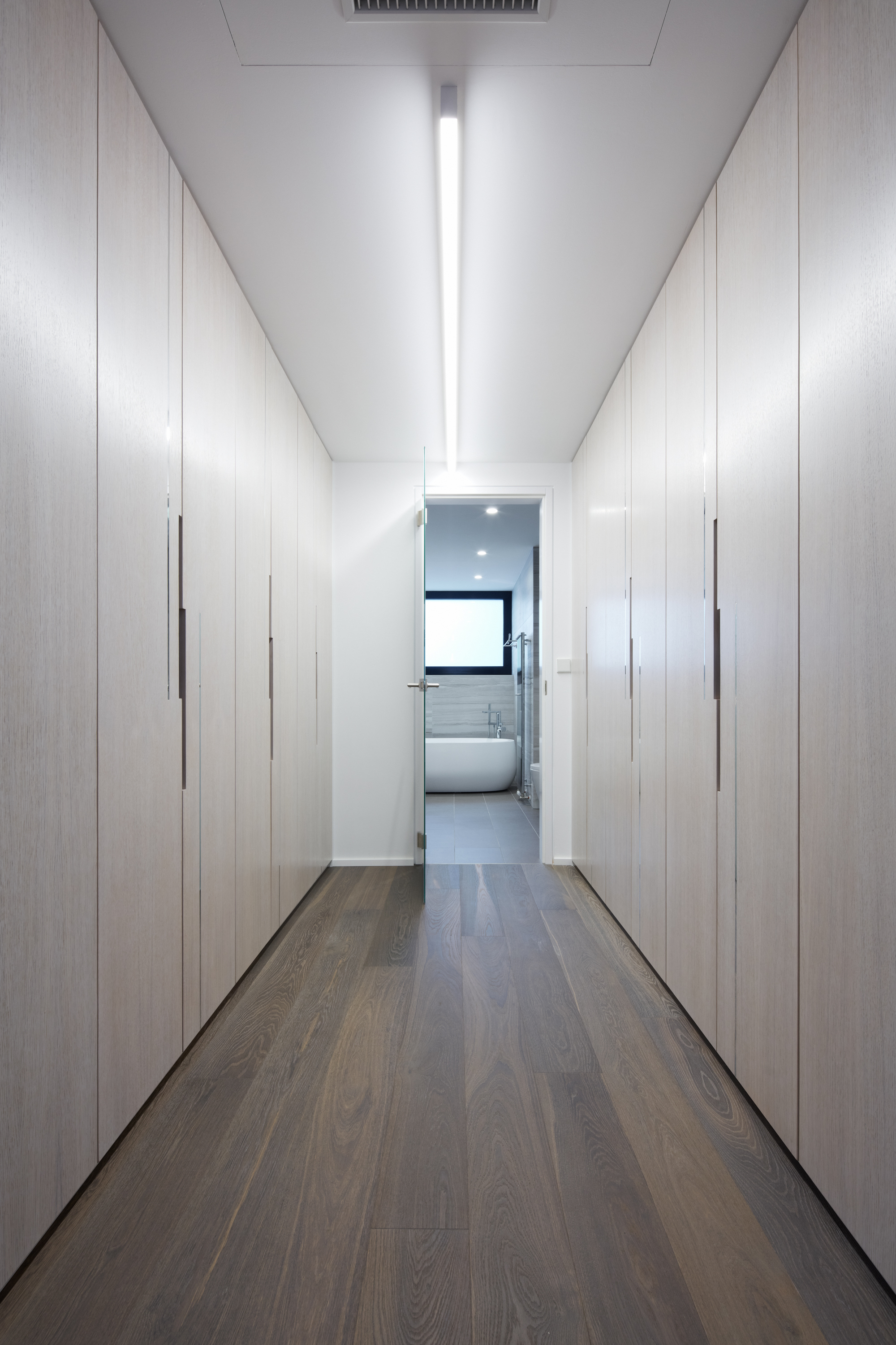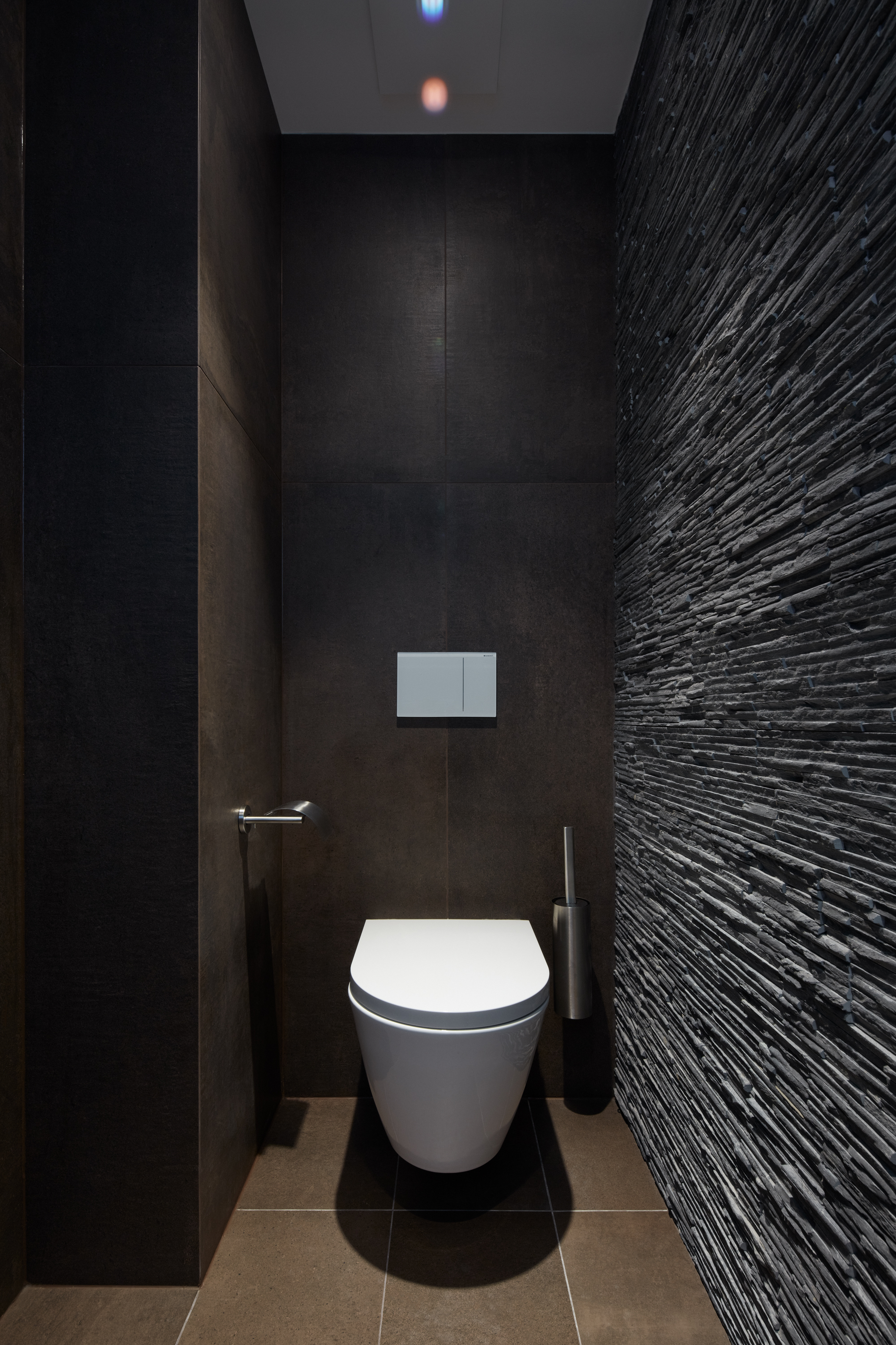 “Ke každému křídlu bytu náleží samostatná koupelna. Proto se jejich vzhled liší tak, aby korespondovaly s jednotlivými funkčními celky. Master koupelna navazuje na šatnu a je barevně sladěná s dýhou šatních skříní. V koupelně pro dva chlapce v teenagerovském věku byla požitá drobná modrá mozaika v kontrastu s velkoformátovým obkladem na celou výšku místnosti,“ dodáva Jana Schnappel.