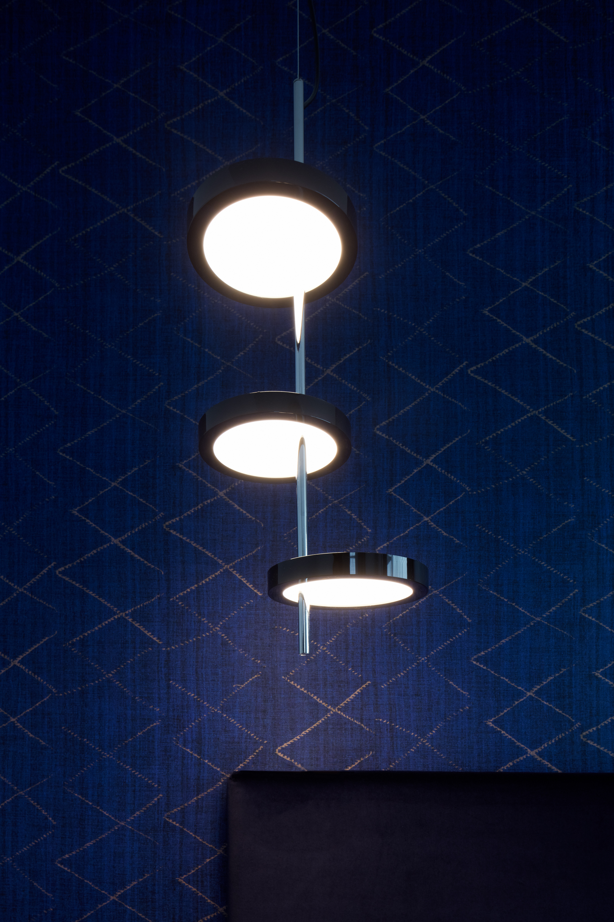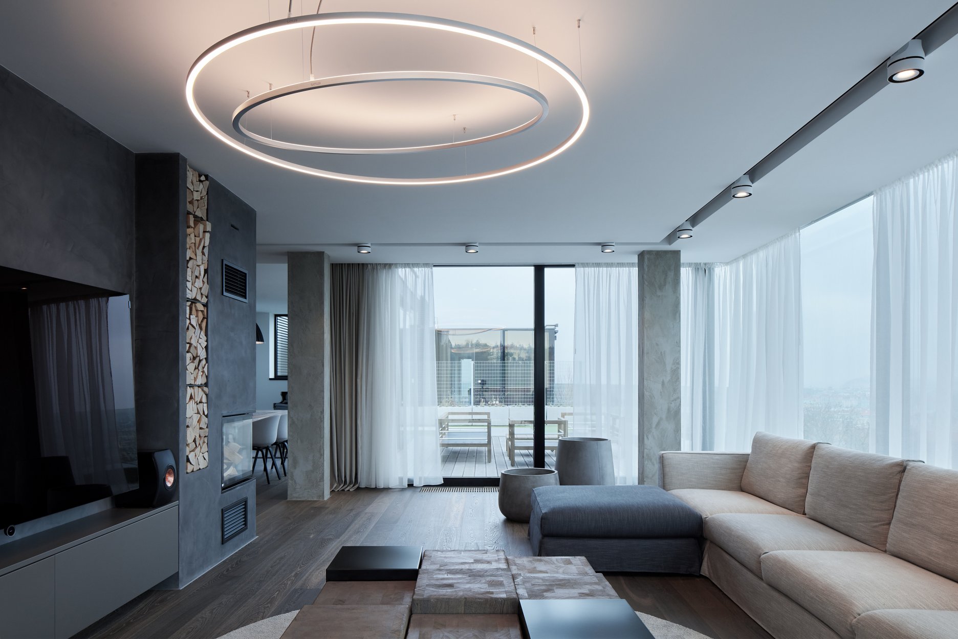 Interiér osvetľujú čiastočne zapustené reflektory, ktoré sú v obytnej časti variabilne umiestnené na lište. V centrálnej časti obývačky je zavesené výrazné kruhové svietidlo. Dizajnové lampy visia tiež nad nočnými stolíkmi v hlavnej spálni.