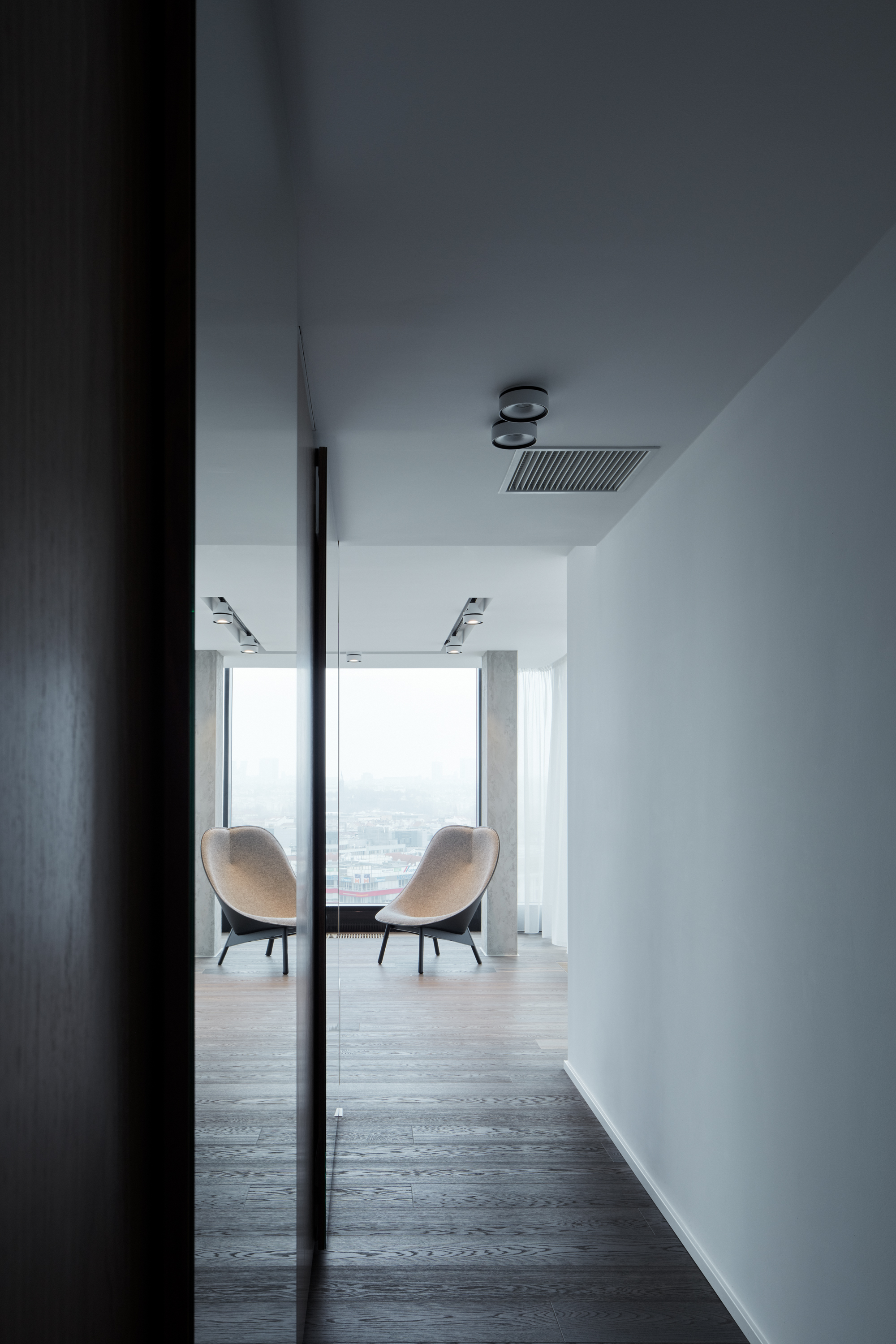 Prehrievaniu zabraňuje systém chladenia, ktorý perforáciou v podhľade pozdĺž celej fasády necháva klesať prúd studeného vzduchu. Interiér tak nie je narušený mriežkami a vzduchotecnickými rozvodmi.