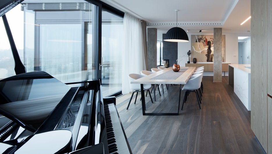 Kuchyňa je od jedálne oddelená kamenným ostrovom. V priestore dominuje stôl z masívneho dreva. “Ten byl díky své velikosti a hmotnosti, společně s pianem, do bytu dopravován jeřábem,” objasňuje architektka.