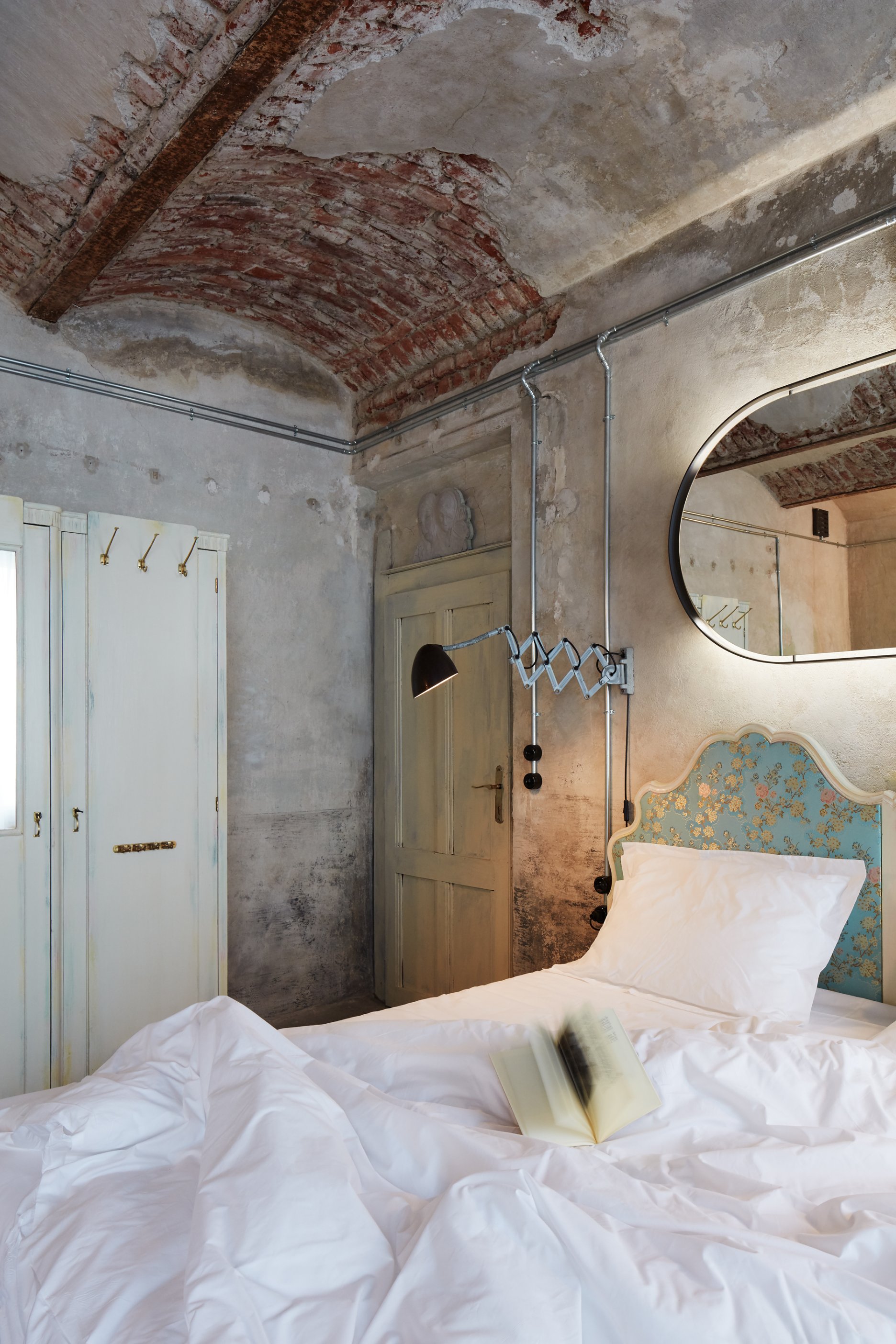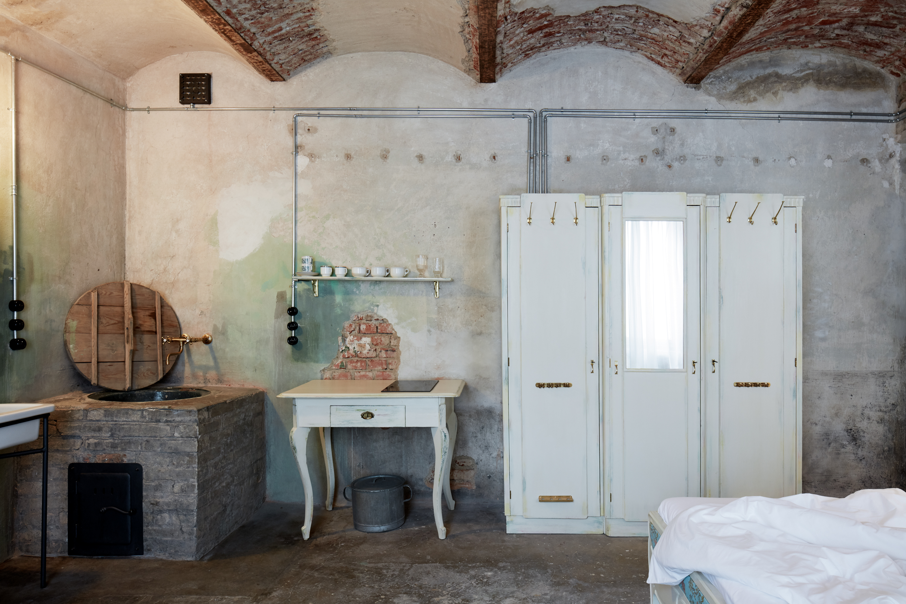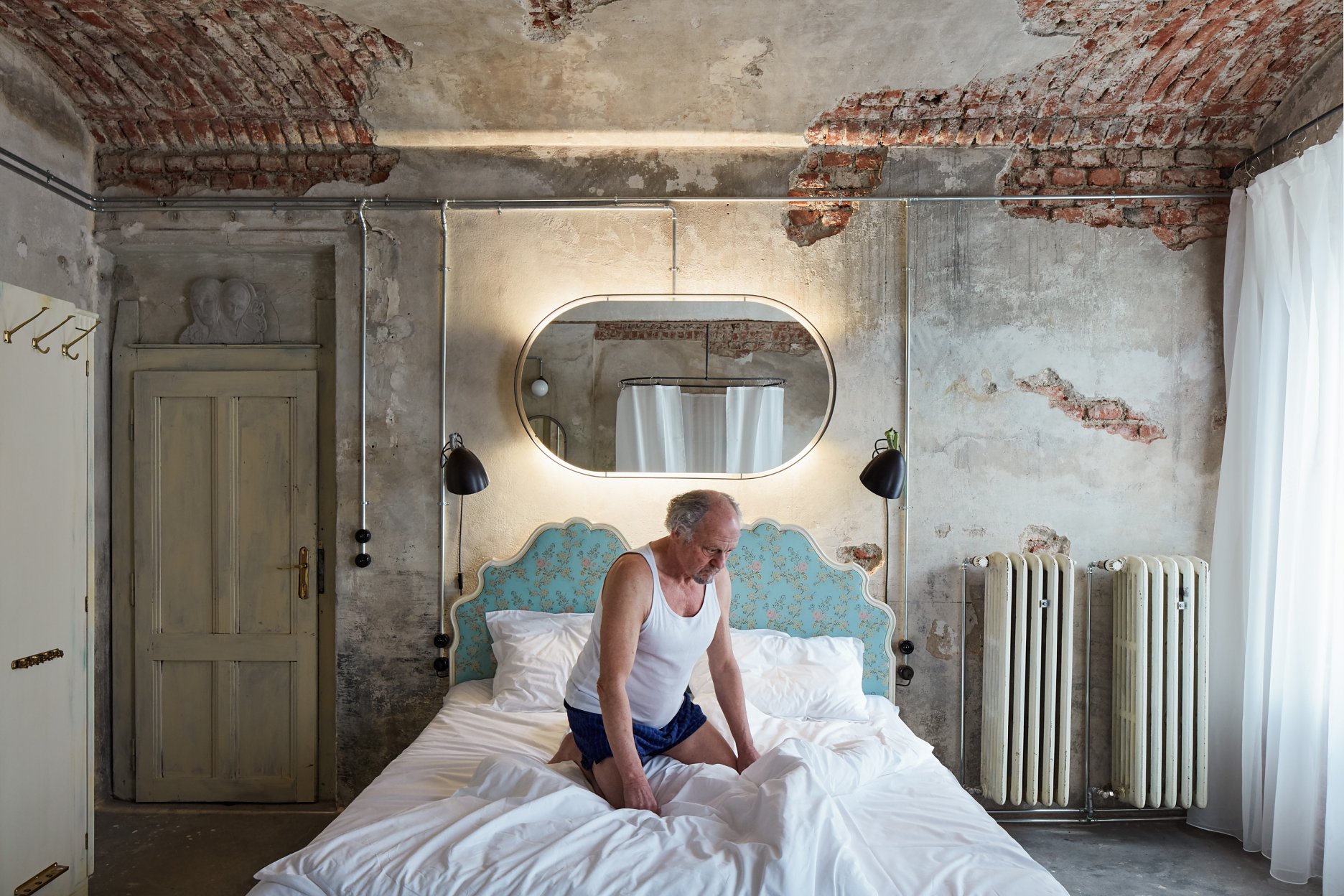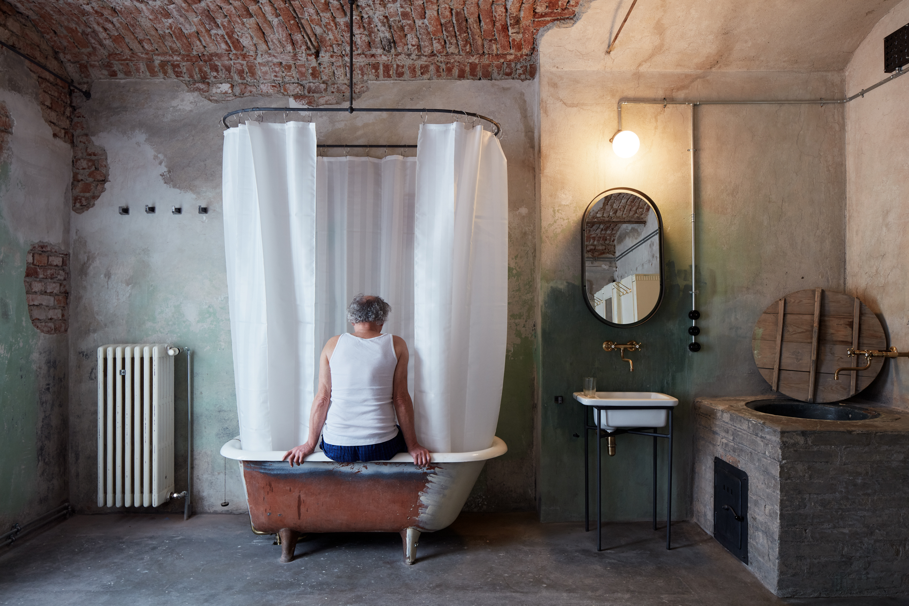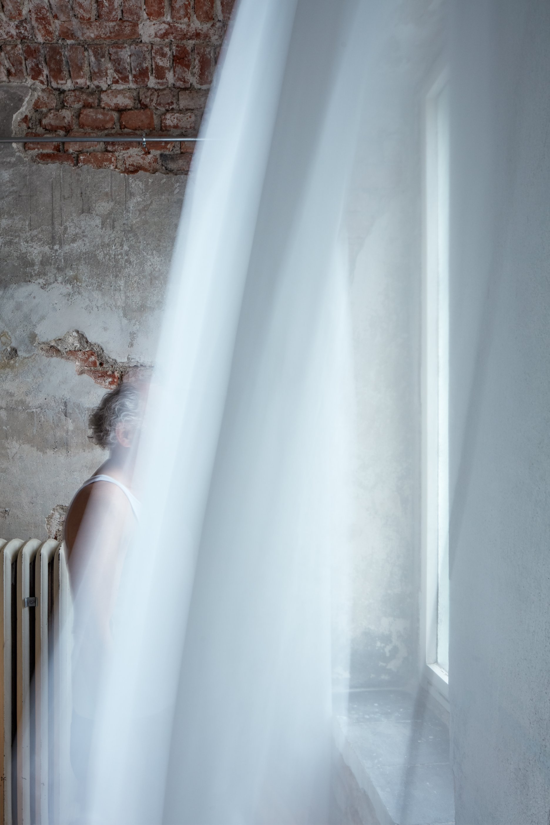 Postel je nakonec největším objektem, který dělí prostor na několik pocitových místností. Na třiceti jedna metrech čtverečních tu najdete obstojné bydlení včetně šatny, kuchyně, koupelny, pracovny i ložnice. Rozvody jsou přiznané v trubkách, je to přece prádelna. Nábytek, který se ukrýval na vedlejší půdě, bylo potřeba trochu oživit a upravit. Skříň jsme museli přeříznout v půli, aby prošla dveřmi, do stolku zabudovat elektrický vařič, z prádelních kamen v rohu udělat dřez nebo ze dvou postelí udělat jednu nově polstrovanou jemným brokátem. Do tvrdého prostoru tak vstoupila měkkost a pohodlí. Vše, čeho se každodenně dotýkáme je nové, pozadí ale tvoří původní stav věcí. Téma očisty zůstává stále středobodem tohoto interieru, vana stojí v prostoru na čestném místě přímo proti vstupním dveřím. Při koupeli je tak možné pozorovat nebe, a v zimě bílé květy, které na okno kreslí mráz.