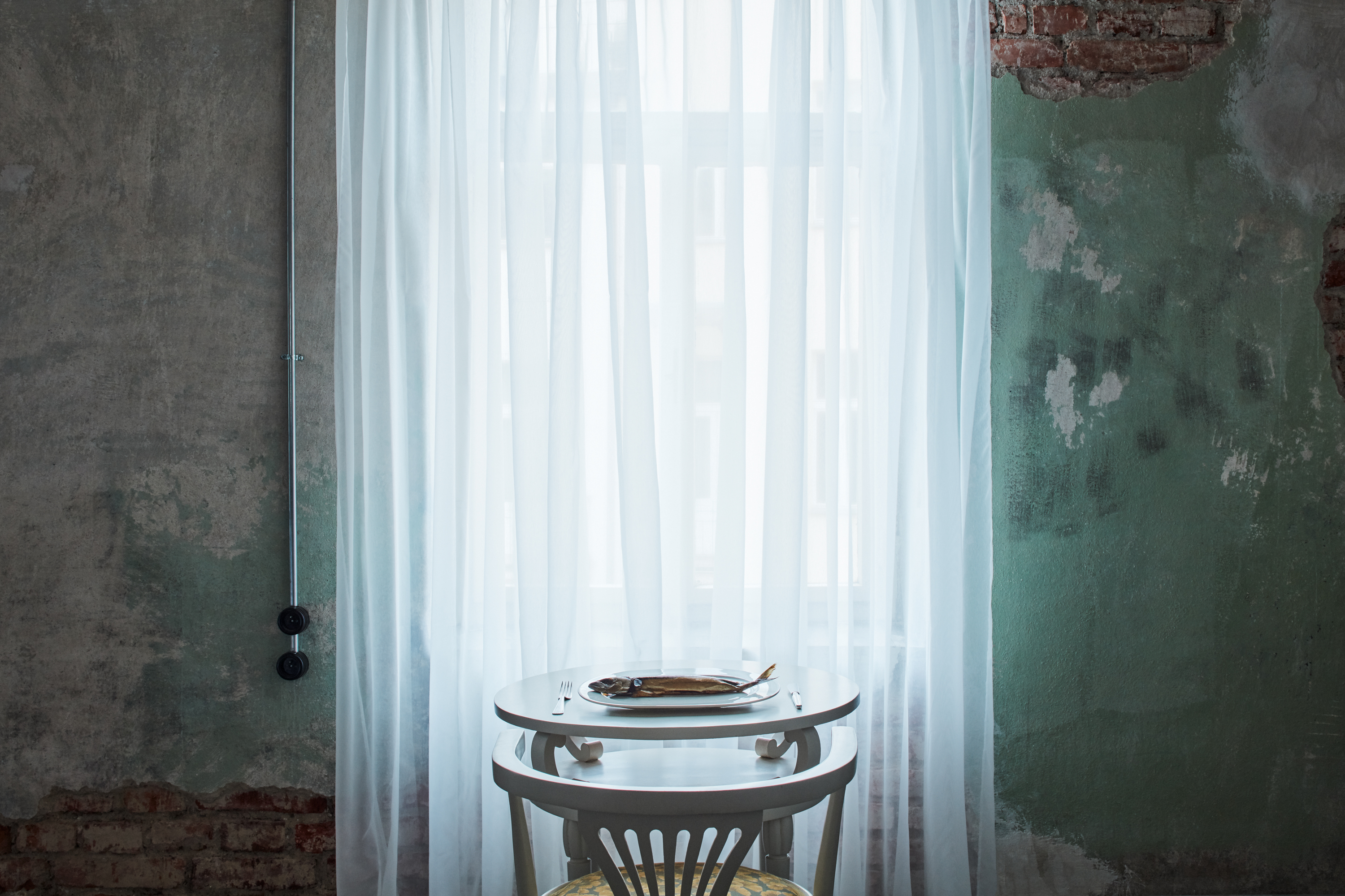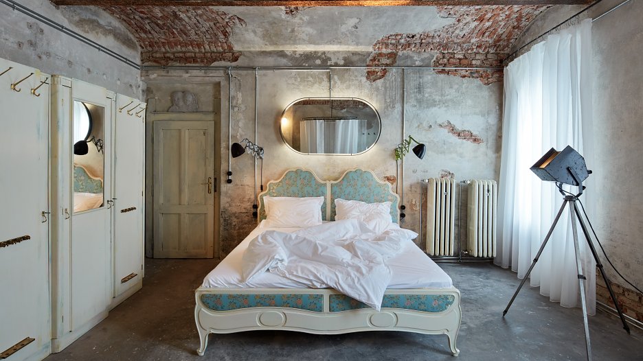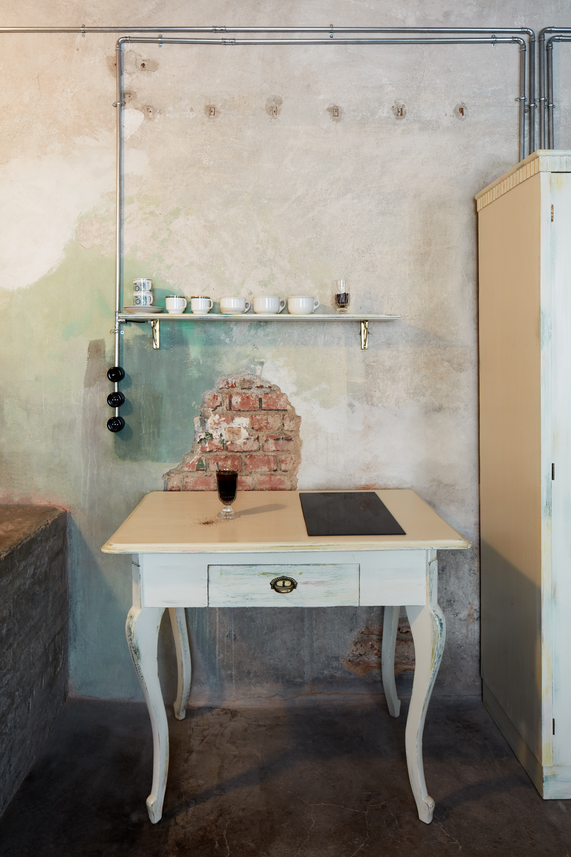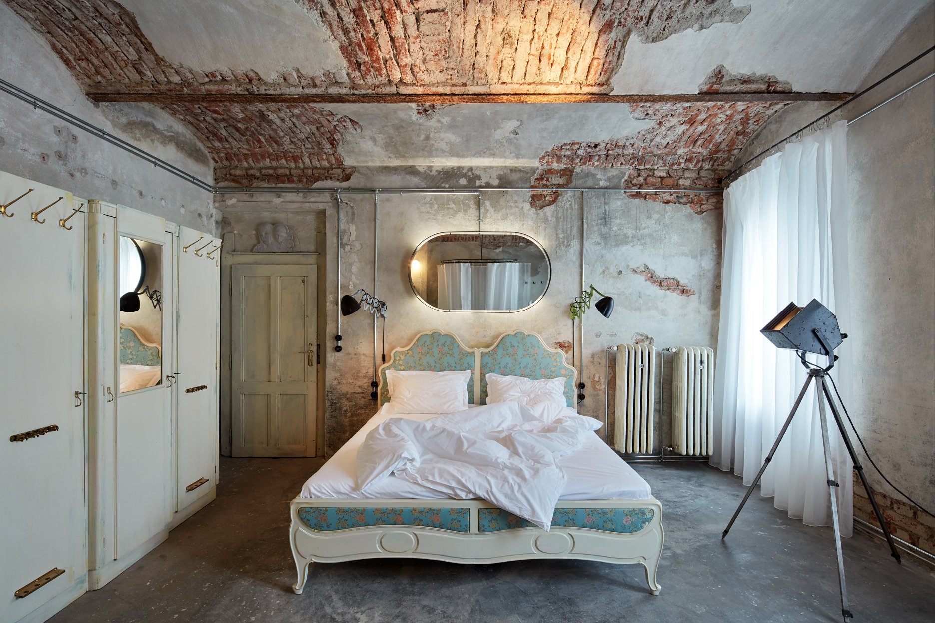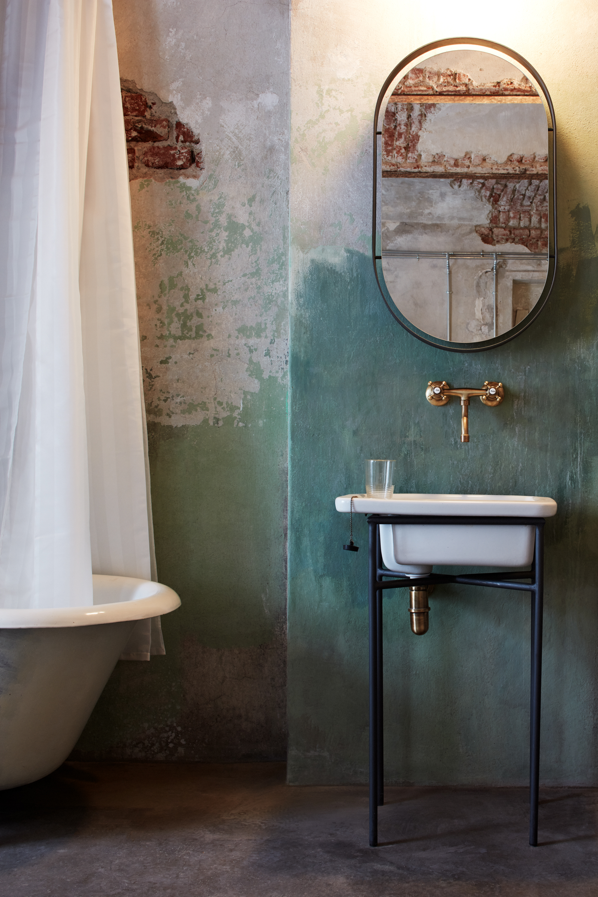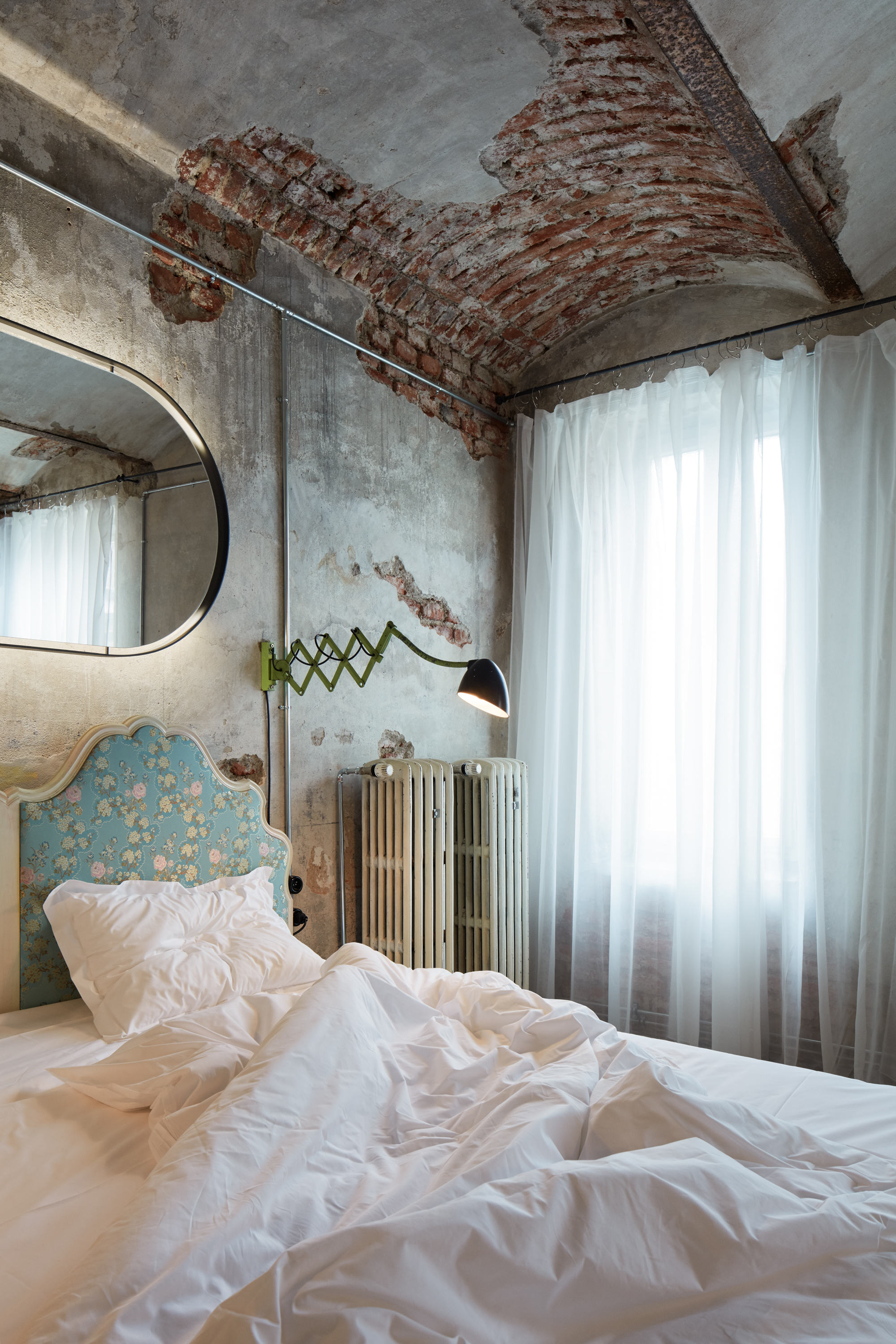 Postel je nakonec největším objektem, který dělí prostor na několik pocitových místností. Na třiceti jedna metrech čtverečních tu najdete obstojné bydlení včetně šatny, kuchyně, koupelny, pracovny i ložnice. Rozvody jsou přiznané v trubkách, je to přece prádelna. Nábytek, který se ukrýval na vedlejší půdě, bylo potřeba trochu oživit a upravit. Skříň jsme museli přeříznout v půli, aby prošla dveřmi, do stolku zabudovat elektrický vařič, z prádelních kamen v rohu udělat dřez nebo ze dvou postelí udělat jednu nově polstrovanou jemným brokátem. Do tvrdého prostoru tak vstoupila měkkost a pohodlí. Vše, čeho se každodenně dotýkáme je nové, pozadí ale tvoří původní stav věcí. Téma očisty zůstává stále středobodem tohoto interieru, vana stojí v prostoru na čestném místě přímo proti vstupním dveřím. Při koupeli je tak možné pozorovat nebe, a v zimě bílé květy, které na okno kreslí mráz.