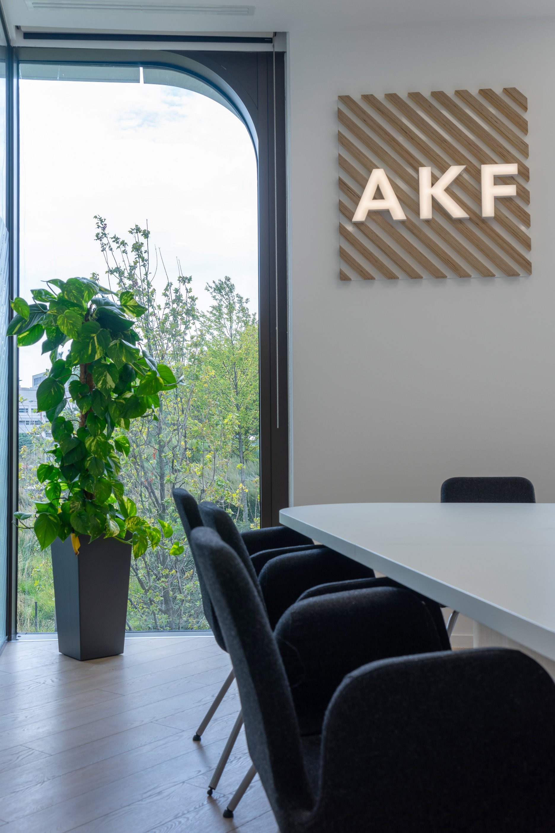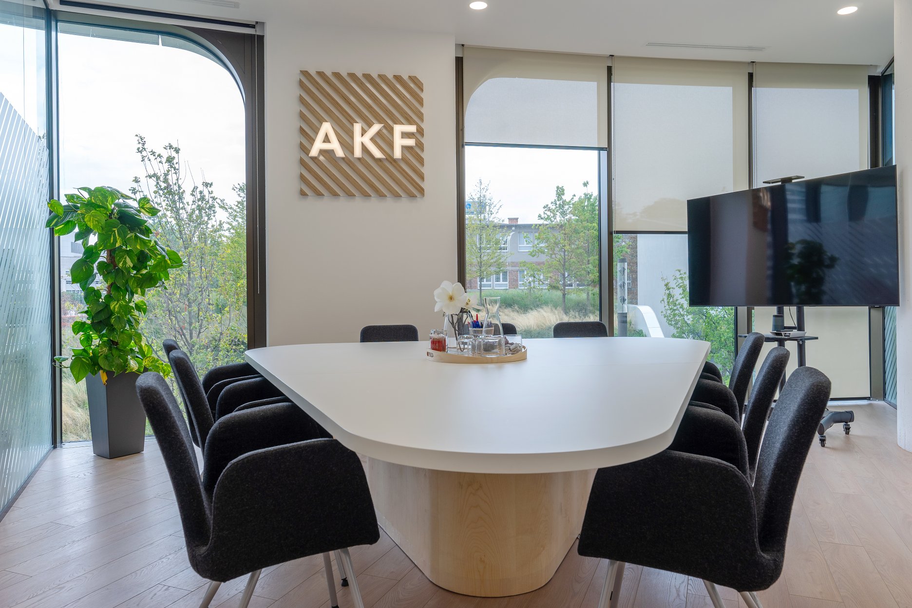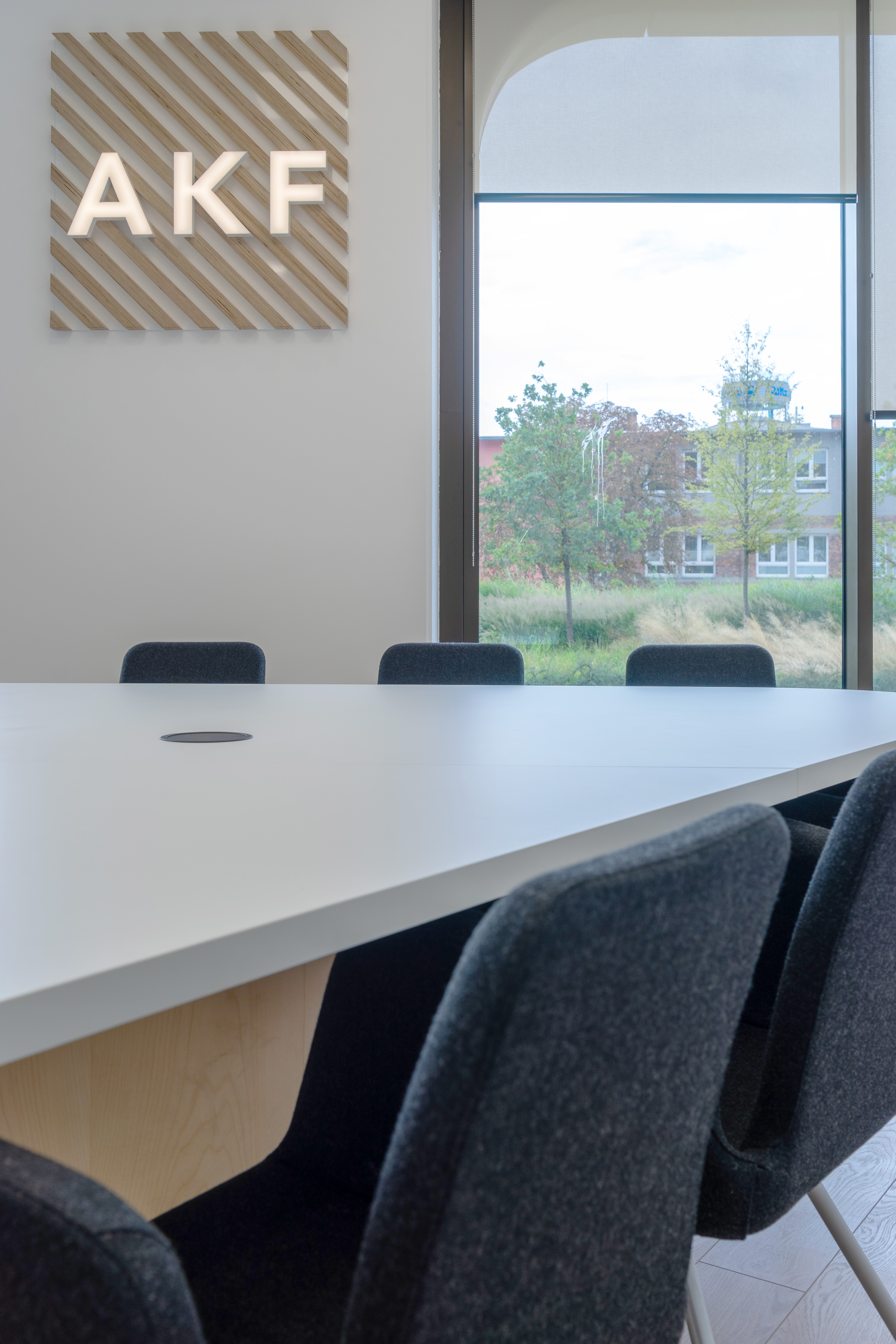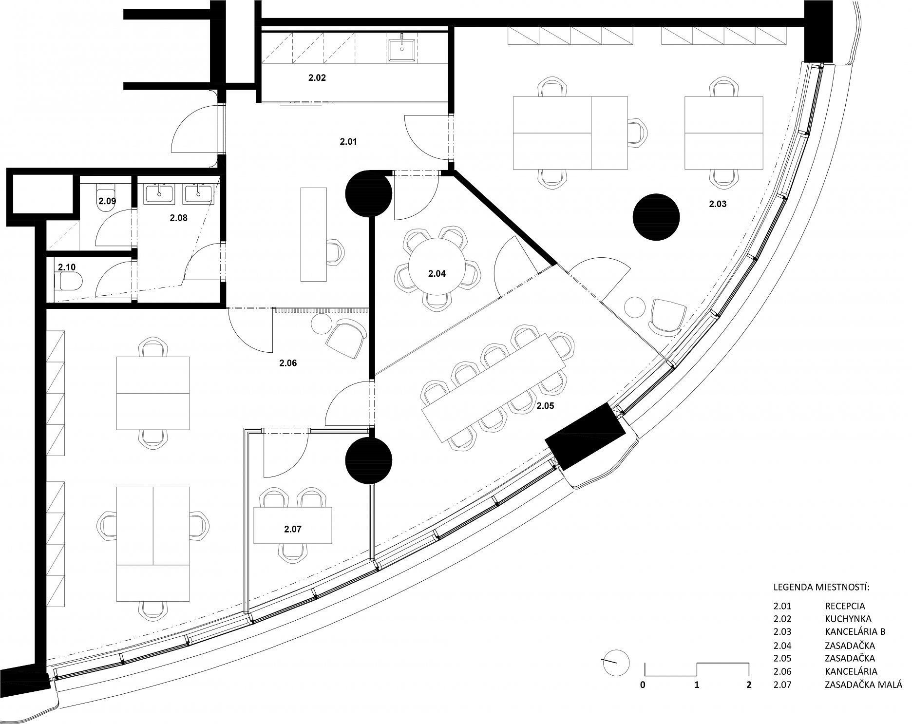 Za recepciou sa nachádza zasadačka, ktorá slúži ako priestor kontaktu s klientami alebo na celofiremné stretnutia. Ťažiskovým prvkom miestnosti je konferenčný stôl, ktorý svojim atypickým tvarom reaguje na nepravidelnú geometriu priestoru. Kancelárie sú riešené jednoducho s dôrazom na zachovanie bielej farebnosti a praktickosti.