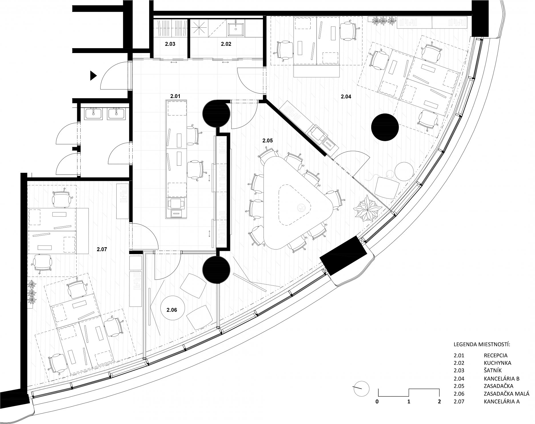 Z dispozičného hľadiska je priestor rozdelený na vstupnú časť s recepciou so zázemím, zasadačkou a dvoma otvorenými kanceláriami, každá pre jeden pracovný tím.