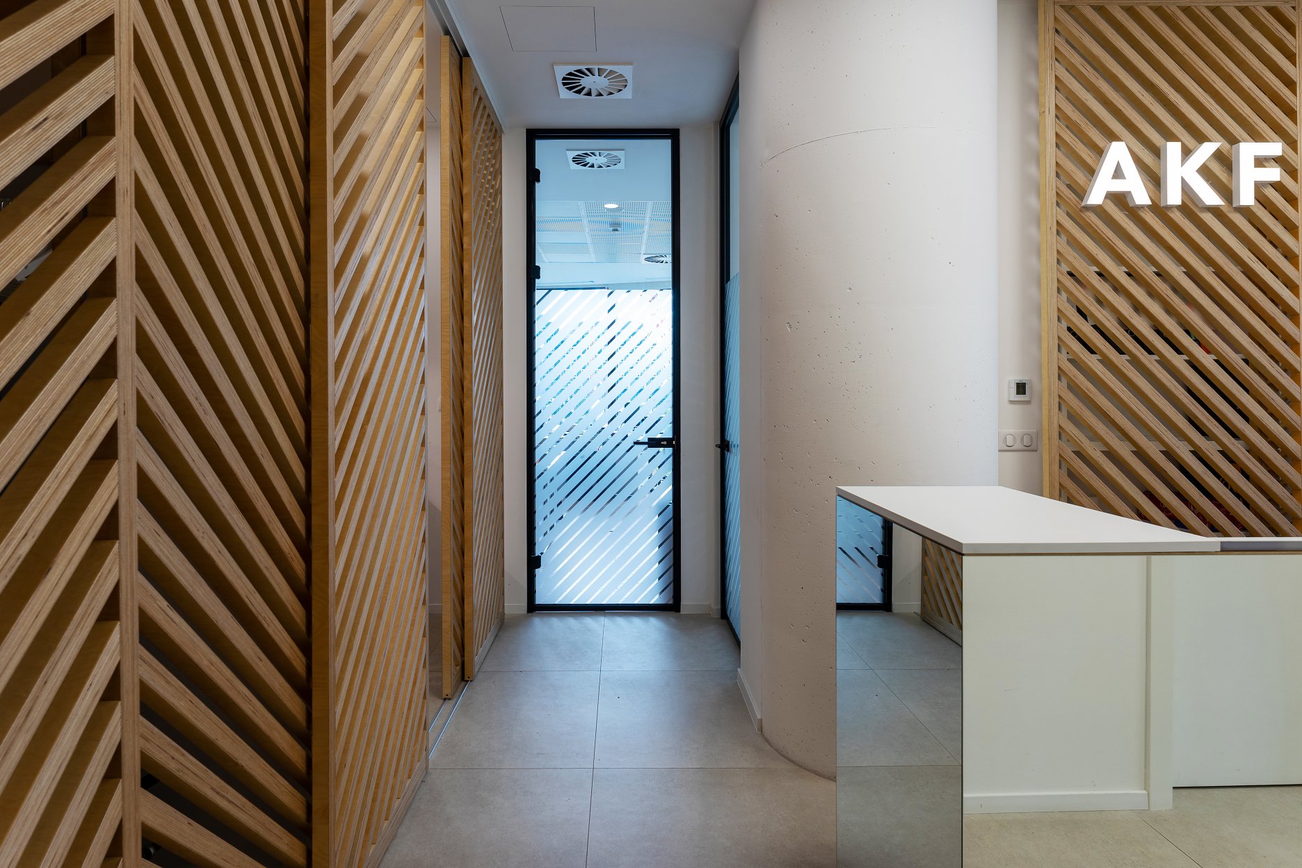 Farebná a materiálová paleta je tvorená svetlými farbami, doplnená o panely z brezovej preglejky otočené na rub, ktoré dodávajú interiéru civilnejší dojem a prírodnú textúru, ktorá dobre kontrastuje s lesklými a hladkými povrchmi sklenených priečok a stien.