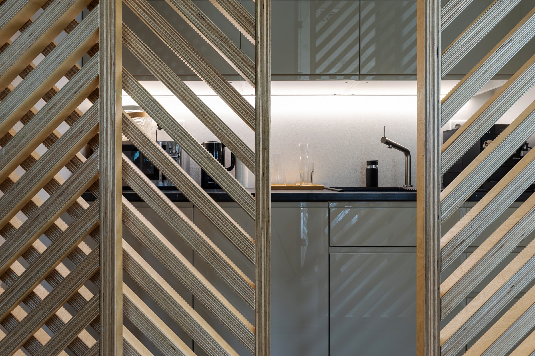 Zjednocujúcim prvkom celého interiéru je motív diagonál, ktorý sa objavuje tak na dyhových paneloch vstaveného nábytku a zásten, ako aj na grafickom designe polepov sklenených priečok. Diagonály vytvárajú semi transparentné povrchy. Ich vizuálne „prepletanie,“ a „vrstvenie“ dodáva povrchom hĺbku. Tiene ktoré vrhajú v slnečnom počasí vnášajú do inak pomerne strohého interiéru hravosť a dynamiku.