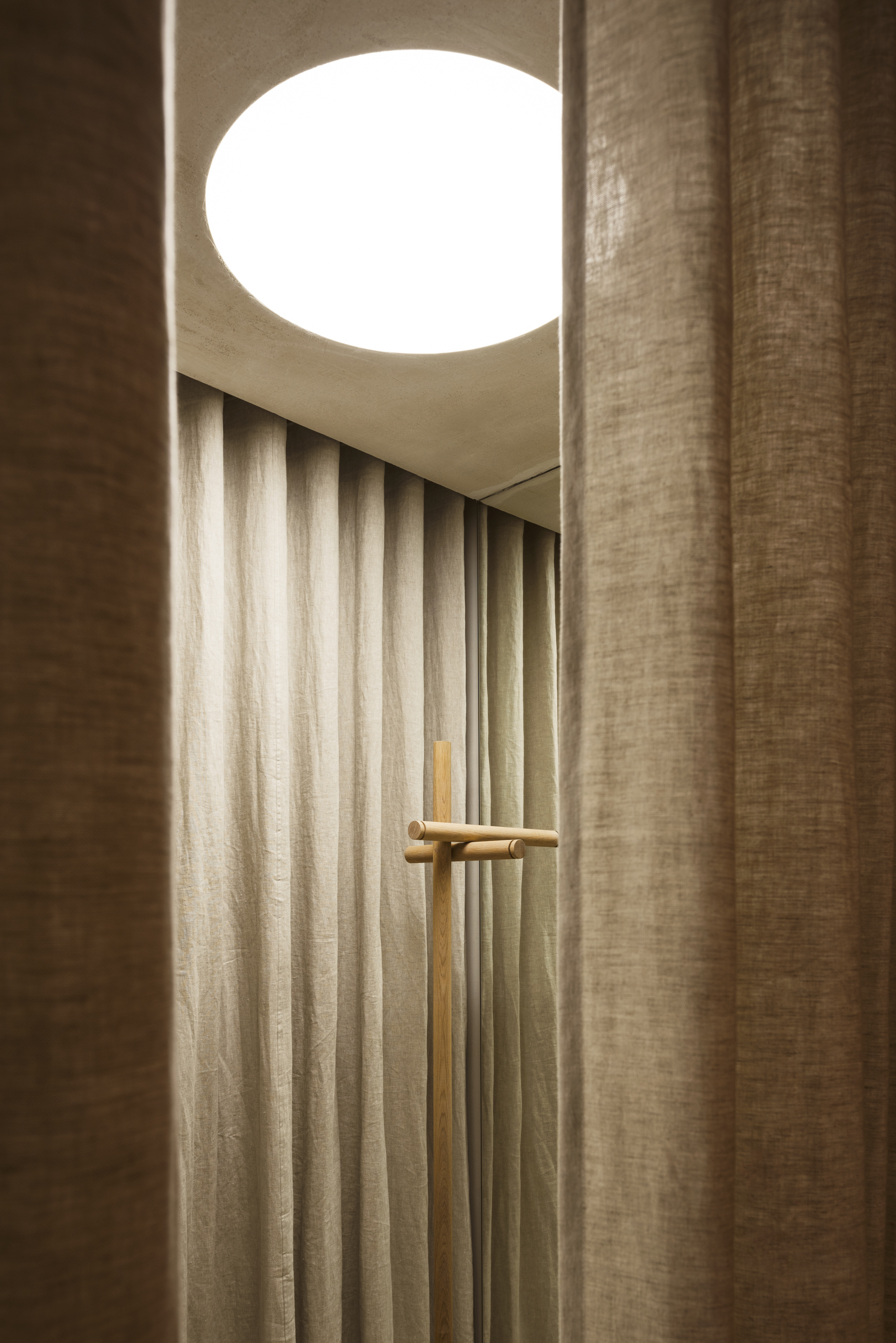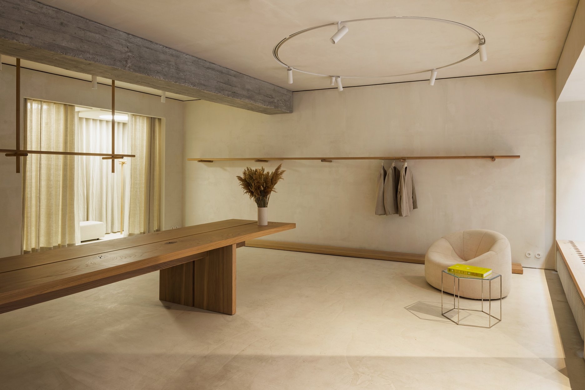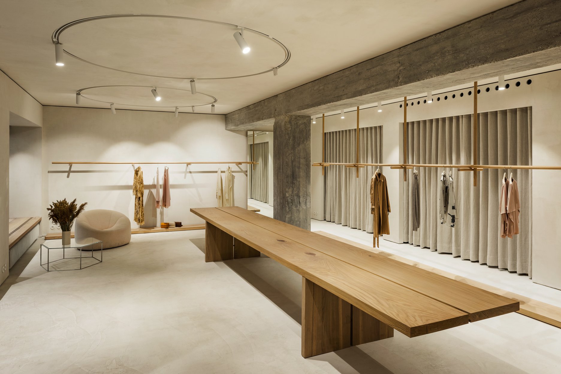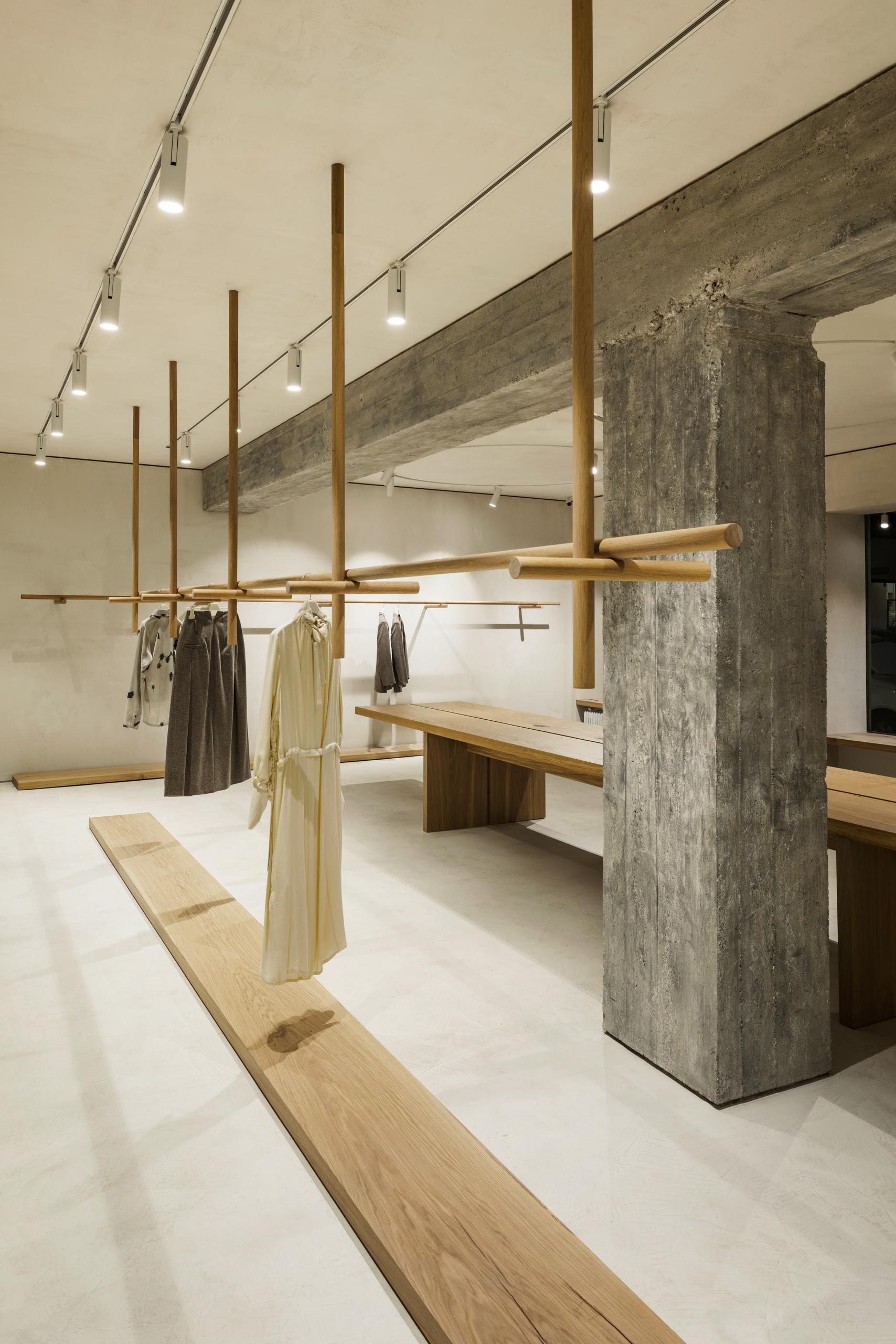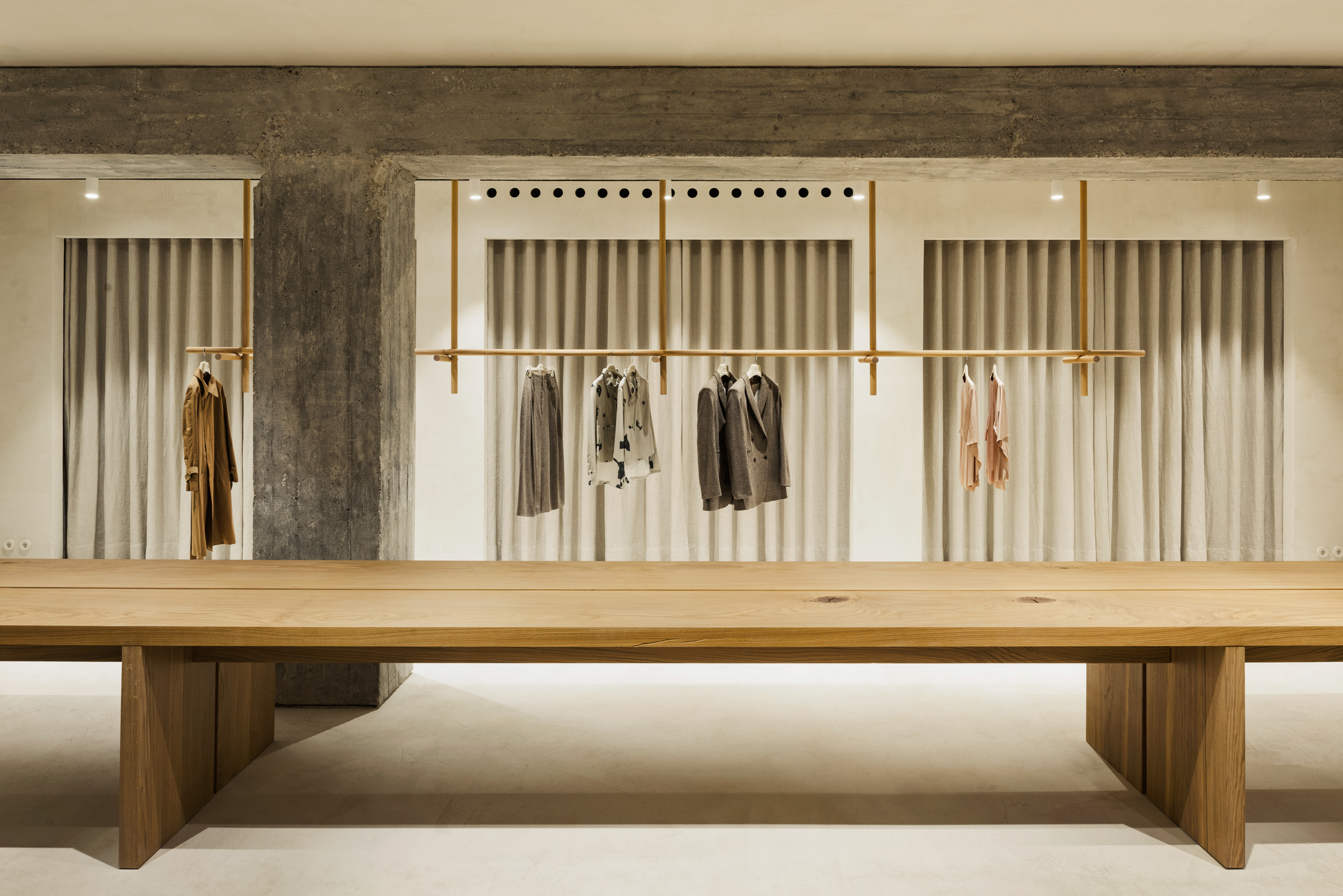 Tu všetko do seba výborne zapadá: exkluzívne susedstvo Bauernmarktu aj bezozdobná modernistická budova, v ktorej butik sídli, rukopis architekta postavený na vyčírených detailoch či reinterpretácia dizajnérskeho funkcionalizmu na viacerých úrovniach, sakrálne povznesenie aj naostrená strihová logika – spoločne podliehajú ideologickej profilácii značky, ktorá hrdo komunikuje svoju víziu funkčnej elegancie a udržateľnosti.