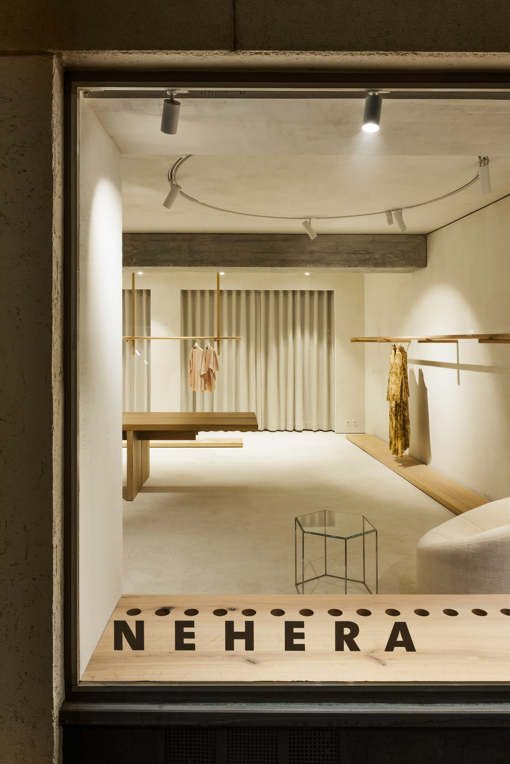 Kým predošlé projekty Martina Skočeka boli skôr ponúknutou a potom osvojenou možnosťou uznať autorskú filozofiu implantovanú do univerza investorov, prípad NEHERA je už zámerným dialógom s autonómnou tvorbou „protistrany“. Ponúknutý priestor – čistý, funkčný obdĺžnik predajne s hlbokými výkladmi v tesnom dotyku ulice na jednej dlhej strane a s výklenkami zázemia na odvrátenej strane – predstavuje rigidný rámec, v ktorom architekt inštaloval nenútenú scenériu. Jej hlavnými zložkami sú rozsiahle plochy stavebného interiéru bez švíkov ponechané v prirodzenej povrchovej štruktúre – obnažený betón skeletu budovy komunikuje s cementovou stierkou na podlahe a tradičnými omietkami stien. Napohľad strohý až asketický podklad je vyhotovený s krajne precíznym remeselným nasadením.