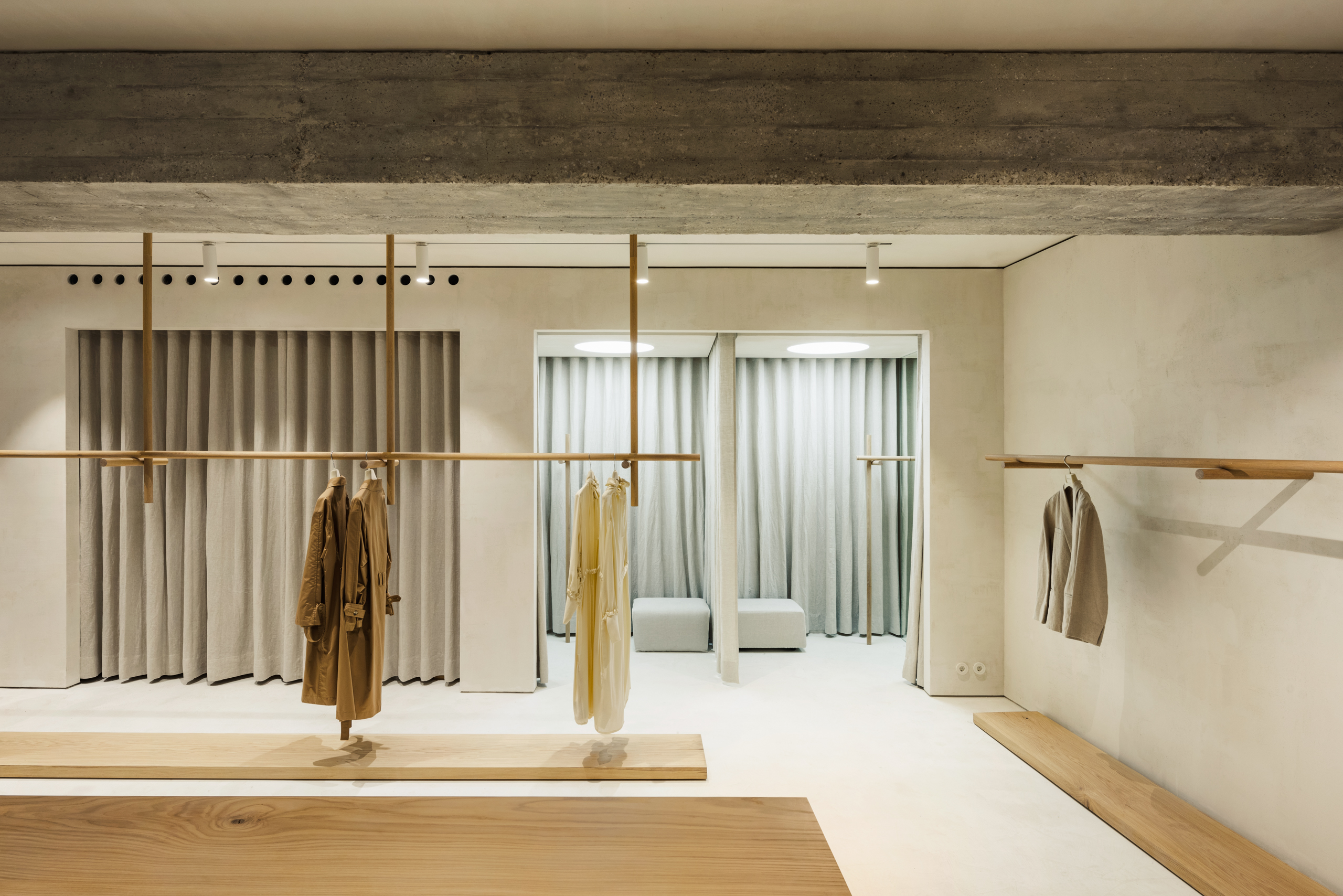 Navrhovať verejný obchodný interiér pre konkrétnu módnu značku je istým spôsobom riskantné. Na rozdiel od iných, toto zadanie má v sebe zakódovanú ambivalenciu, ktorá neistého autora mätie. Také zadanie je totiž lákavo ľahké a súčasne mimoriadne náročné. Na jednej strane ako na tanieri ponúka dostatok impulzov, ktoré odevná značka reprezentuje. Architekt sa nimi môže dosýta inšpirovať a pretaviť ich do vlastnej interiérovej interpretácie. Na druhej strane však v sebe musí utlmiť „třeštícího“ autora: Najdôležitejšie sú odevy a interiér im za žiadnych okolností nesmie konkurovať svojou nástojčivosťou. Naopak, mal by ich supremáciu zvýrazňovať a ako neviditeľná „podšívka“ rezonovať s ich dizajnovými hodnotami. Lenže ako, keď sa vystavený obsah nepredvídateľne obmieňa s ustavičným prúdom módnych sezón? V tom spočíva osudová pominuteľnosť interiérového žánru; zvládnuť tvorbu butiku chce kombináciu nadhľadu, skúseností a pokory. Jedným, druhým i tretím oplýva bratislavský architekt Martin Skoček (1984) v dostatočnej miere.