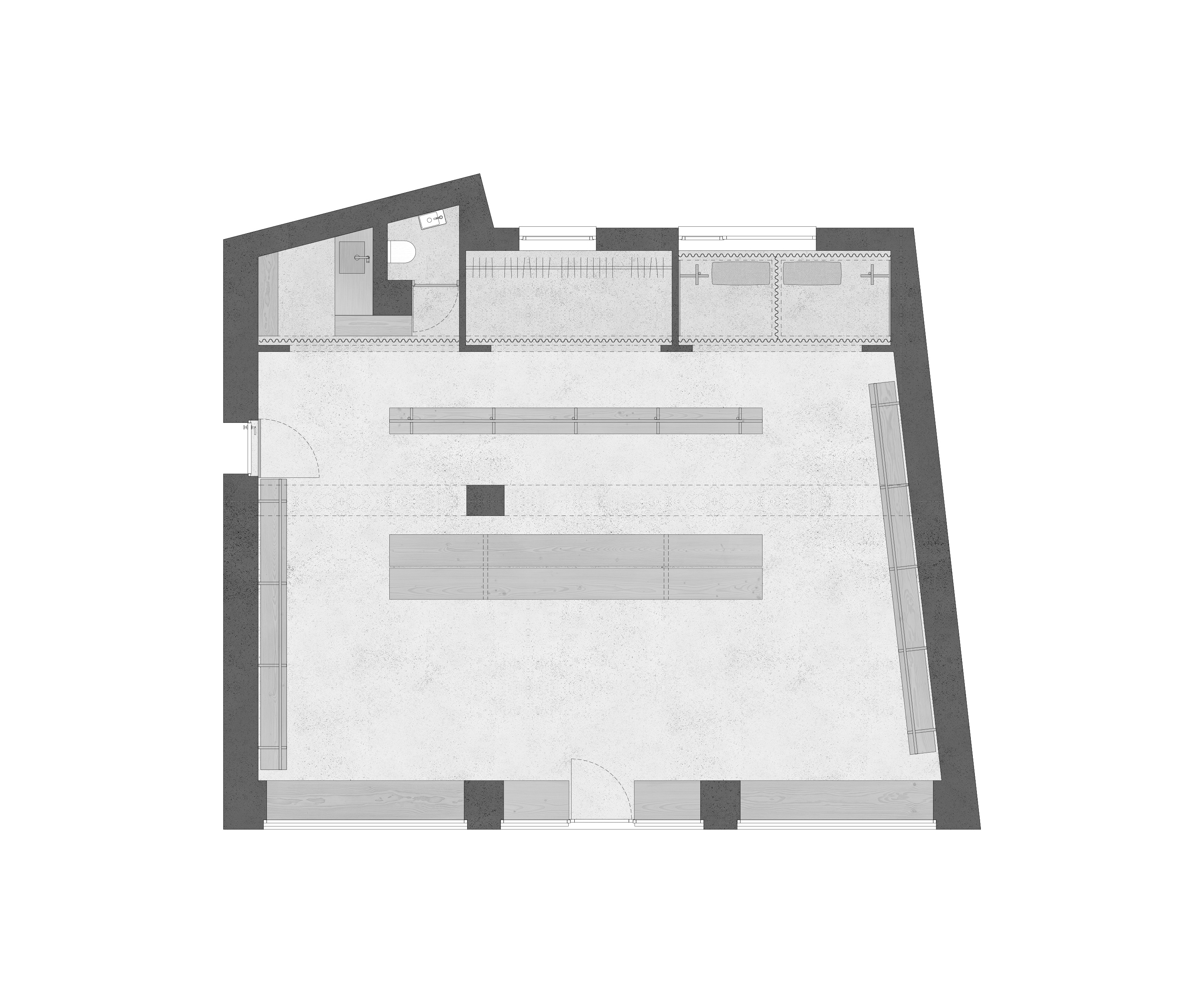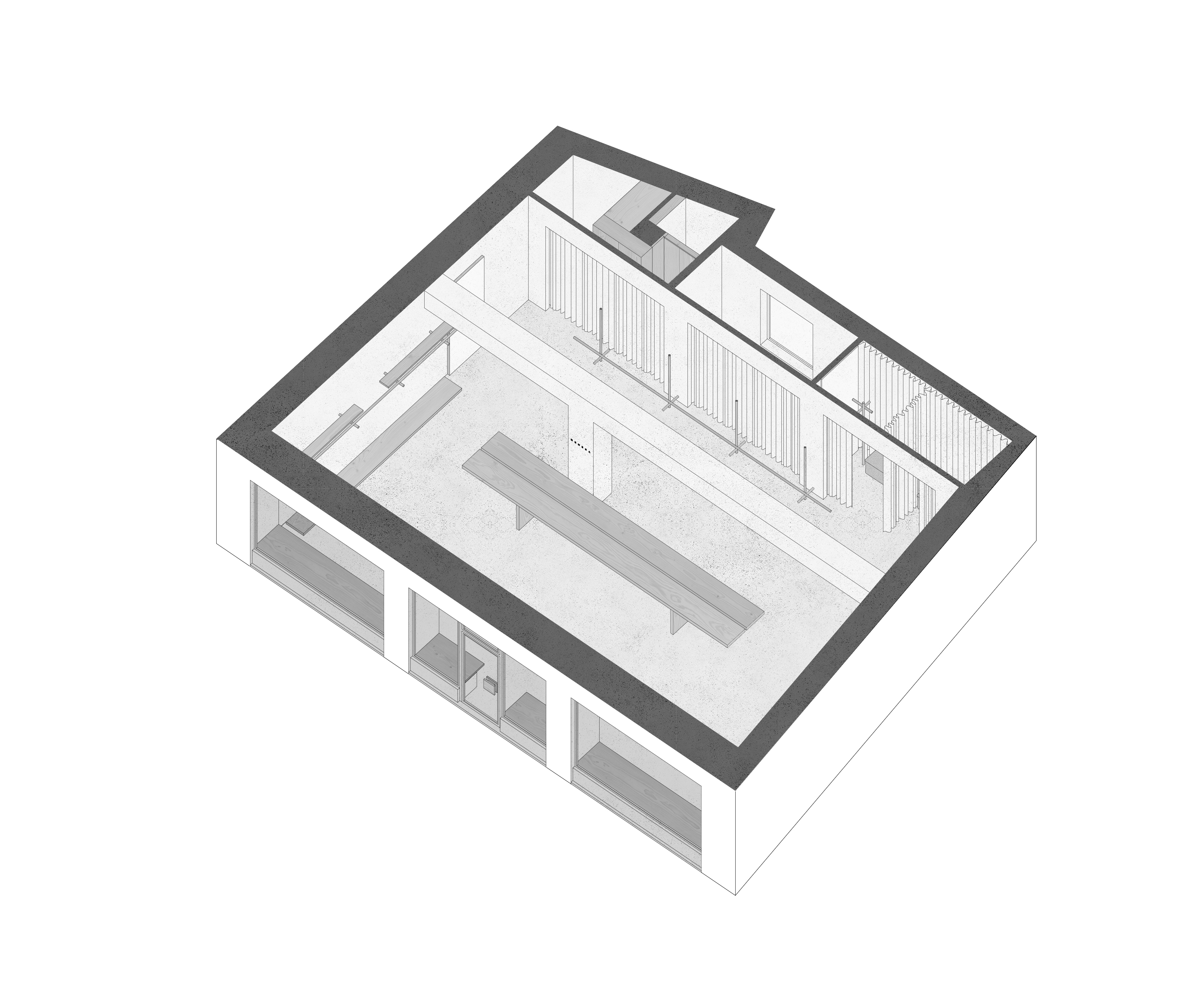 I v nábytku, ktorým vyplnil Martin priestorovú pustatinu, sa zračí poctivá stolárska esencia dotiahnutá do funkčnej krajnosti. Zrejme nezámerne a vlastnou cestou sa autor – tentoraz z pozície dizajnéra – prepracoval k podobným výsledkom ako americkí Amiši. Vešiaky na šaty, obnažené nezdobné plinty ako fošne priložené k stenám a šesťmetrový pult (statný stôl evokujúci zariadenie refektárov) dostali archetypálne obrysy zhotovené z masívneho dubového dreva (v slovenskej dielni Ajnfach). Amišská estetika odráža podobnú východiskovú pozíciu určenú reduktívnym názorom autora. Jeho posadnutosť detailom sa prejavuje aj v stolárčine: Za zmienku stojí napríklad tektonická logika pretavená do kúzelného spoja vešiakových tyčí s kruhovým prierezom. Opony prezliekacích kabín a zázemia sú ďalším vyjadrením estetického asketizmu a utilitarizmu: Na zadnej scéne predajne vytvárajú zmäkčujúci textúrny ornament a aj ony, ako ostatne všetko výrazivo použité v interiéri, prispievajú k zduchovnenej atmosfére.