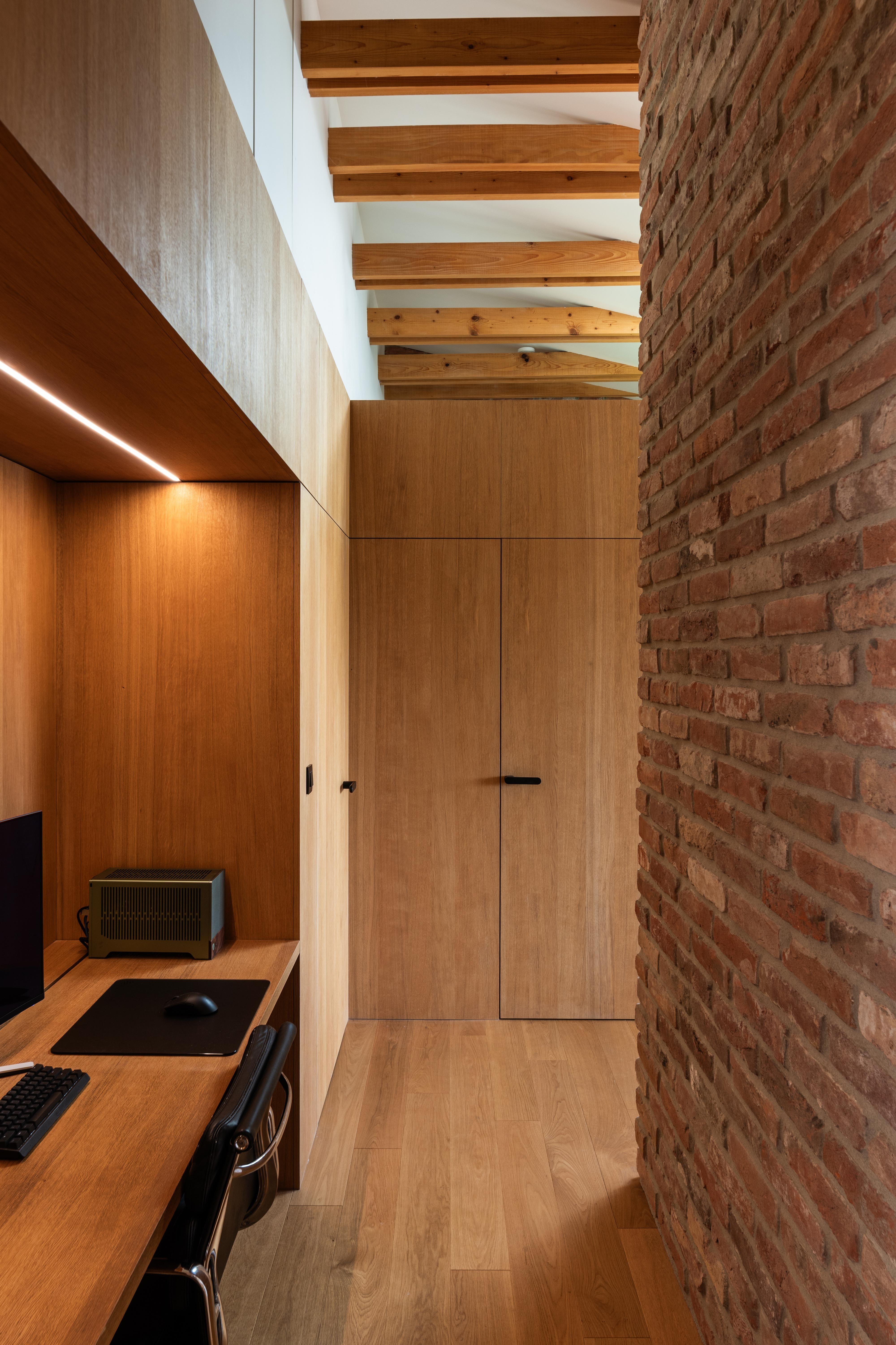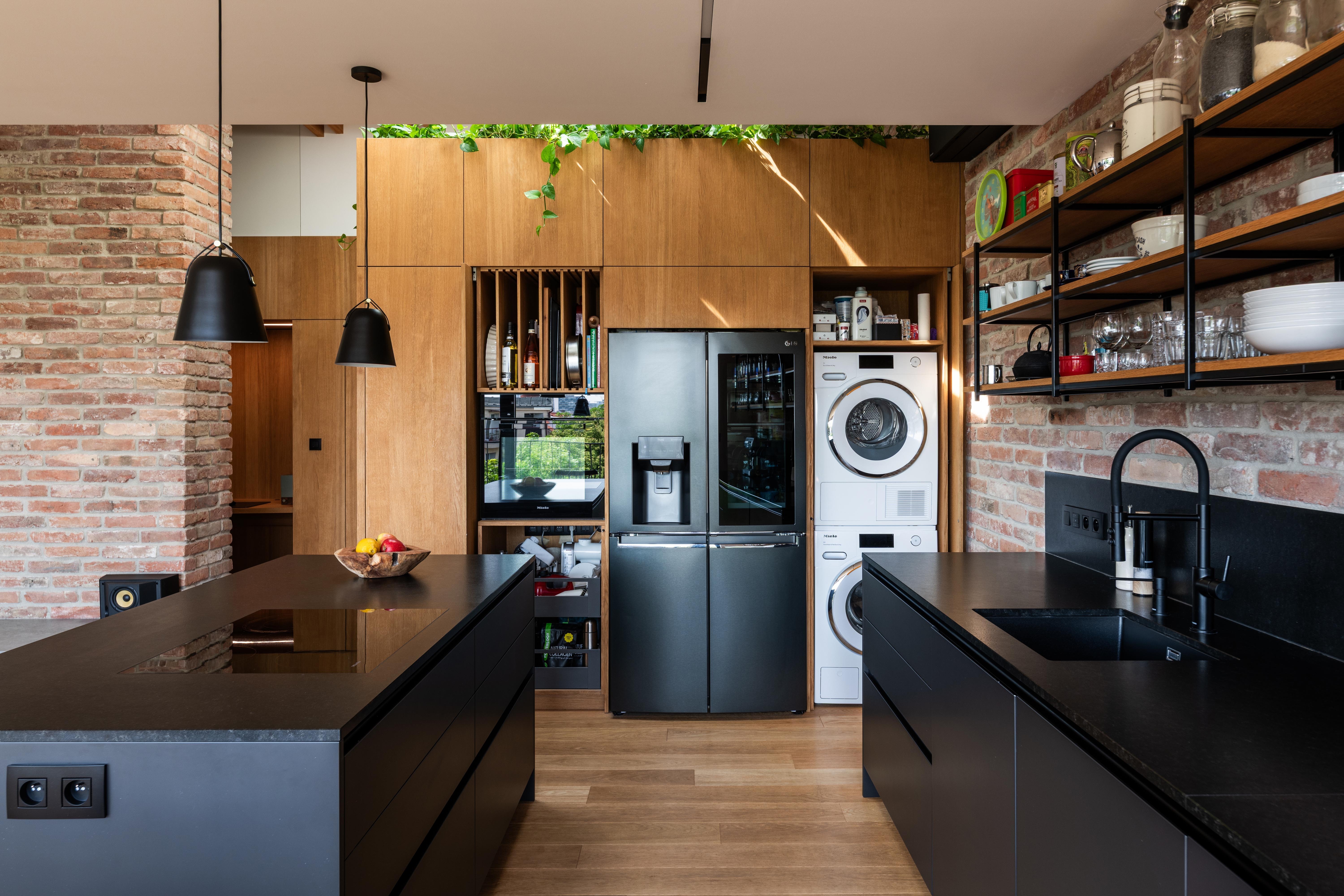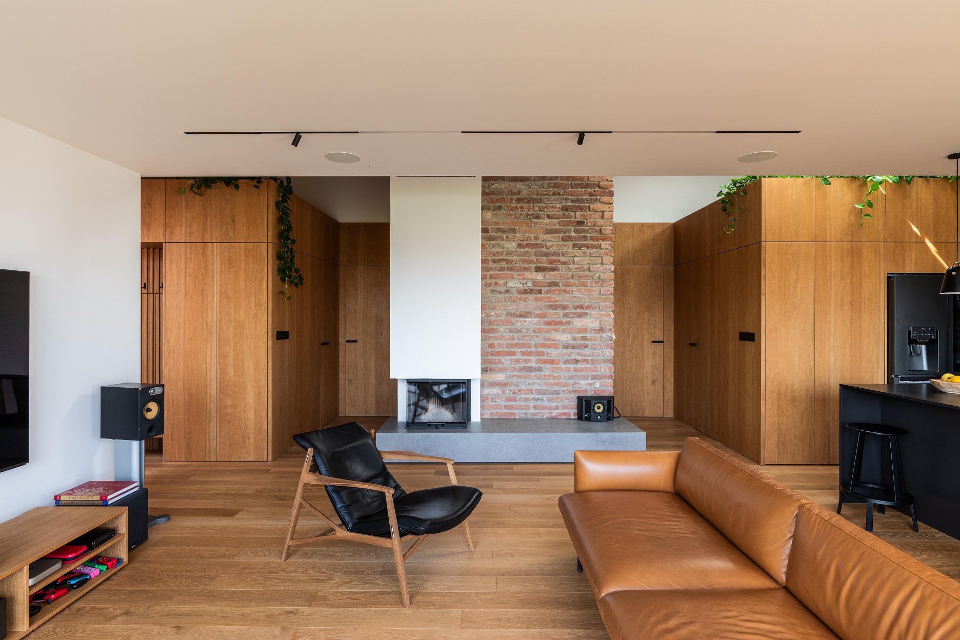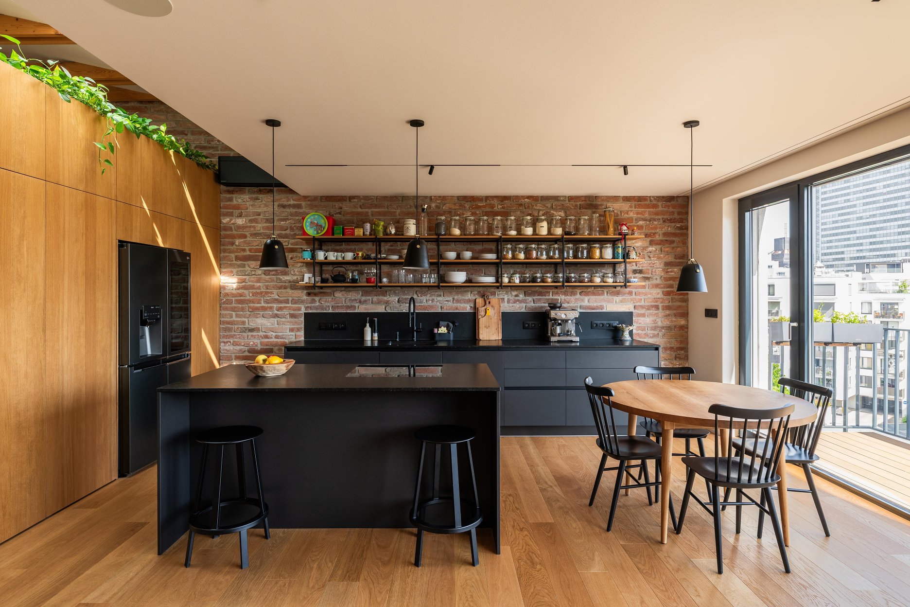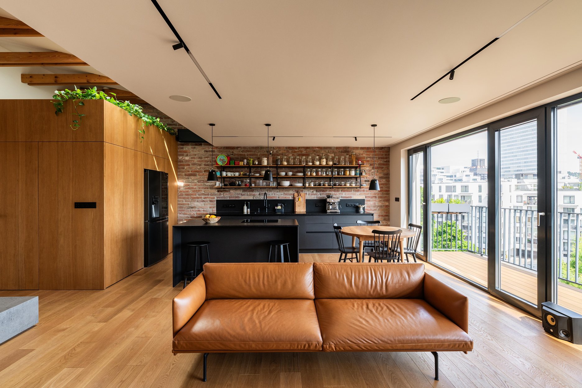Materiálové riešenie kombinuje dubové drevo, biele povrchy omietok a zabudovaného nábytku a tehlové murivo s akcentmi z umelého kameňa a antracitovými solitérmi. Atypické nábytkové moduly sú doplnené kvalitným mobiliárom renomovaných značiek. V byte je integrovaná inteligentná elektroinštalácia.