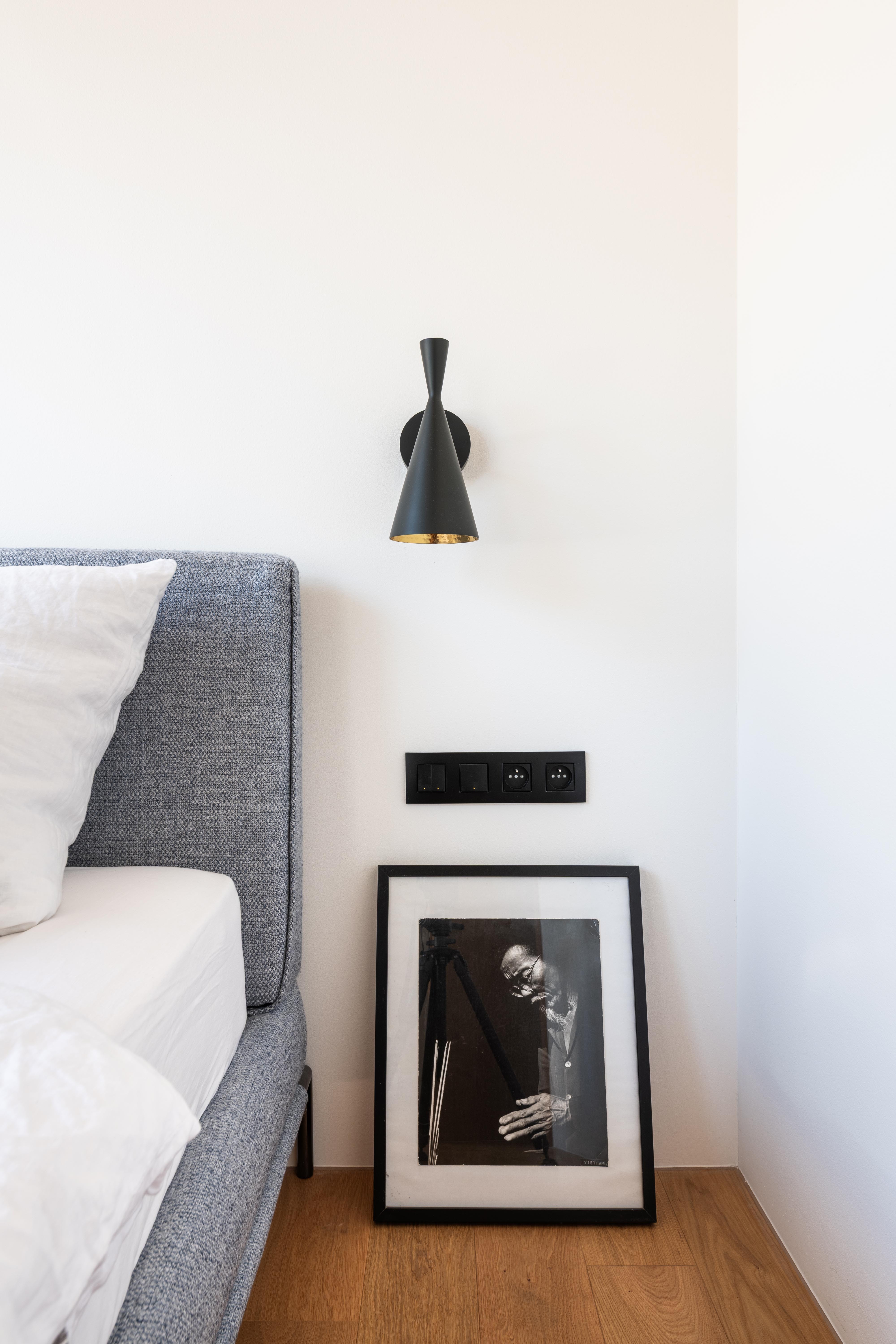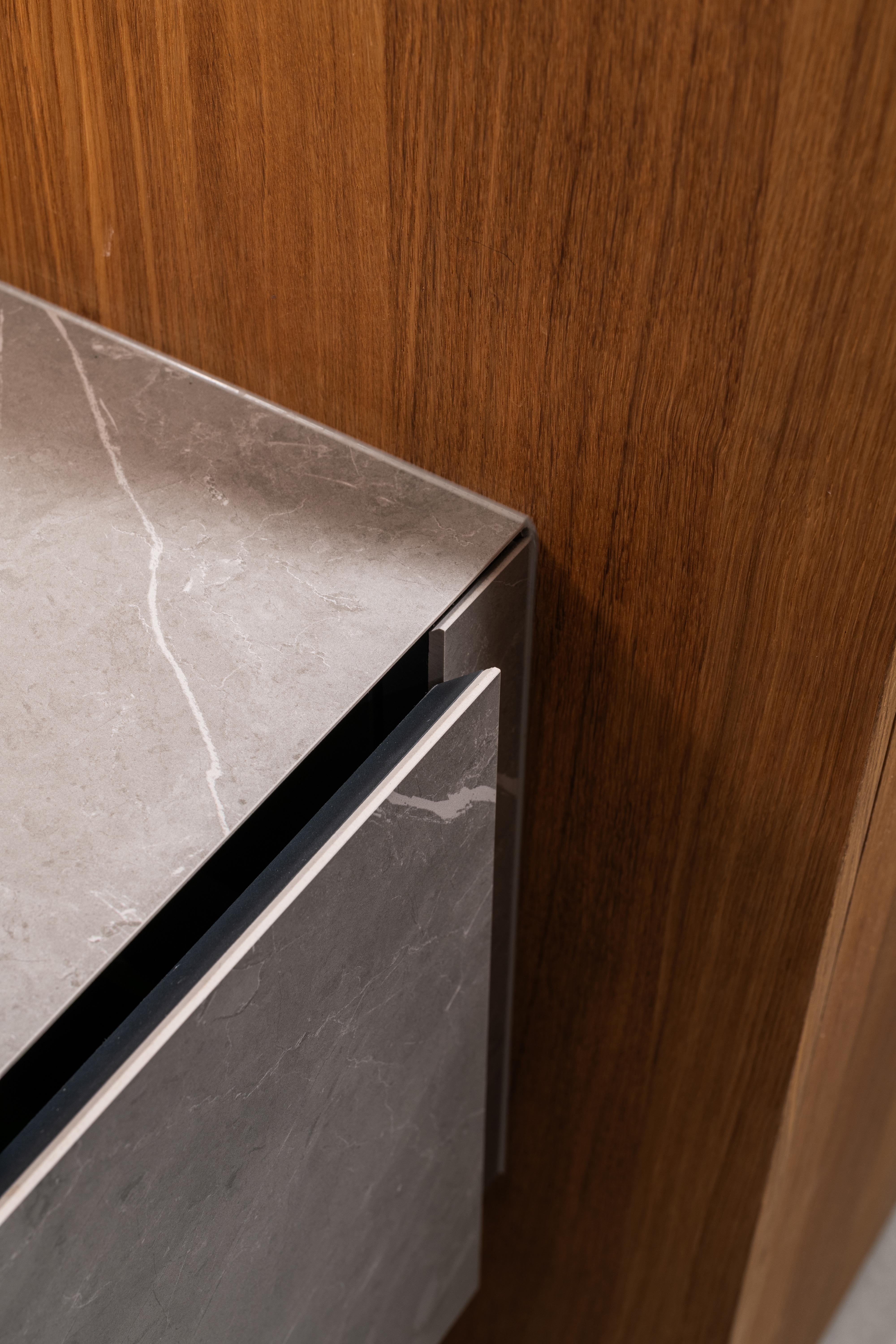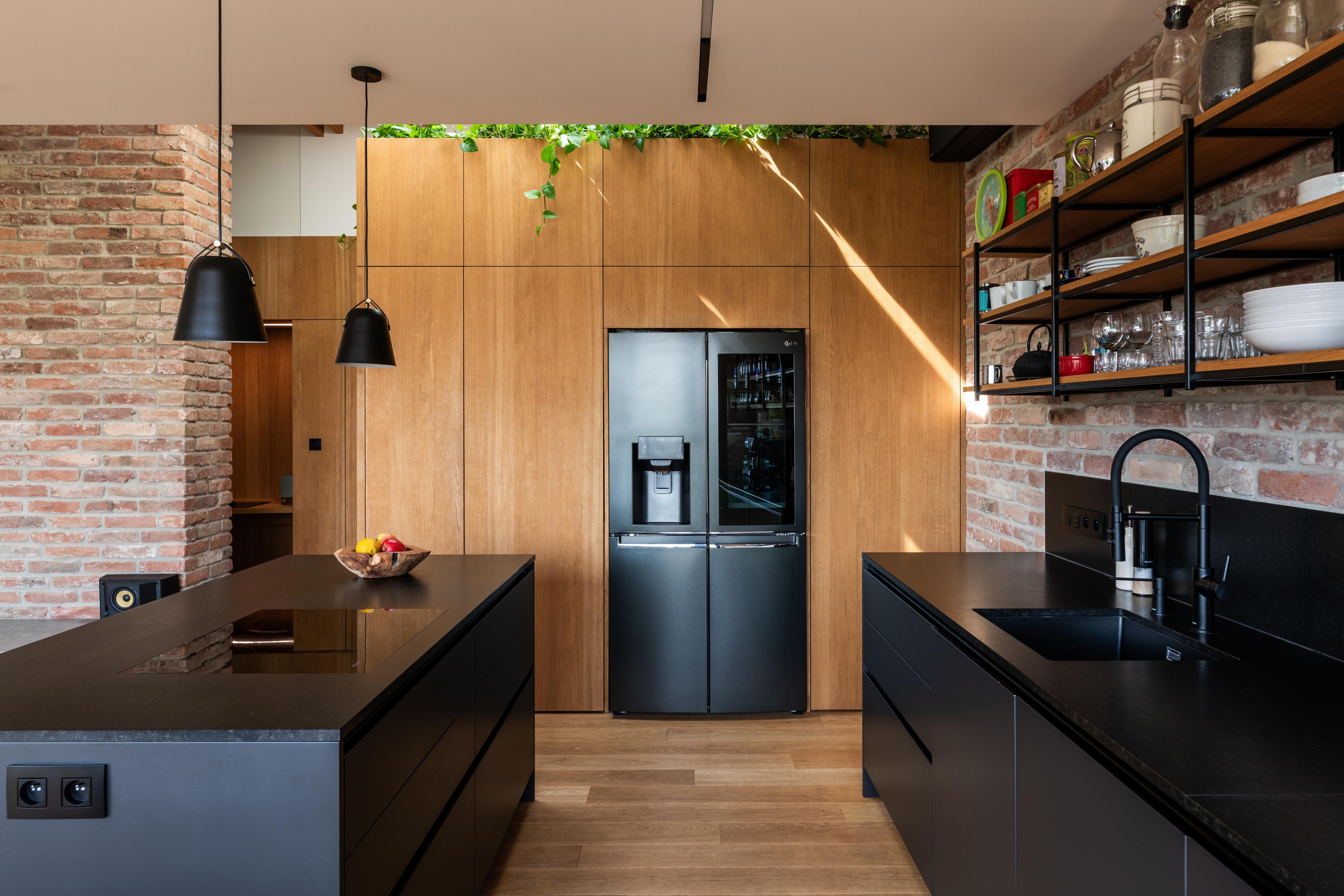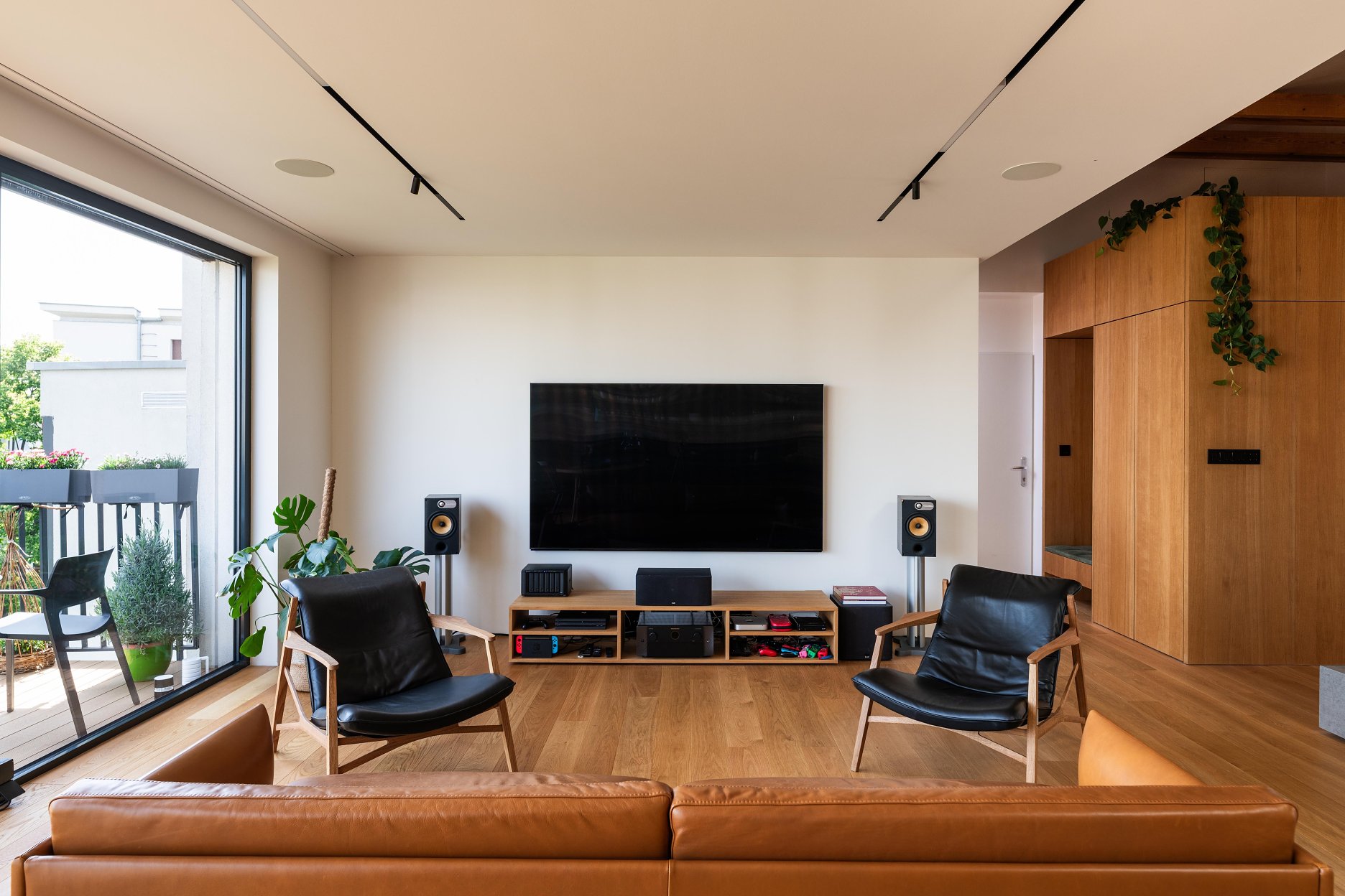 Materiálové riešenie kombinuje dubové drevo, biele povrchy omietok a zabudovaného nábytku a tehlové murivo s akcentmi z umelého kameňa a antracitovými solitérmi. Atypické nábytkové moduly sú doplnené kvalitným mobiliárom renomovaných značiek. V byte je integrovaná inteligentná elektroinštalácia.