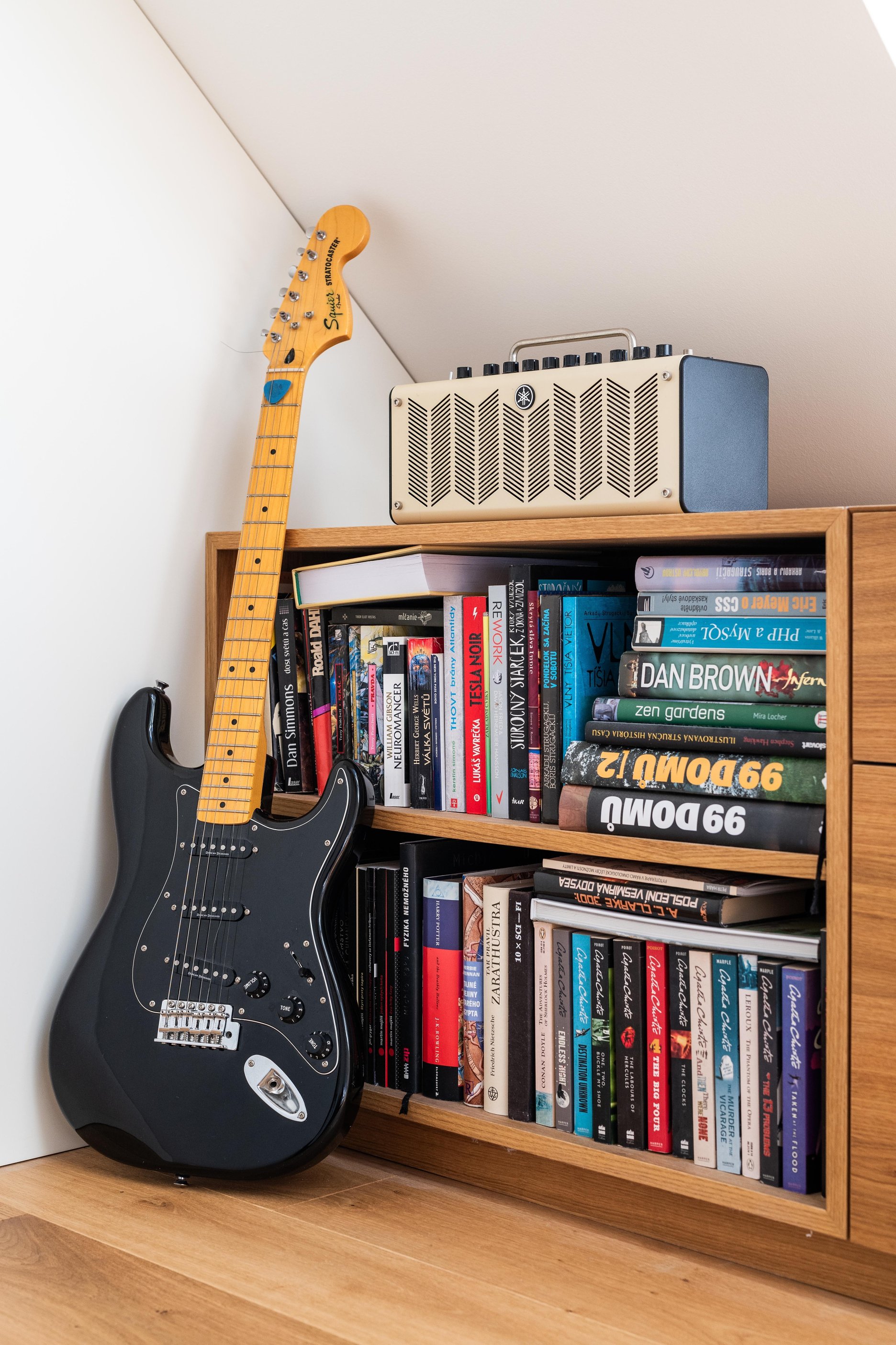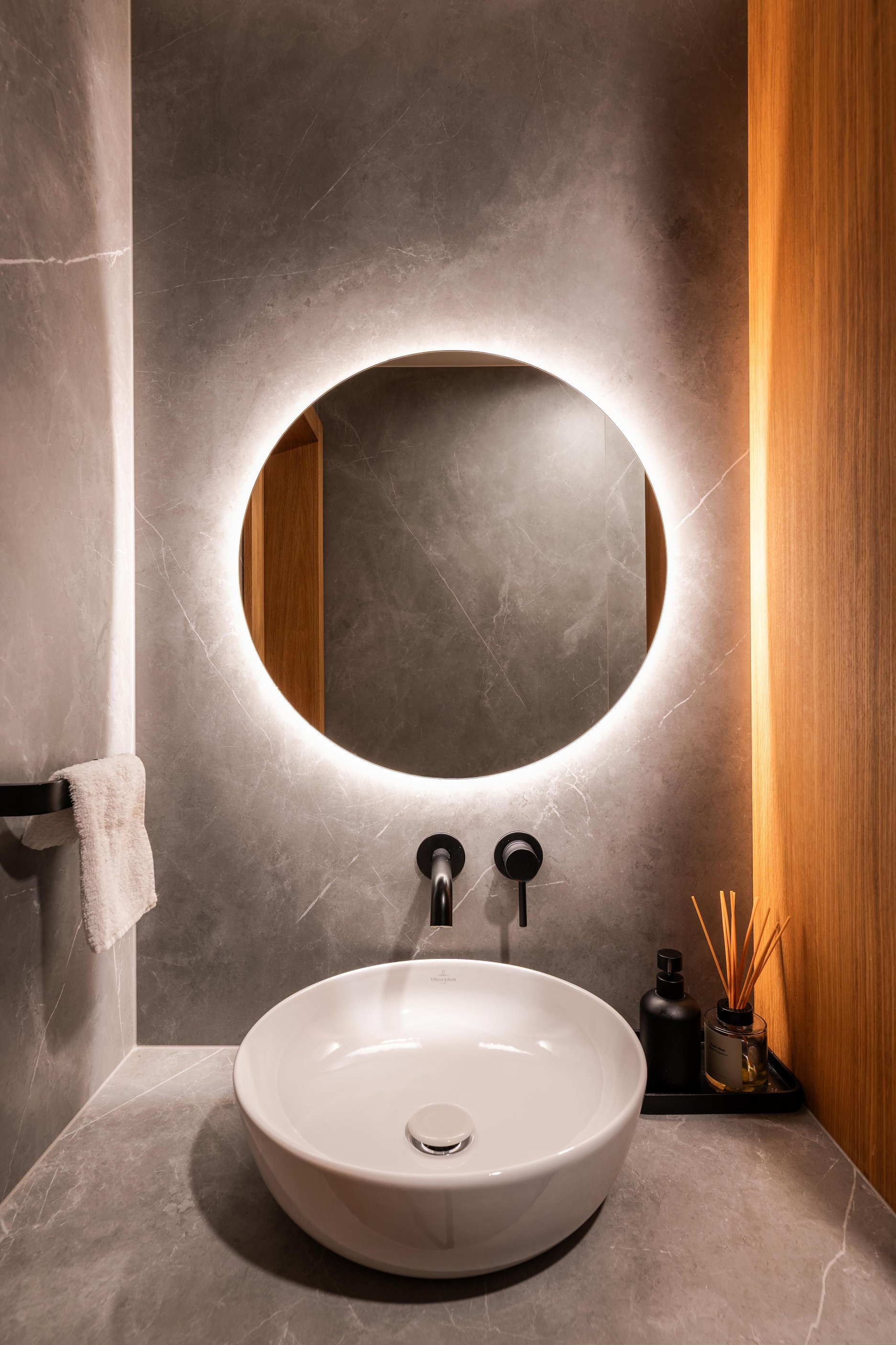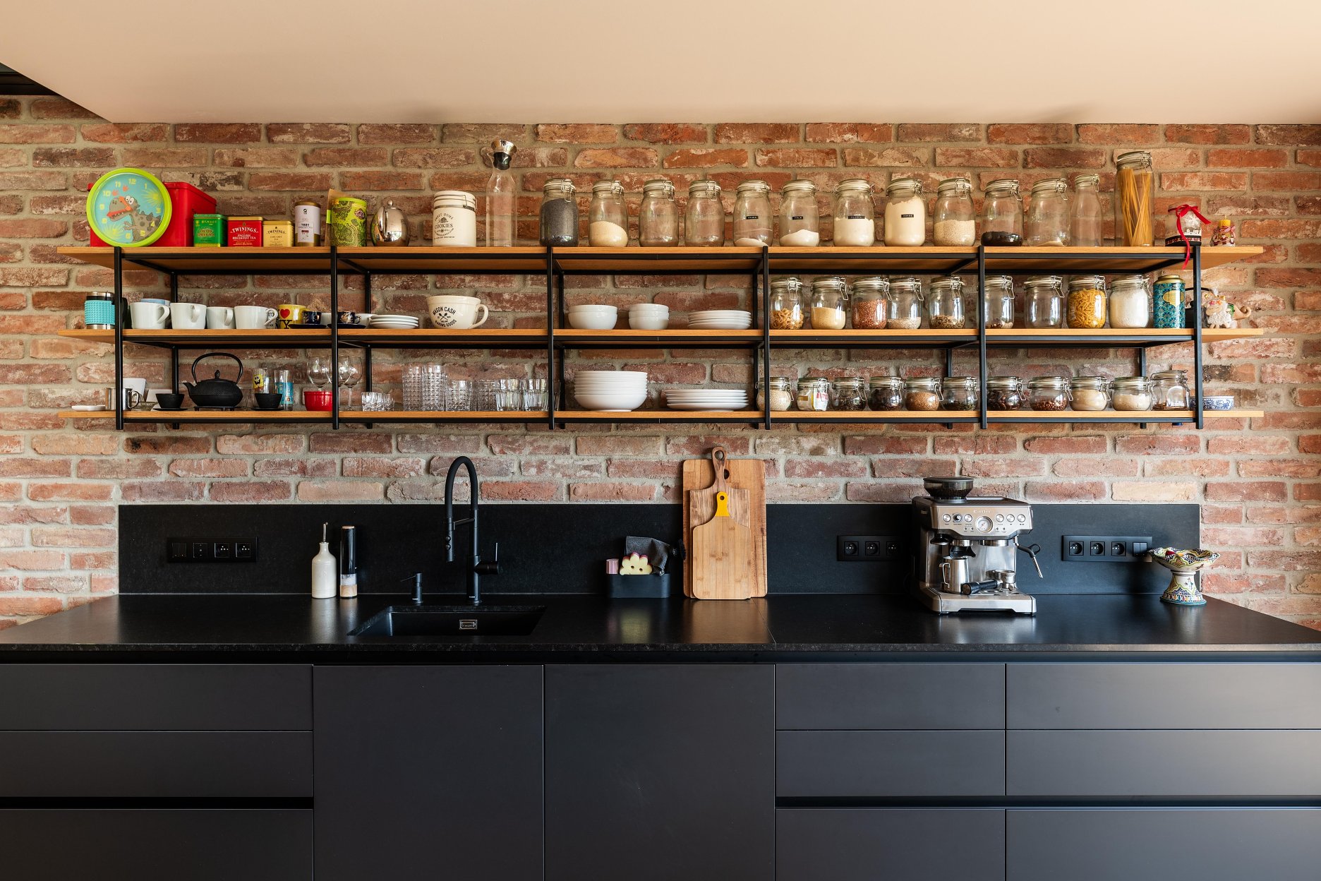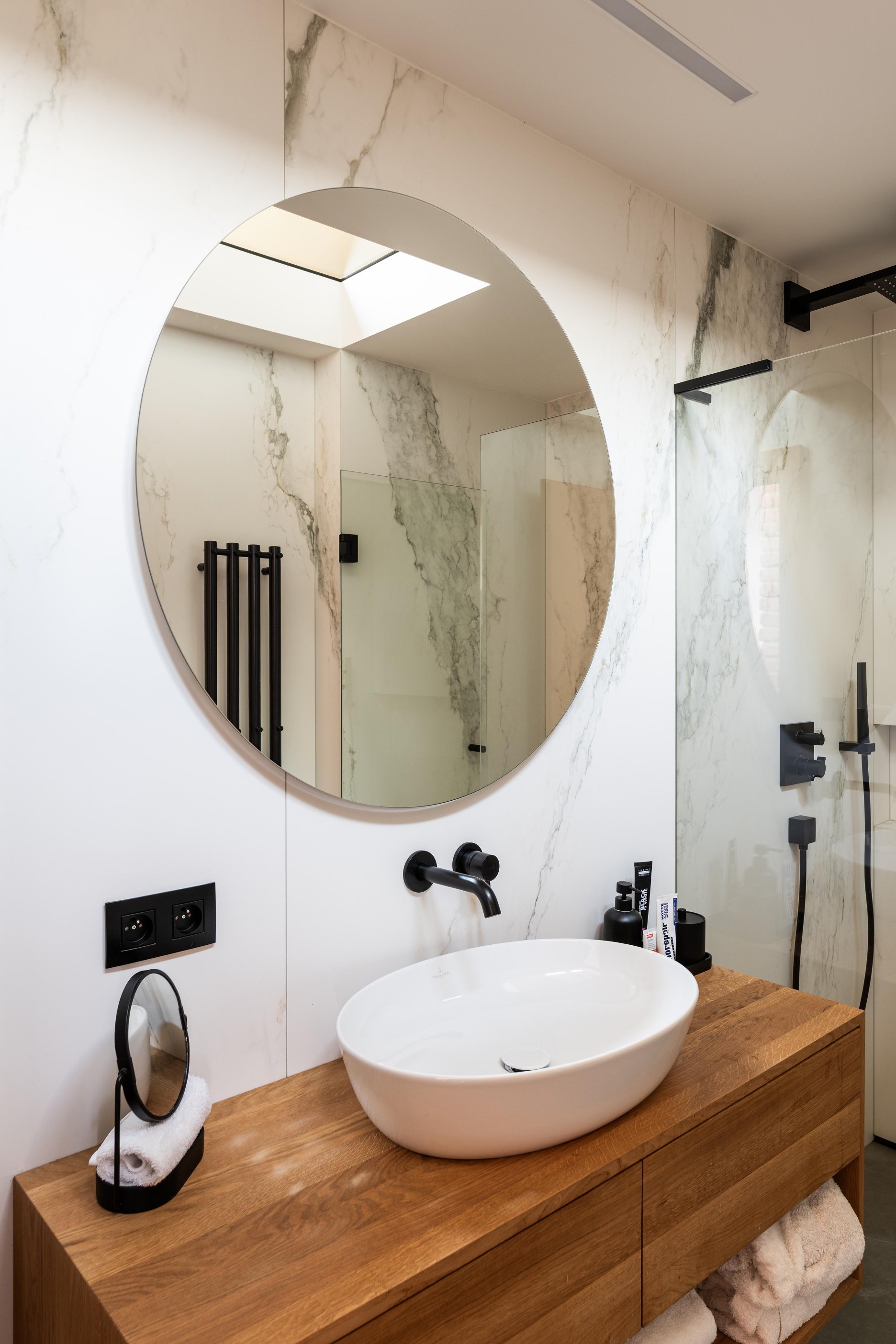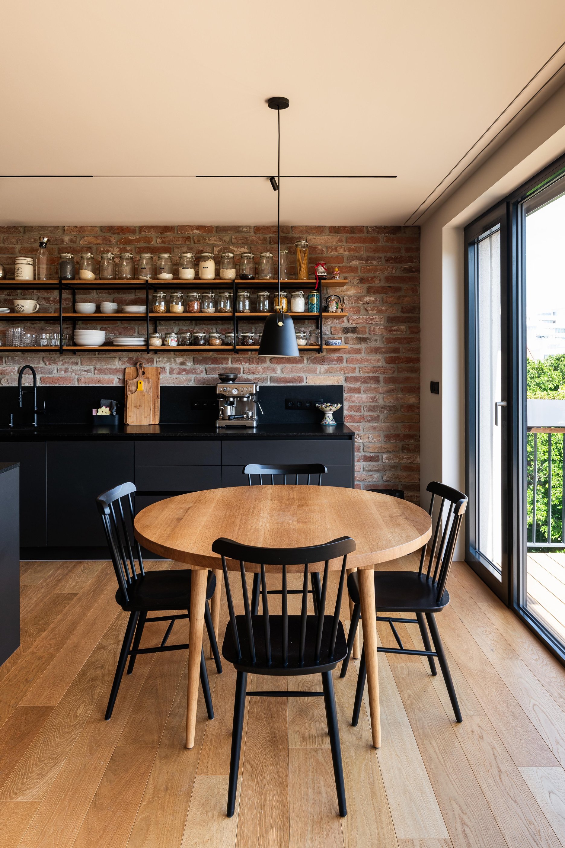 Materiálové riešenie kombinuje dubové drevo, biele povrchy omietok a zabudovaného nábytku a tehlové murivo s akcentmi z umelého kameňa a antracitovými solitérmi. Atypické nábytkové moduly sú doplnené kvalitným mobiliárom renomovaných značiek. V byte je integrovaná inteligentná elektroinštalácia.