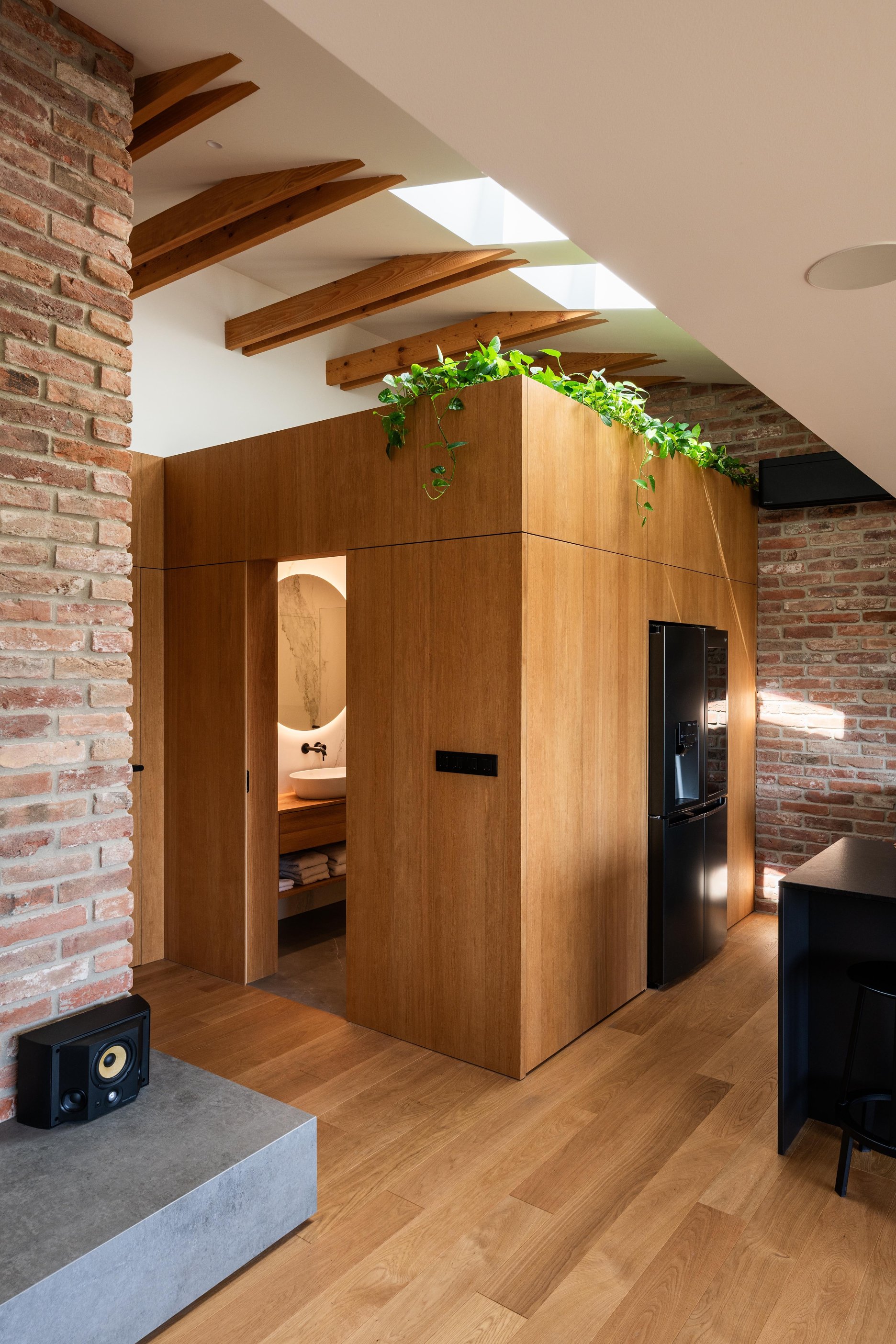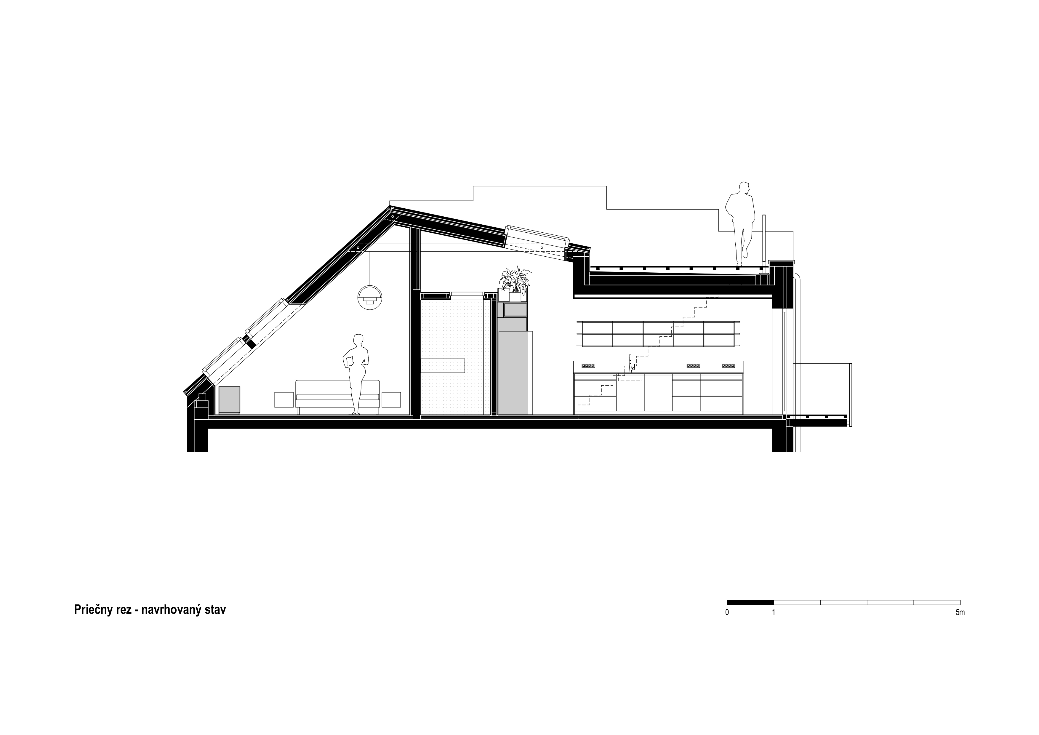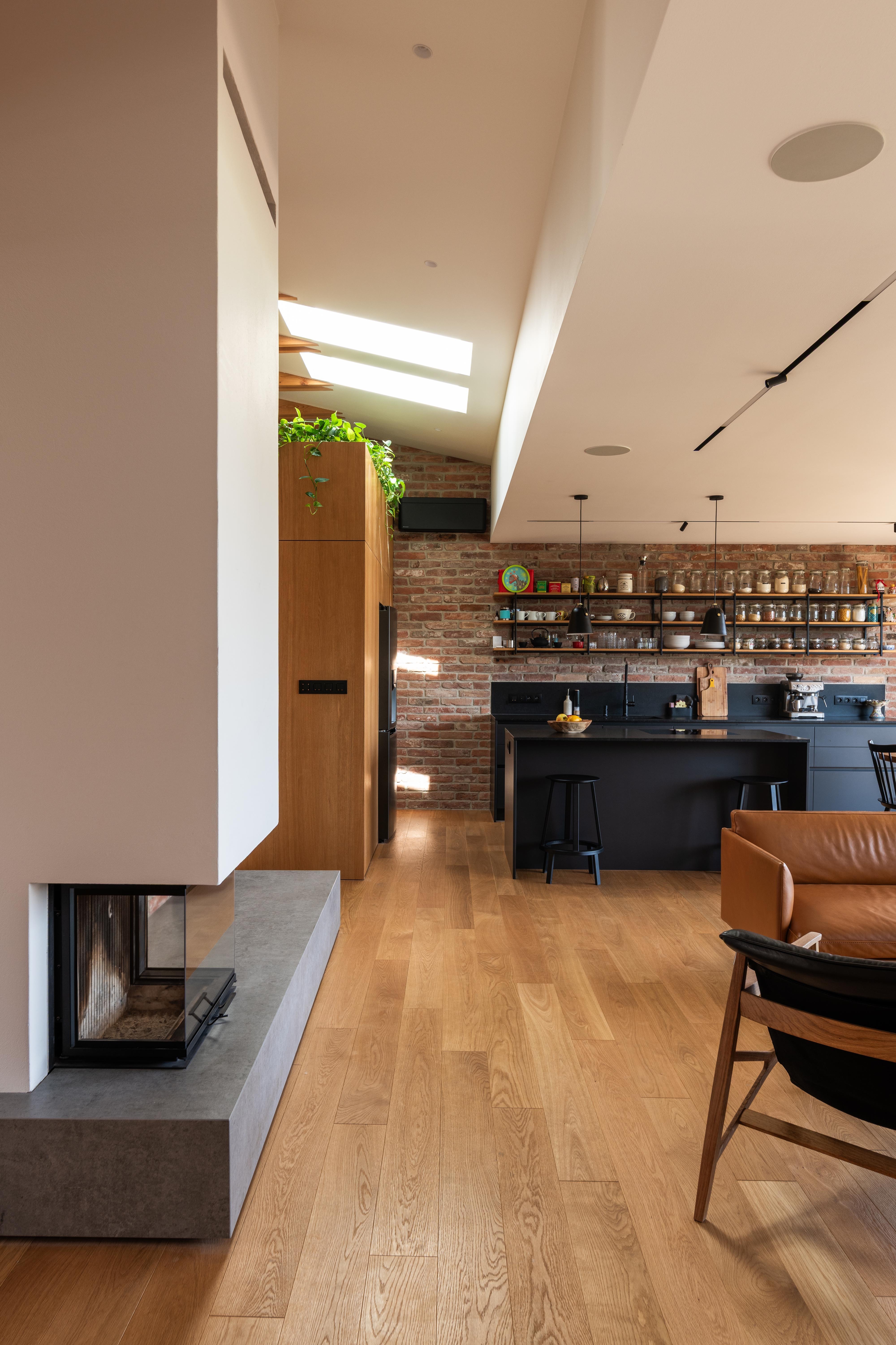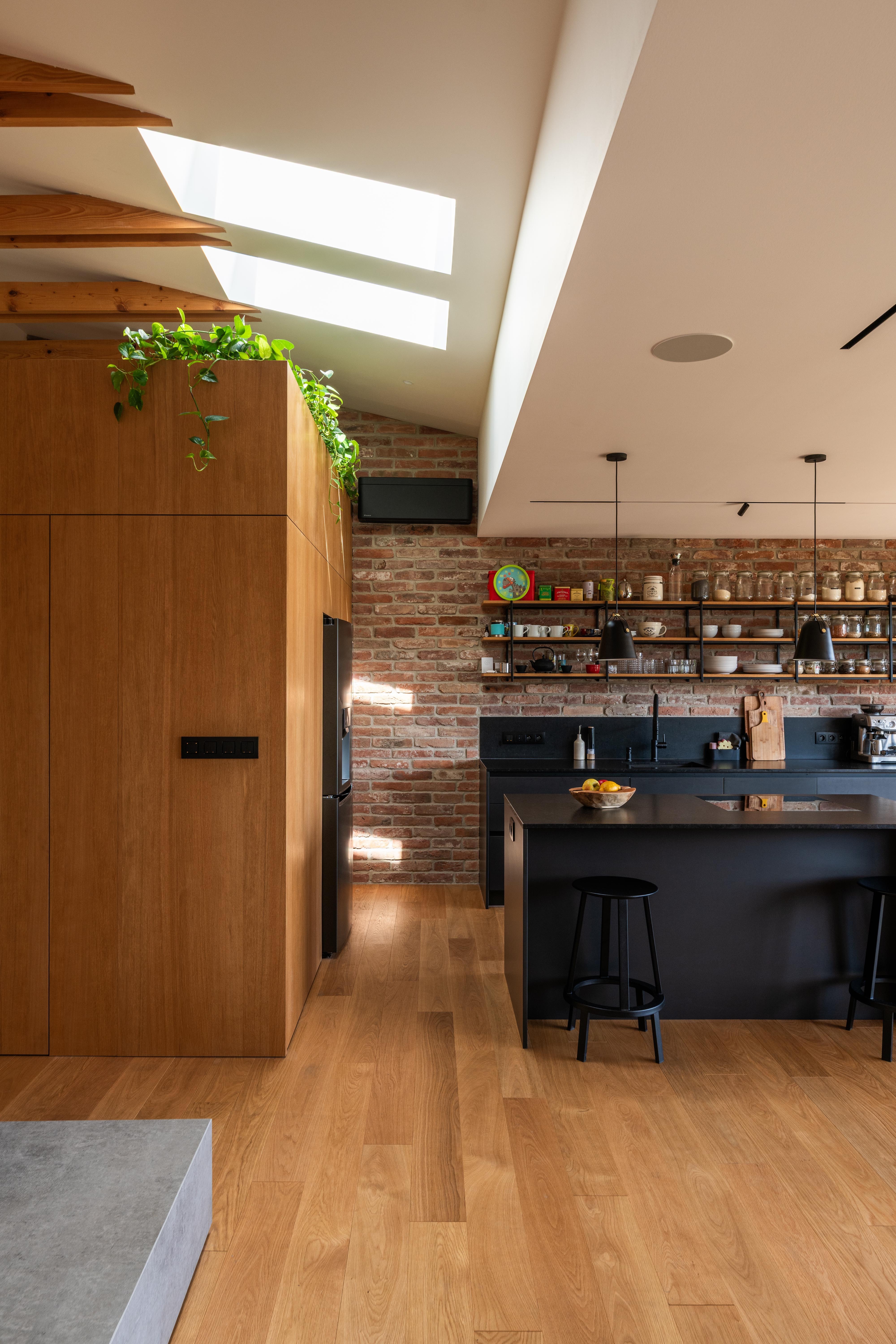 (2) Na dosiahnutie parametrov a atmosféry podkrovného bytu bolo potrebné odstrániť pôvodné sadrokartónové podhľady a odhaliť časť krovu. Železobetónový strop nad východnou časťou bytu limituje jeho svetlú výšku, ale vďaka vysokej, otvorenej centrálnej časti dostáva hlavný obytný priestor potrebný objem a optickú vzdušnosť.