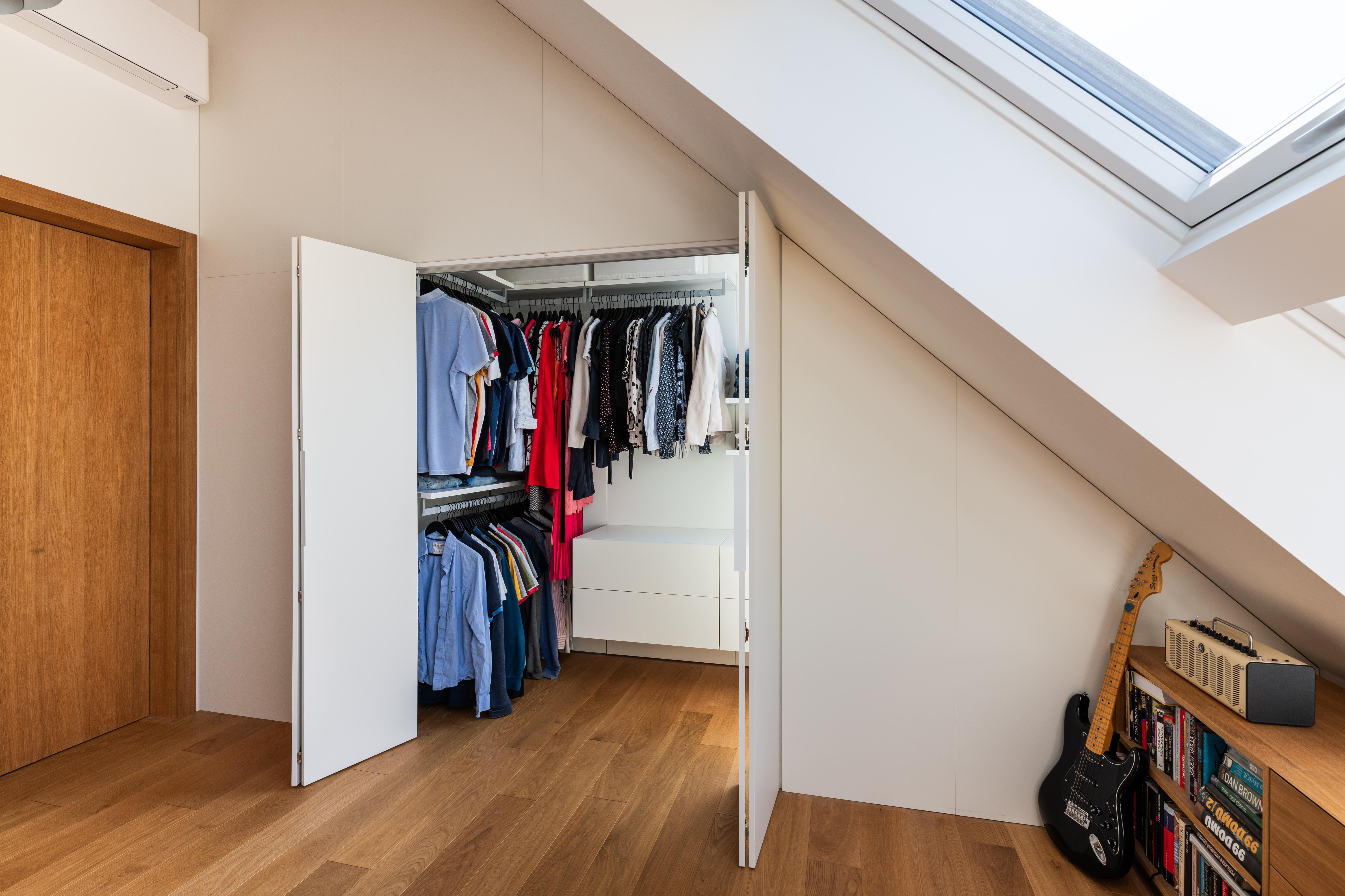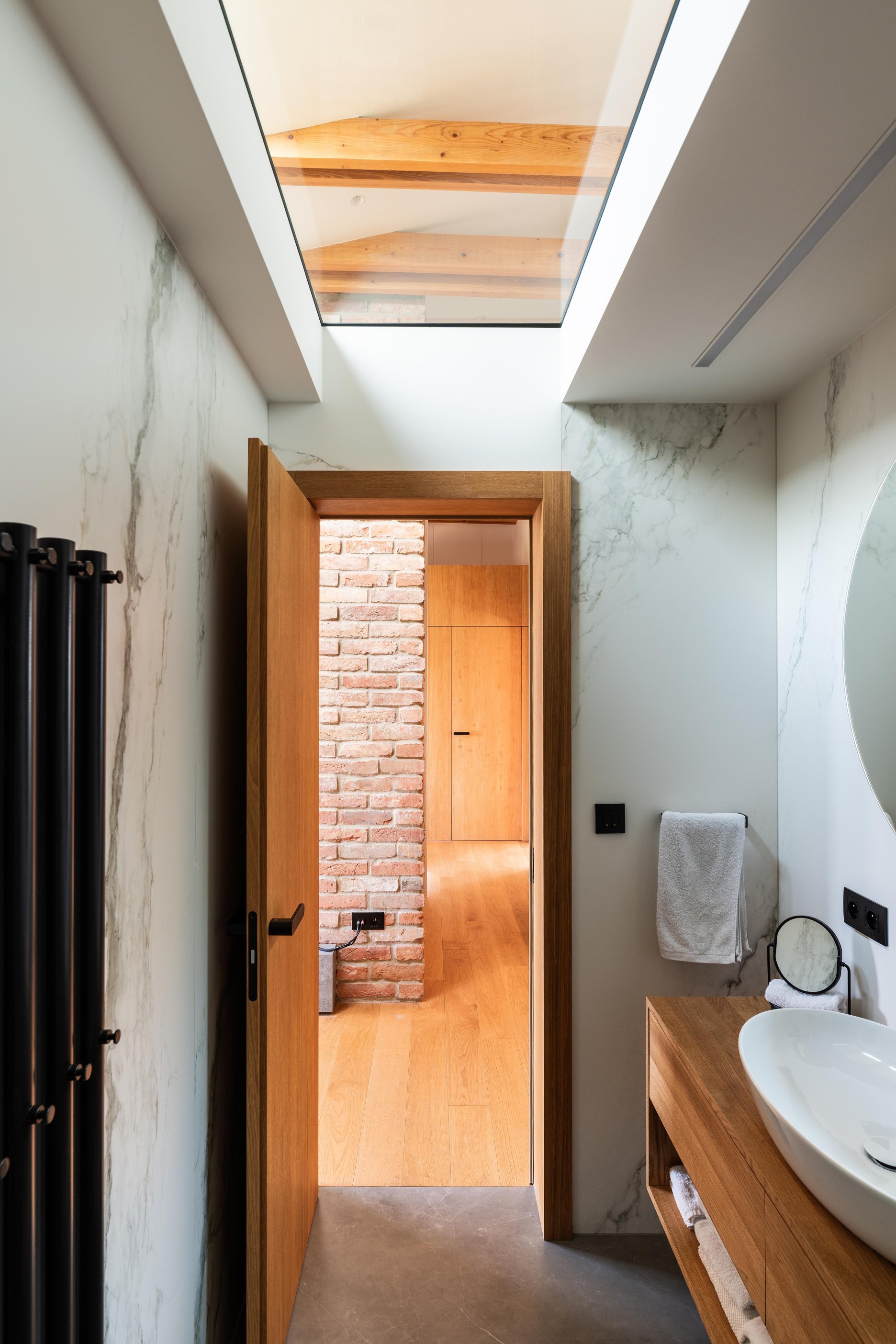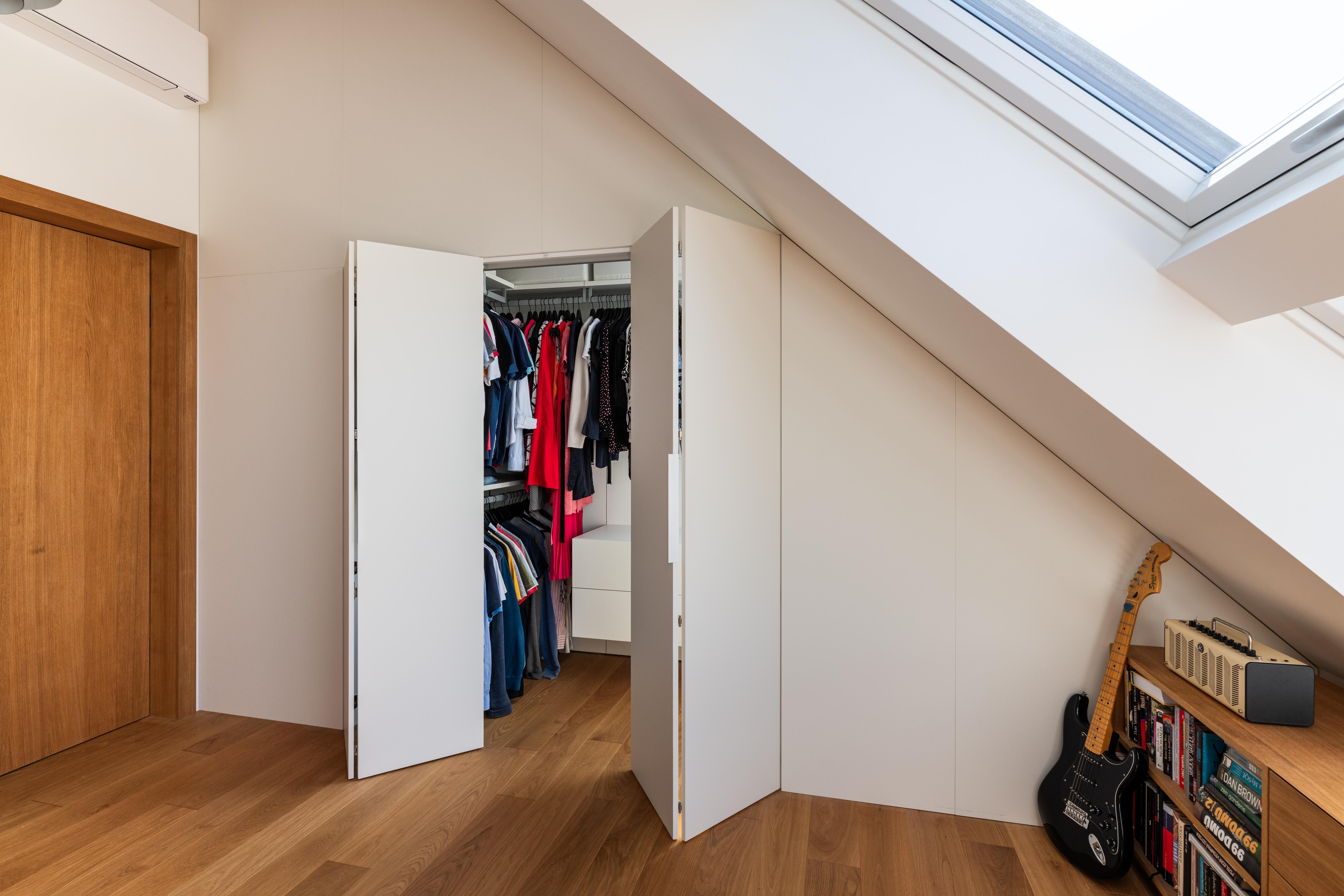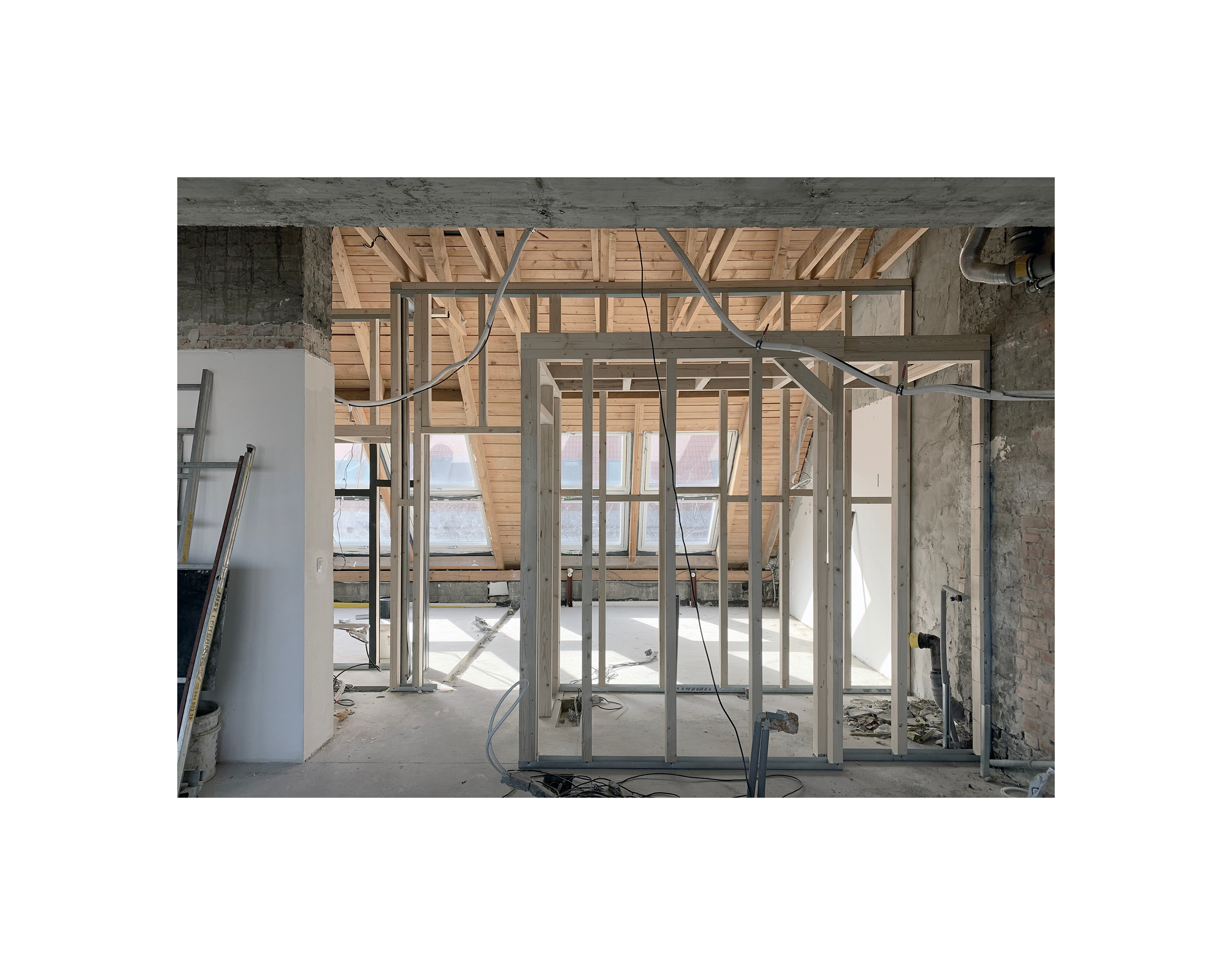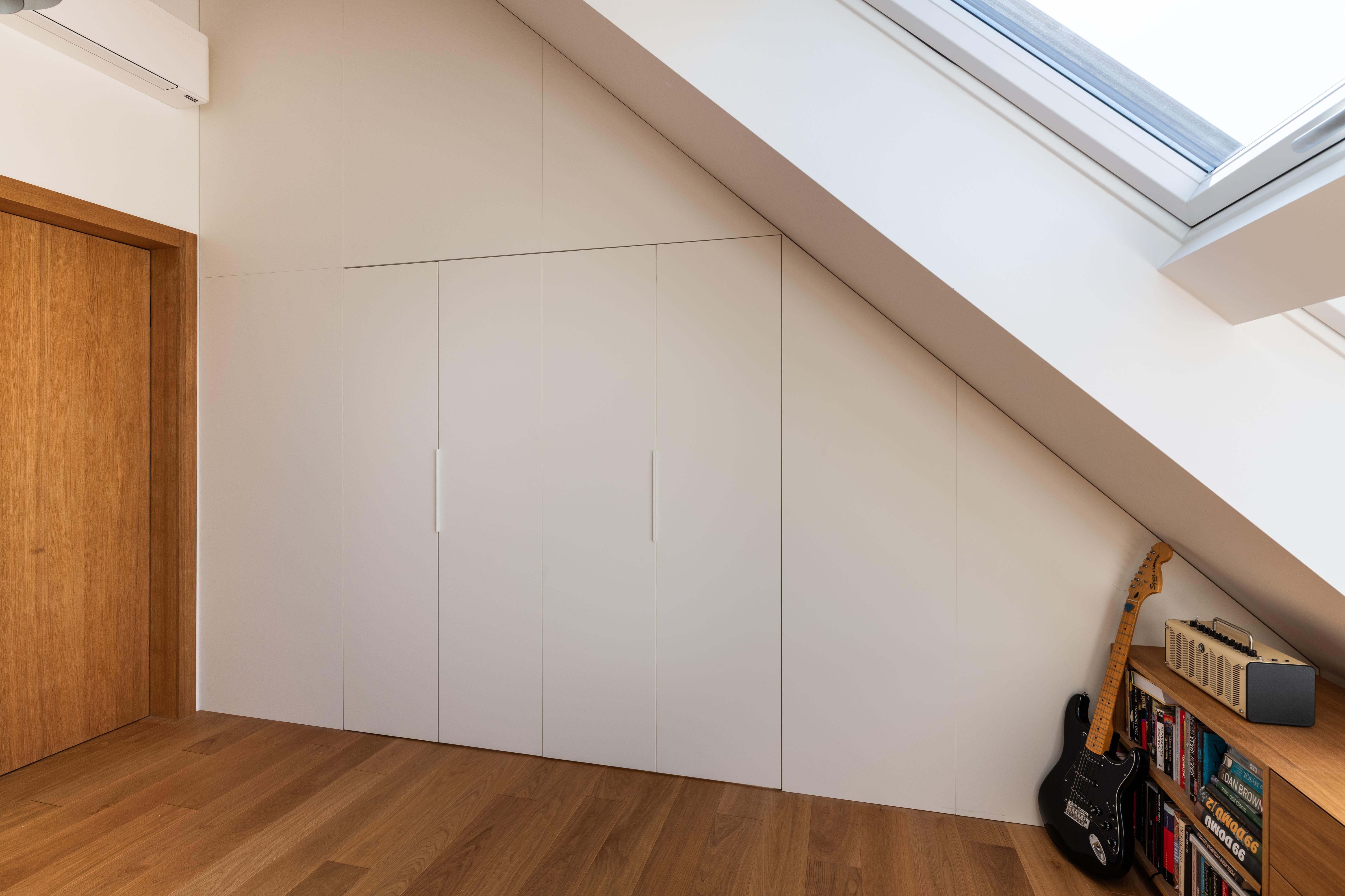 (2) Na dosiahnutie parametrov a atmosféry podkrovného bytu bolo potrebné odstrániť pôvodné sadrokartónové podhľady a odhaliť časť krovu. Železobetónový strop nad východnou časťou bytu limituje jeho svetlú výšku, ale vďaka vysokej, otvorenej centrálnej časti dostáva hlavný obytný priestor potrebný objem a optickú vzdušnosť.